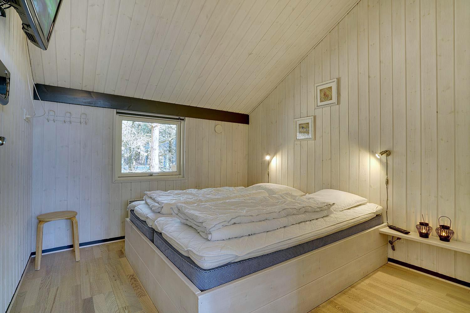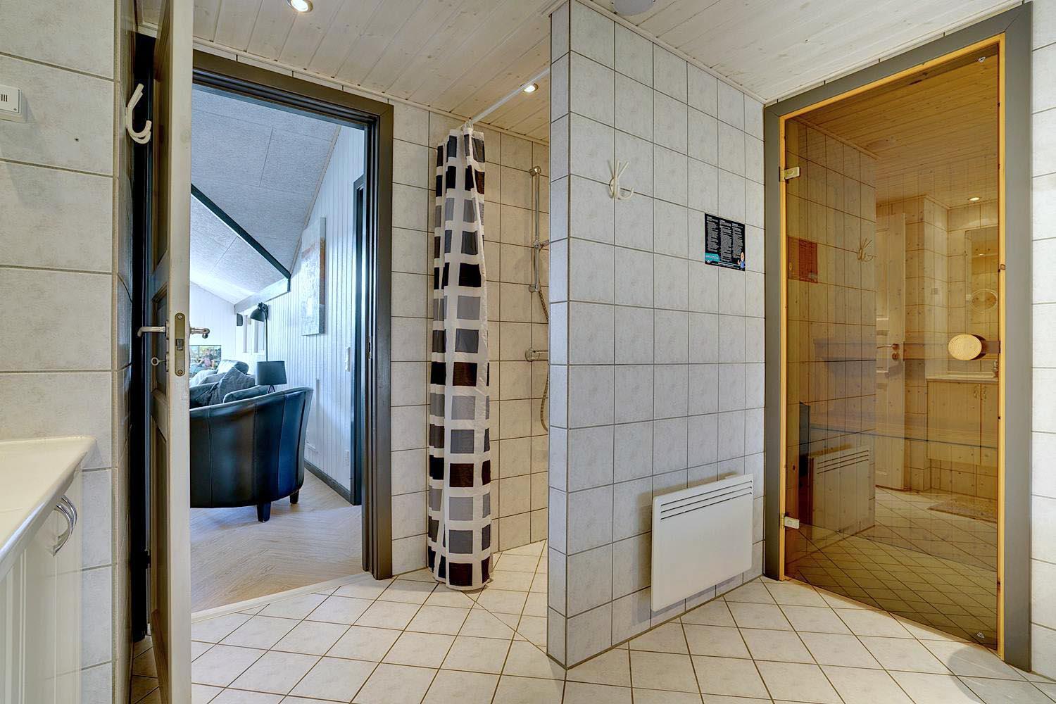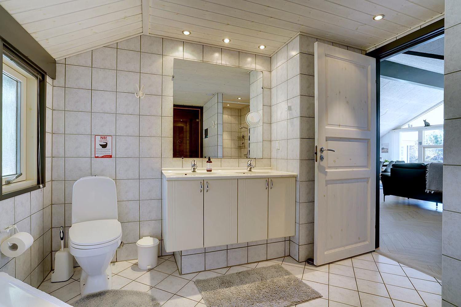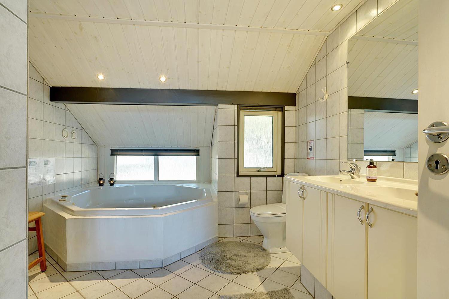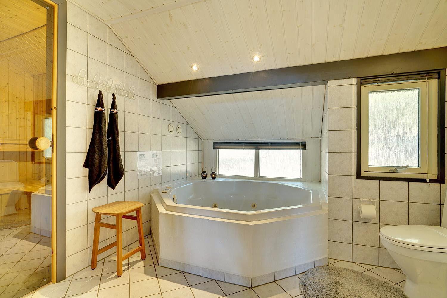 Sommerhuset har 4 soveværelser og god plads til alle. De to moderne badeværelser med gulvvarme giver ekstra komfort. I det store badeværelse kan du slappe af i den private sauna eller nyde en stund i den indendørs standvandsspa – ren wellness, helt for dig selv.