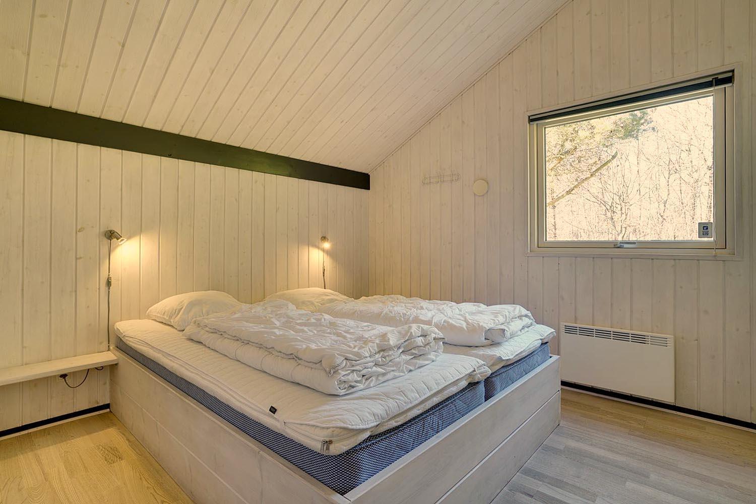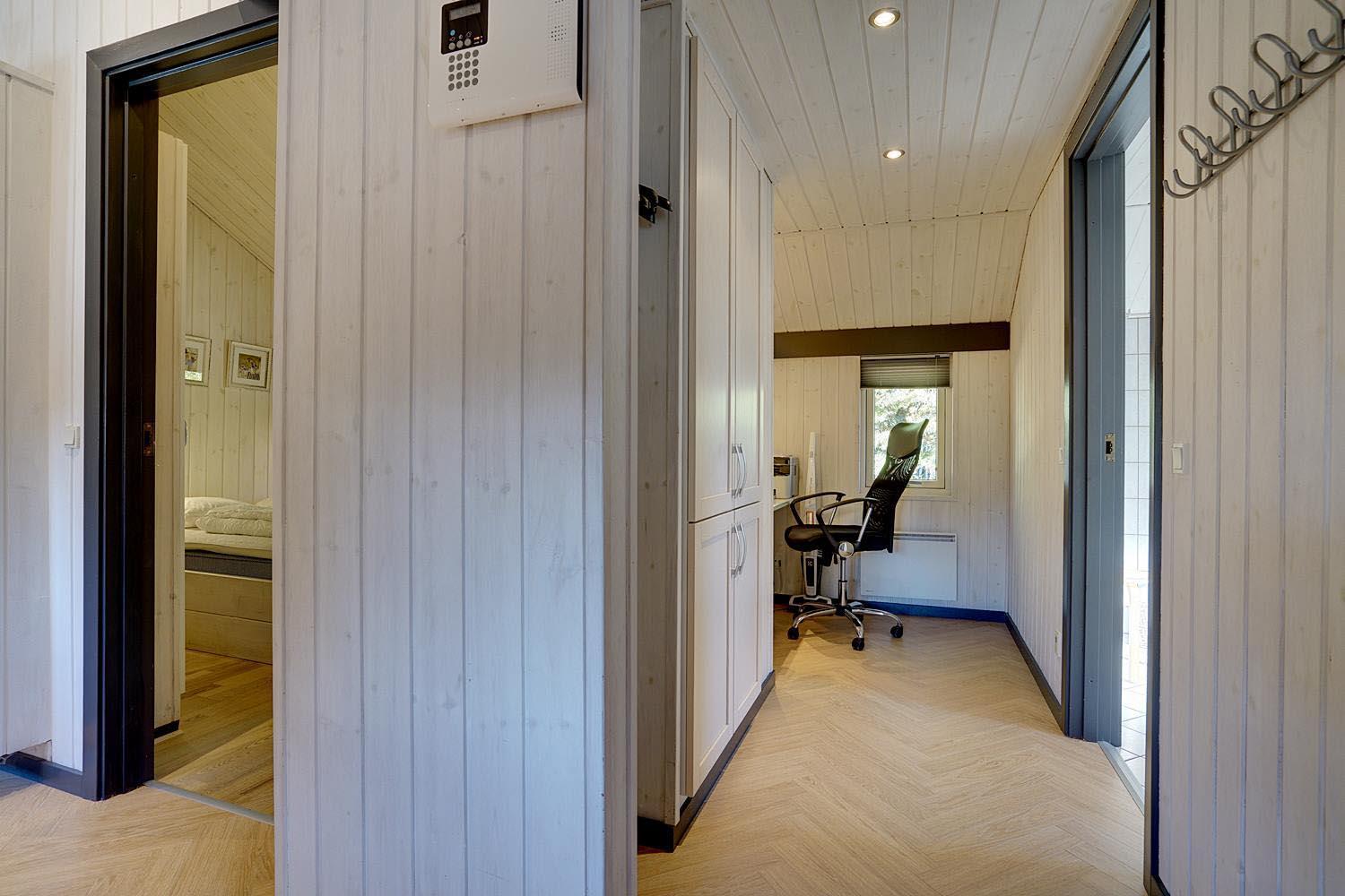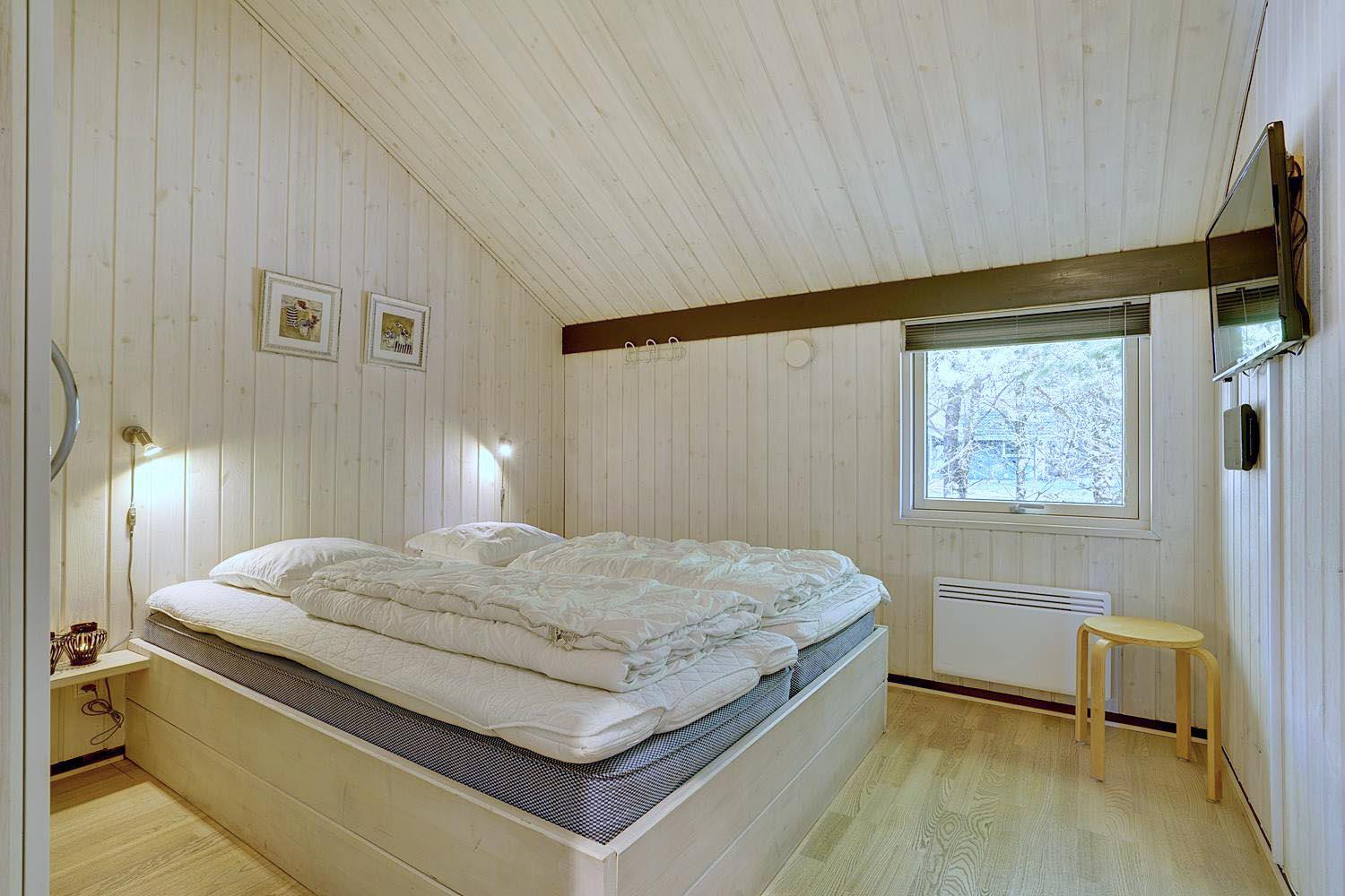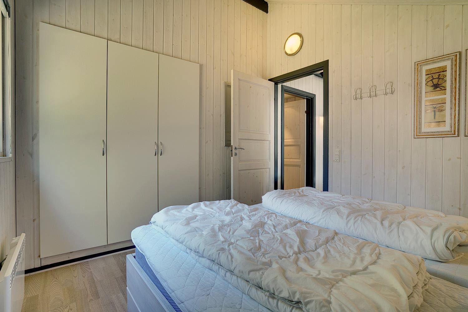 Sommerhuset har 4 soveværelser og god plads til alle. De to moderne badeværelser med gulvvarme giver ekstra komfort. I det store badeværelse kan du slappe af i den private sauna eller nyde en stund i den indendørs standvandsspa – ren wellness, helt for dig selv.