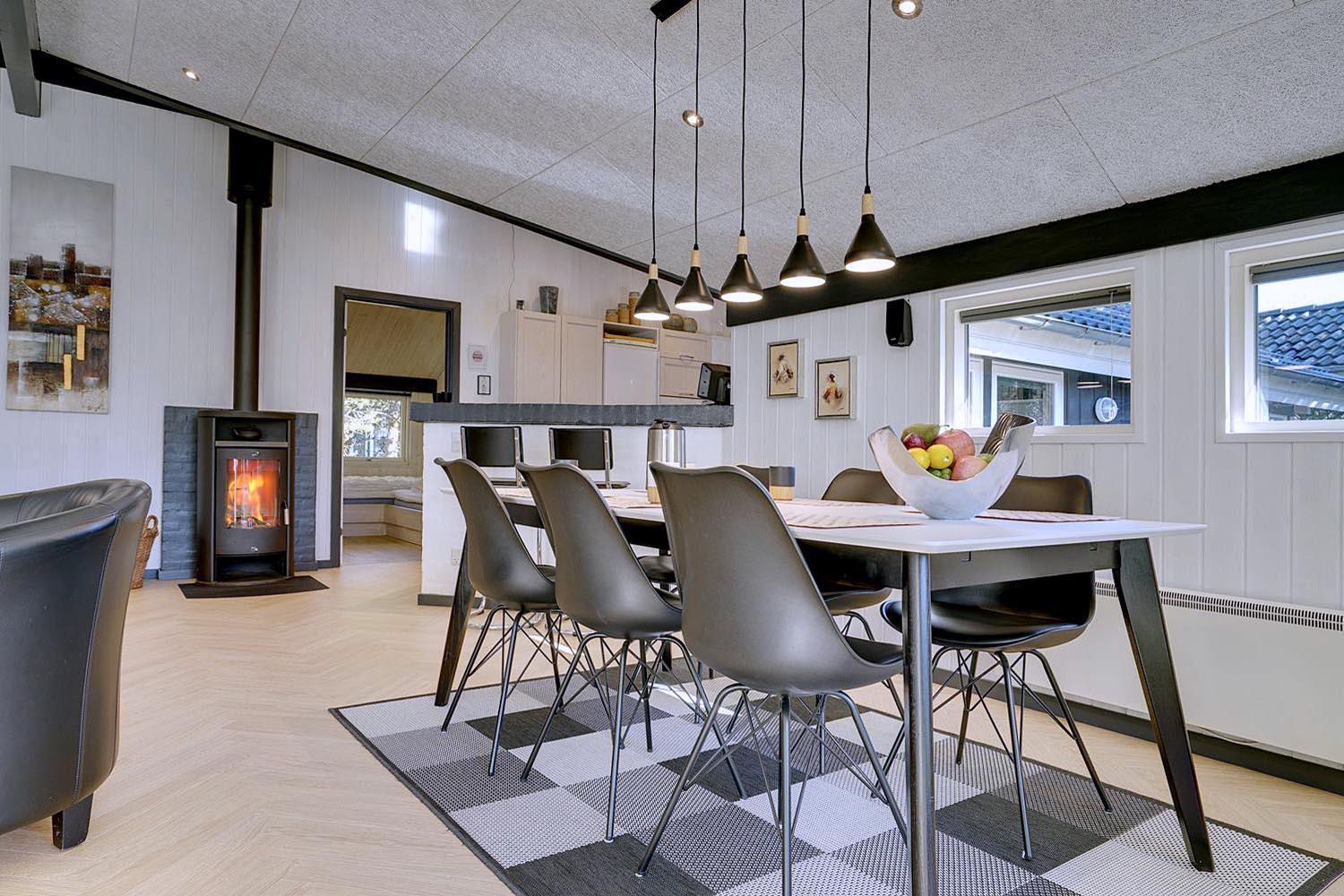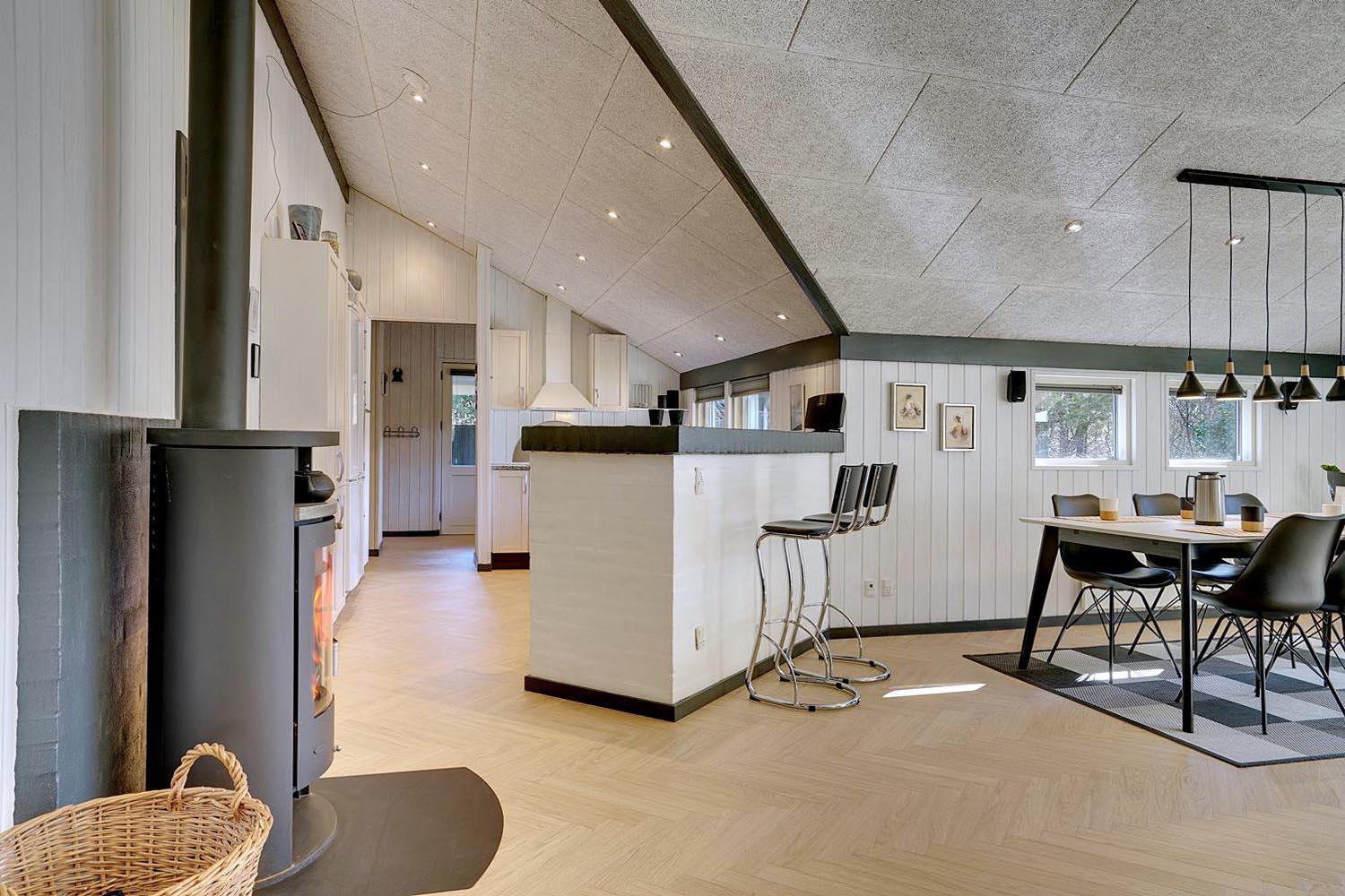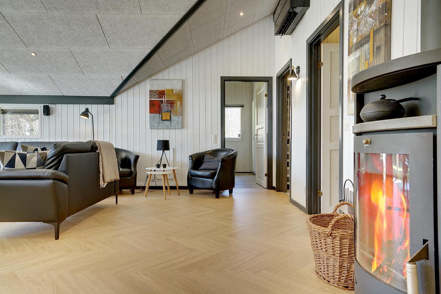 Den lyse opholdsstue er husets naturlige samlingspunkt. Gulvvarme og brændeovn sørger for en hyggelig stemning – også på kølige dage. Når I har lyst til underholdning, står der en spillekonsol klar til hyggelige aftener sammen.