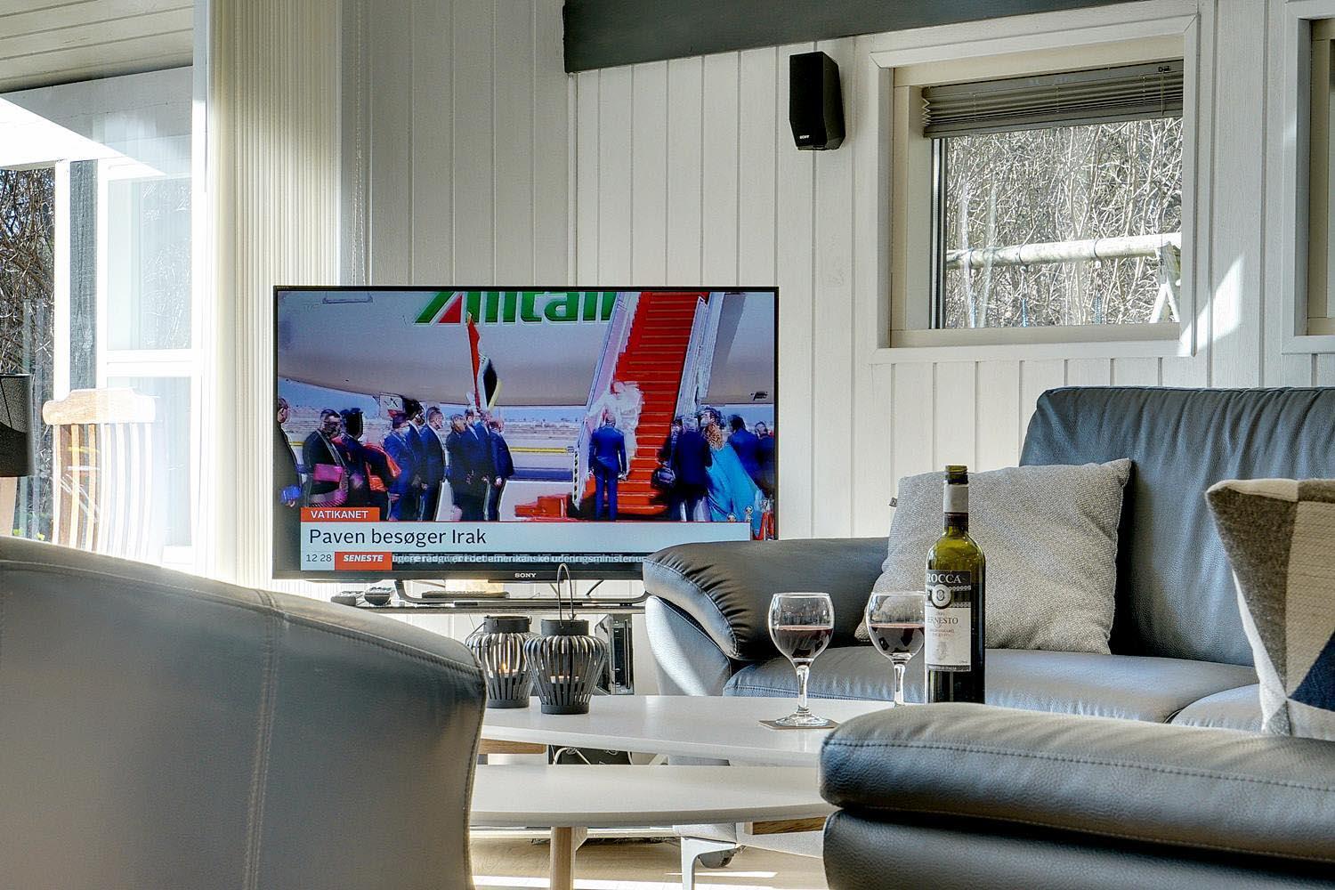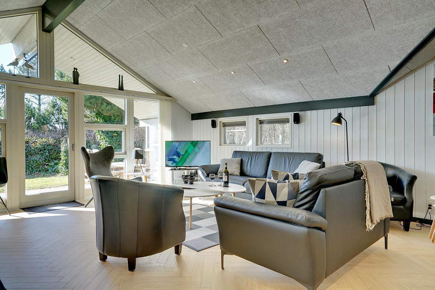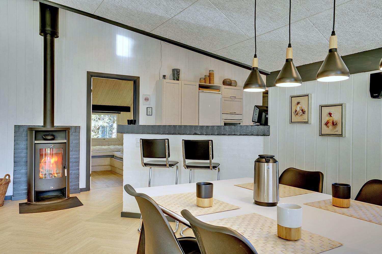 Den lyse opholdsstue er husets naturlige samlingspunkt. Gulvvarme og brændeovn sørger for en hyggelig stemning – også på kølige dage. Når I har lyst til underholdning, står der en spillekonsol klar til hyggelige aftener sammen.