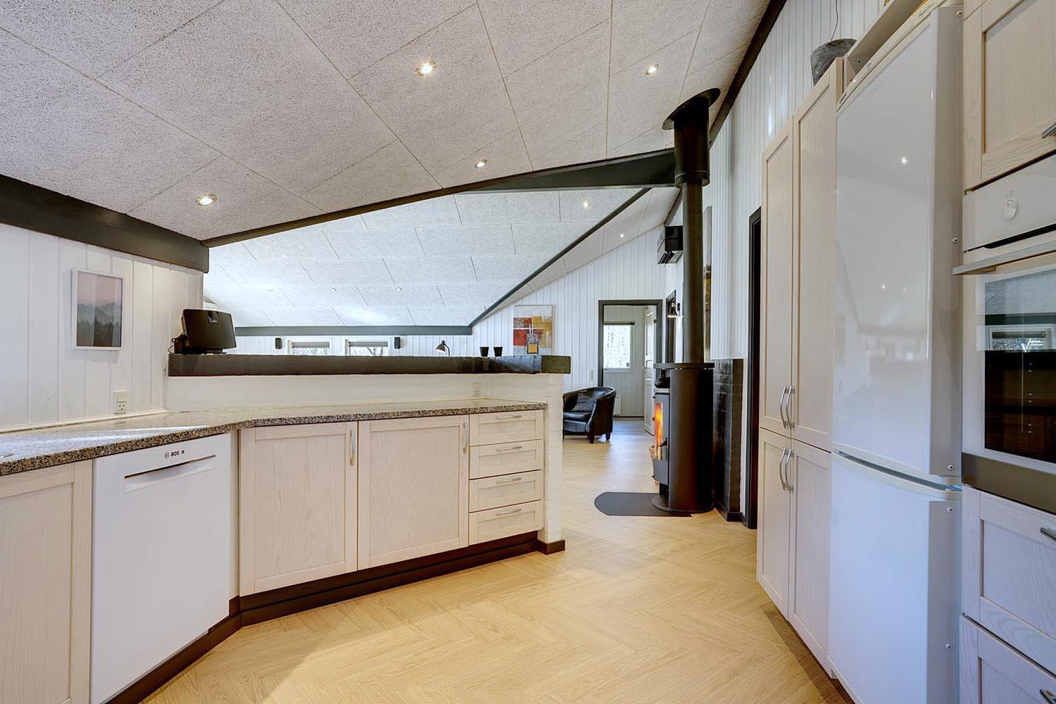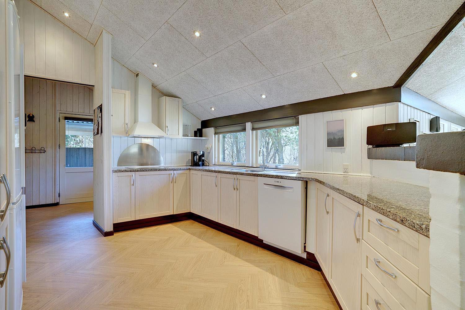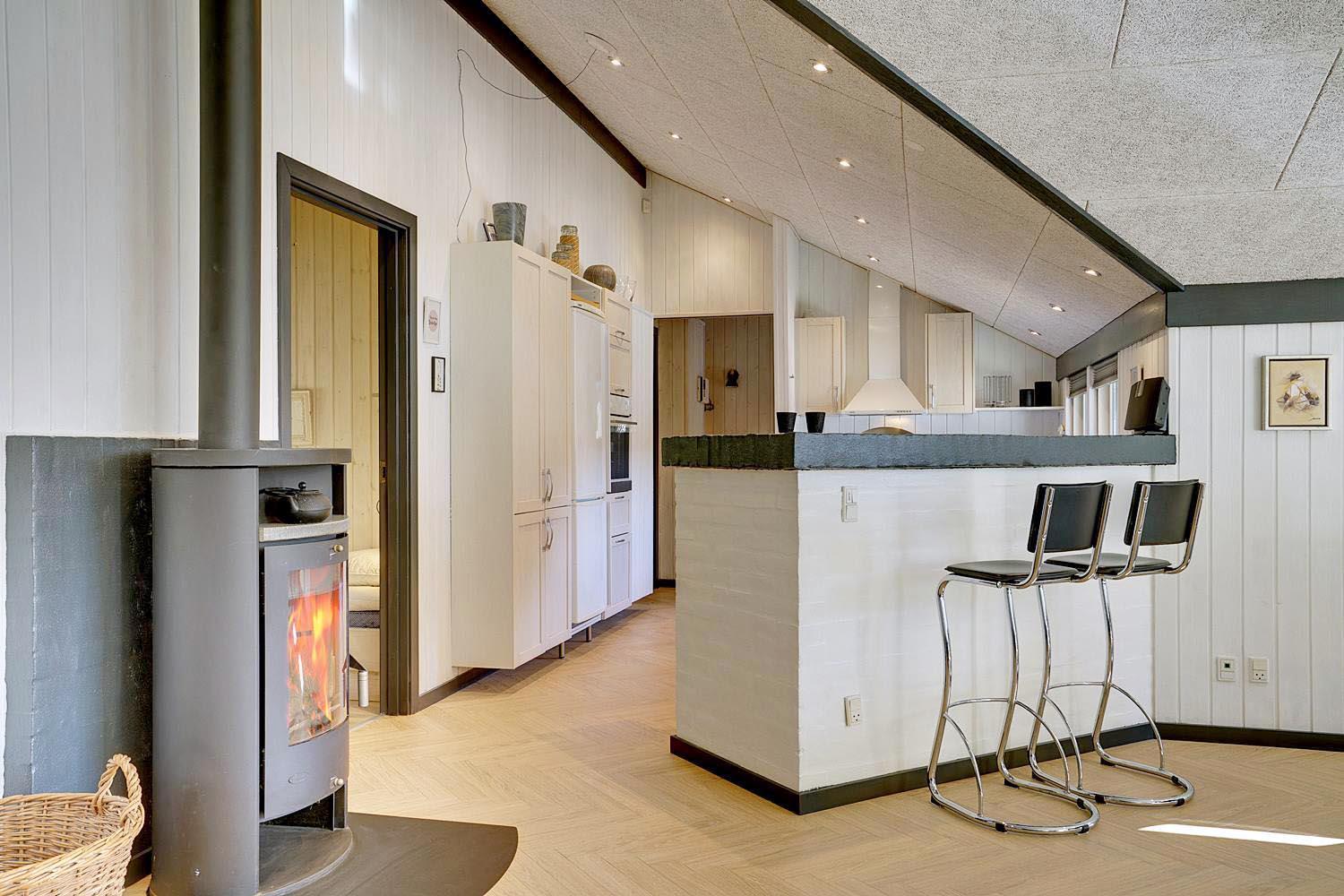 Det åbne køkken er moderne og veludstyret med opvaskemaskine, ovn, køleskab og gulvvarme, så madlavningen bliver en fornøjelse – også i ferien. En energivenlig varmepumpe sikrer et behageligt indeklima året rundt.