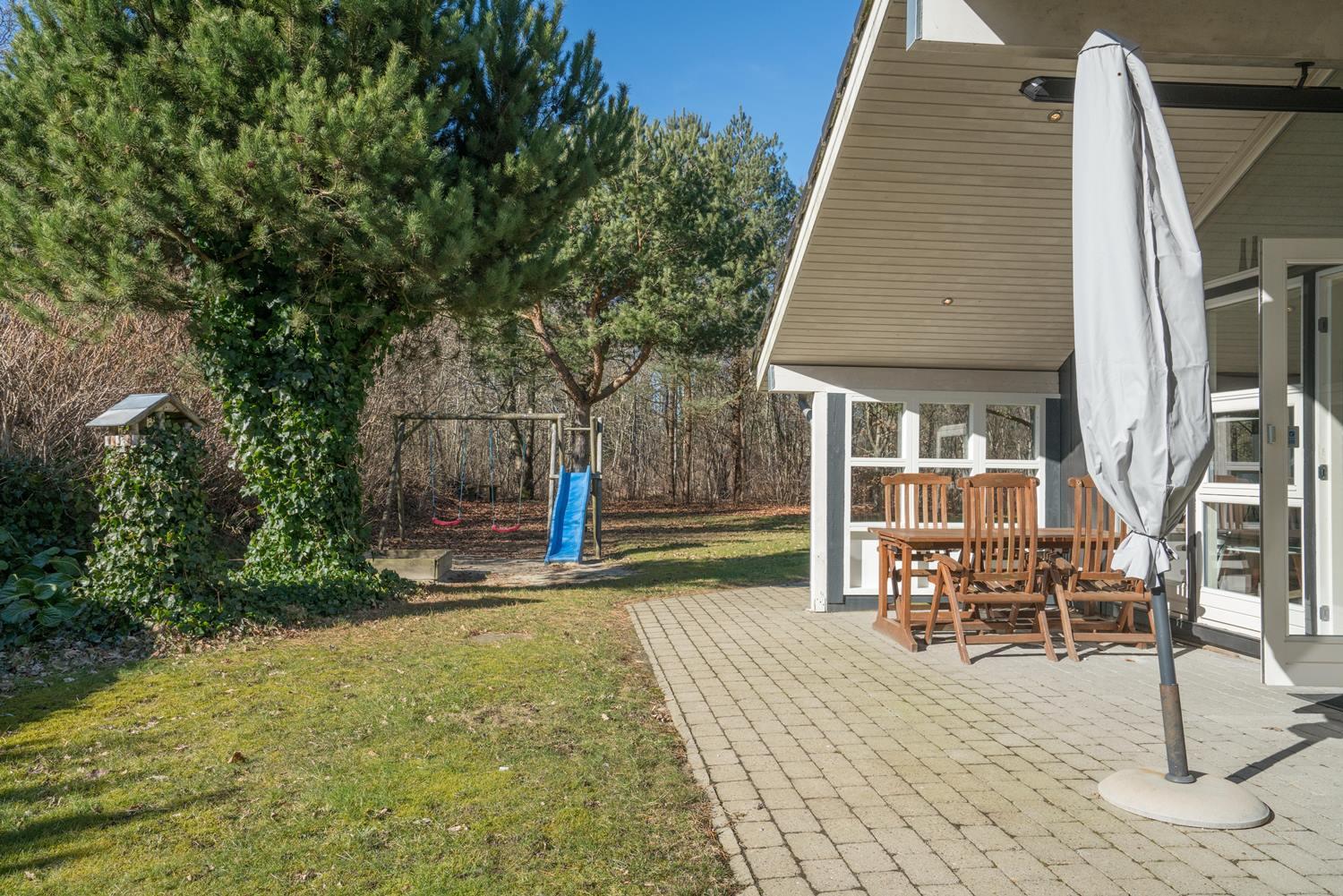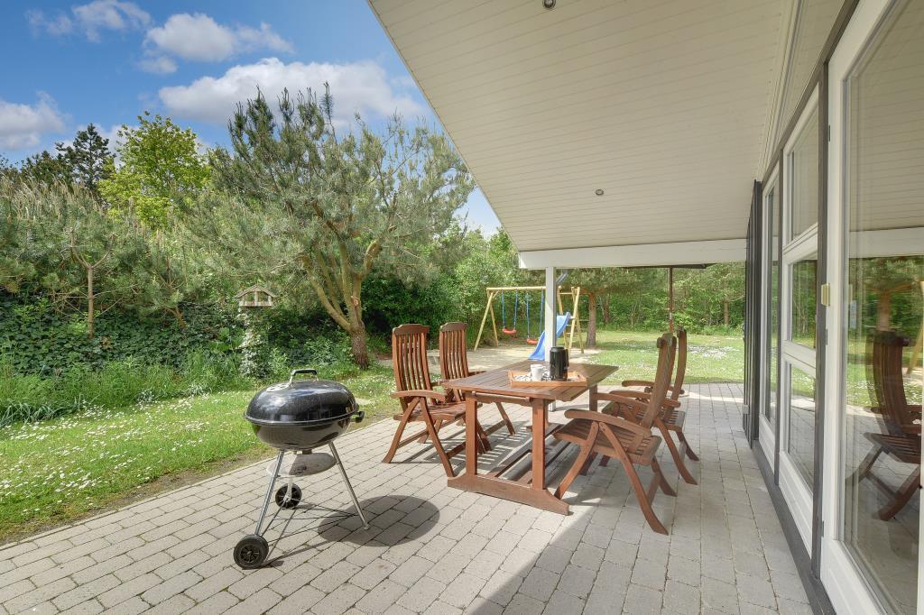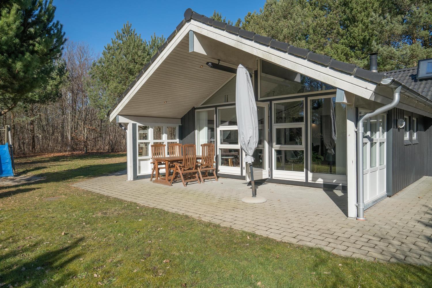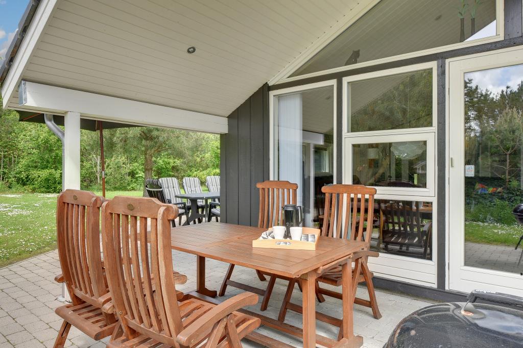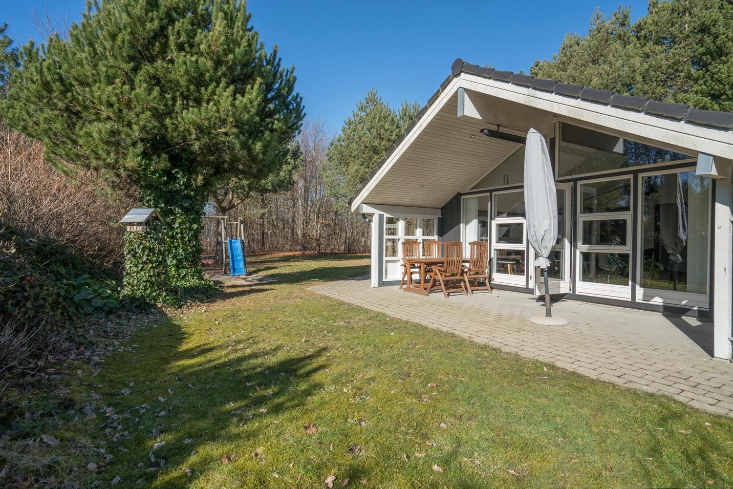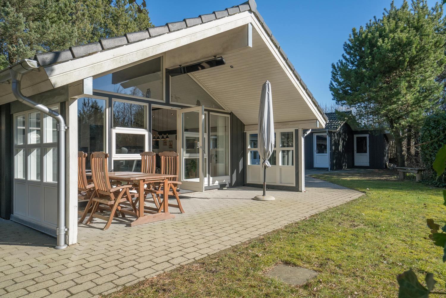 Udenfor venter en overdækket terrasse, hvor dagen kan starte med morgenkaffe og slutte med et glas vin i aftensolen. Børnene kan lege på gyngen eller i sandkassen, mens du bare nyder freden.