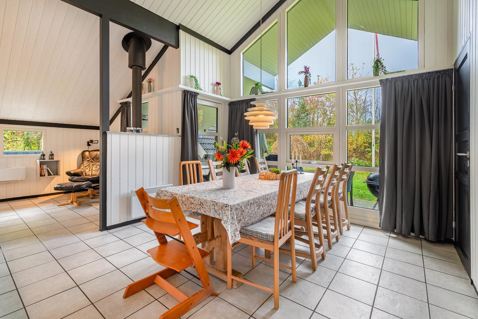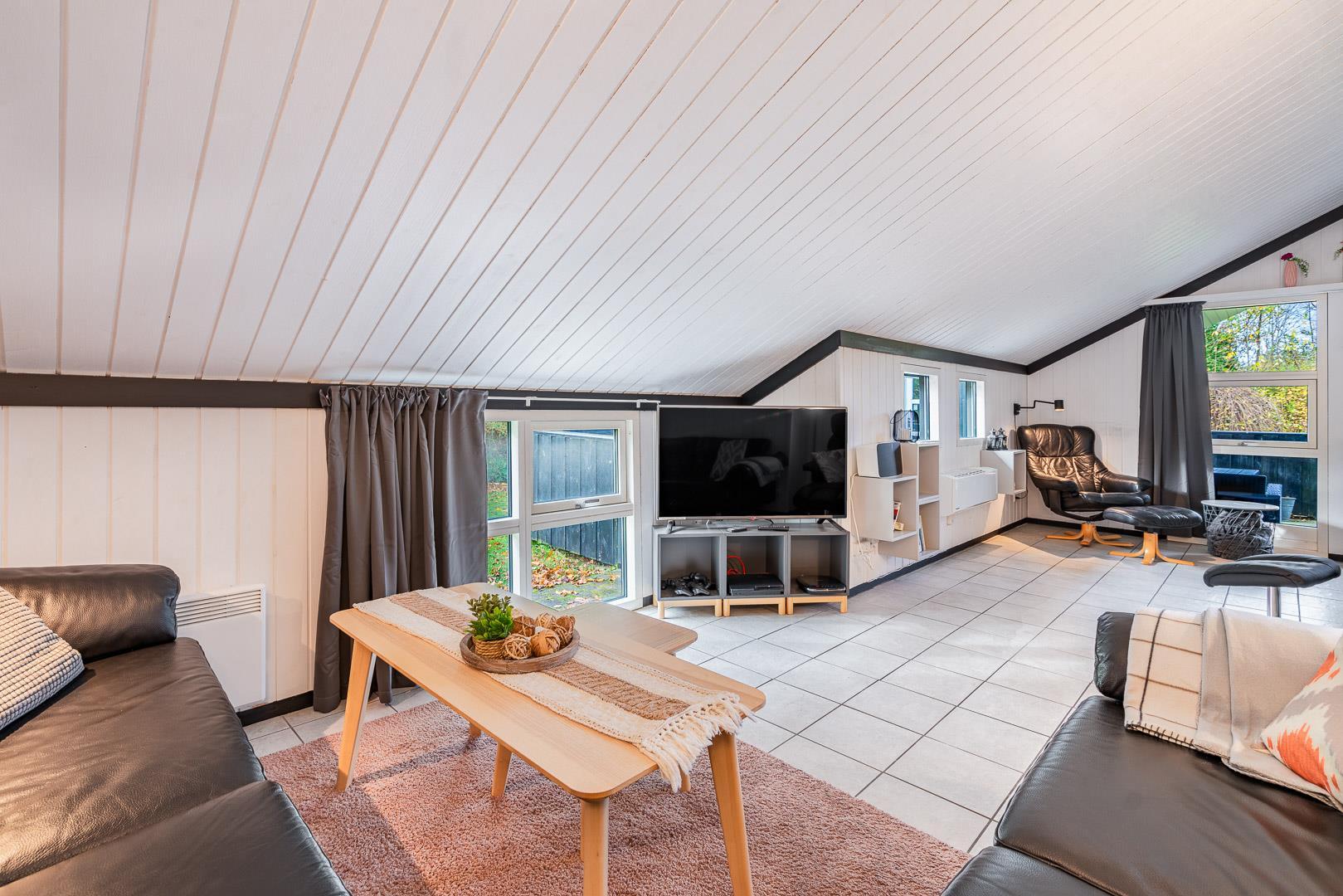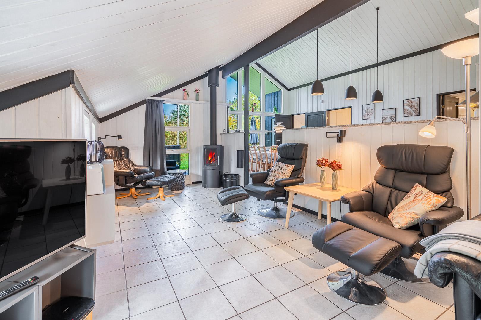 Sommerhuset er delvist renoveret i 2022 og byder på 120 m² med god plads til hele familien. Det store opholdsrum er husets naturlige samlingspunkt – her skaber gulvvarme, varmepumpe og den stemningsfulde brændeovn en dejlig, varm hygge året rundt.