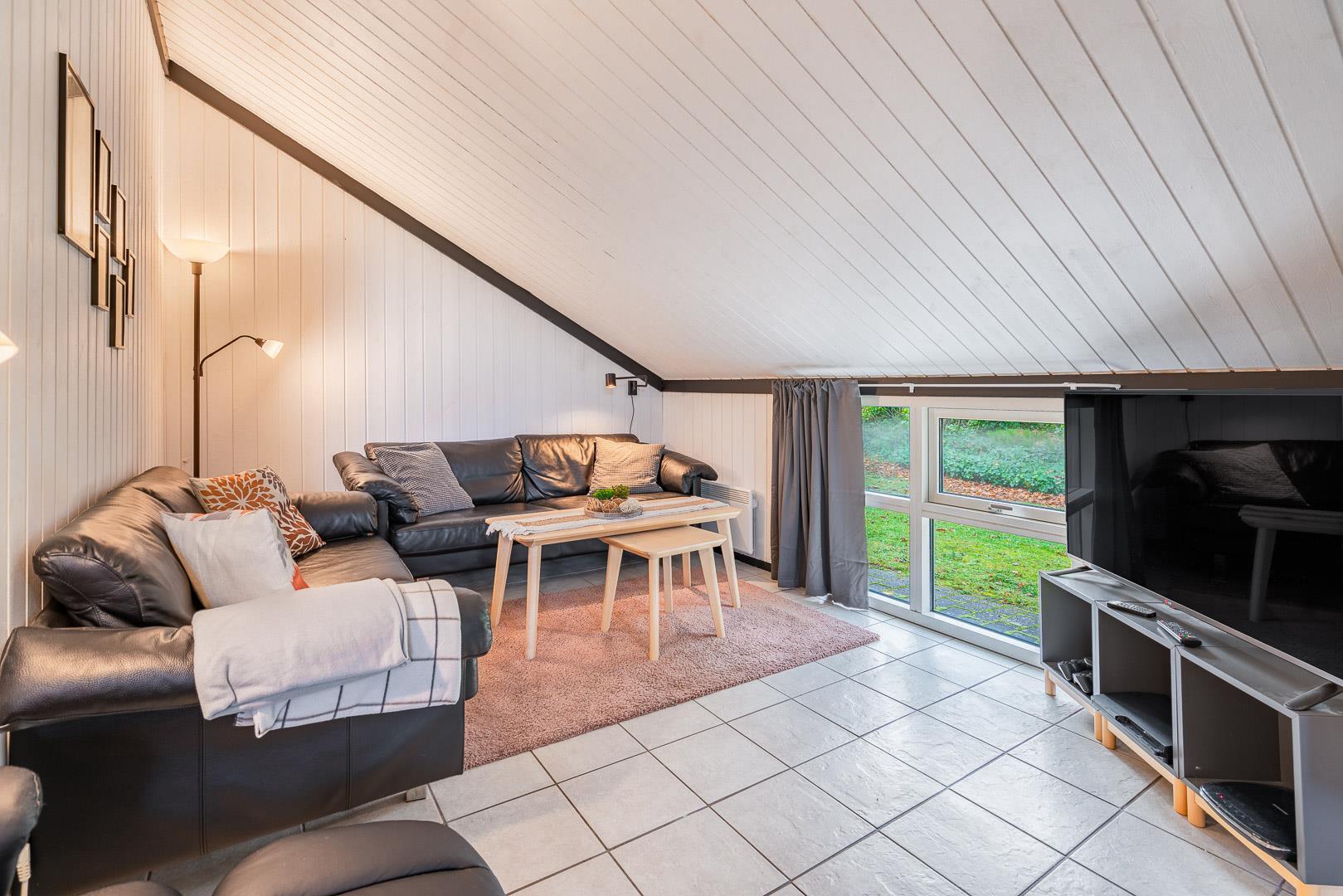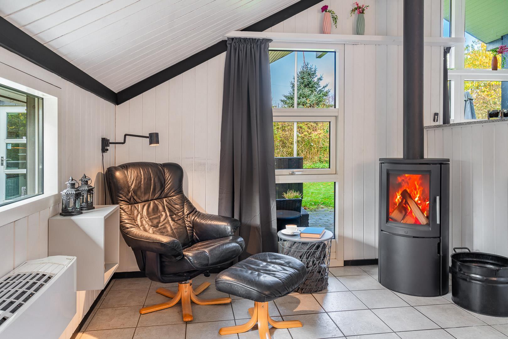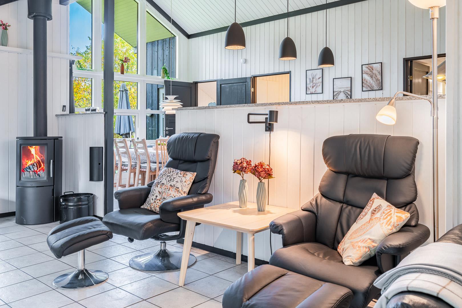 Sommerhuset er delvist renoveret i 2022 og byder på 120 m² med god plads til hele familien. Det store opholdsrum er husets naturlige samlingspunkt – her skaber gulvvarme, varmepumpe og den stemningsfulde brændeovn en dejlig, varm hygge året rundt.