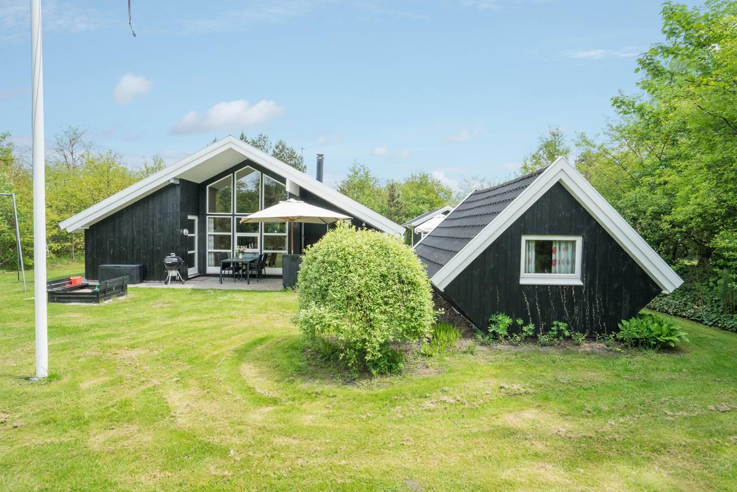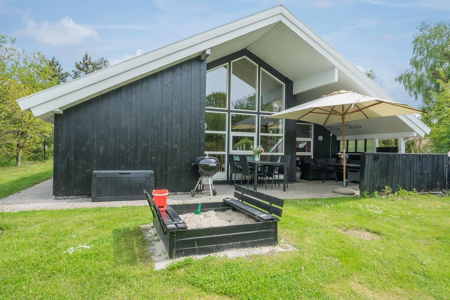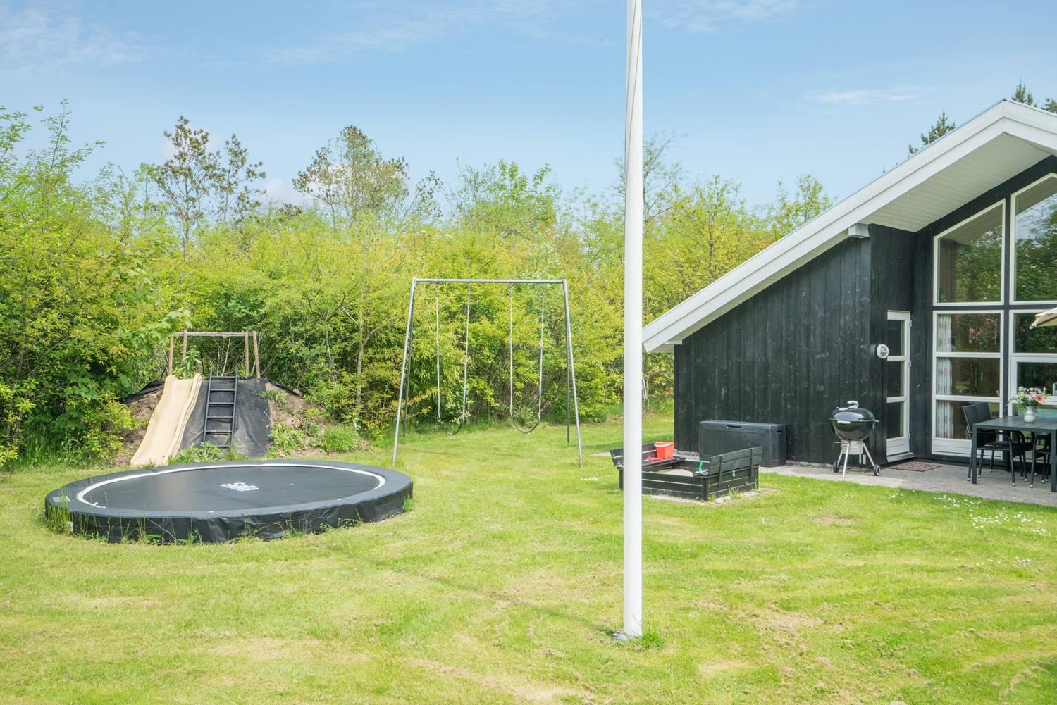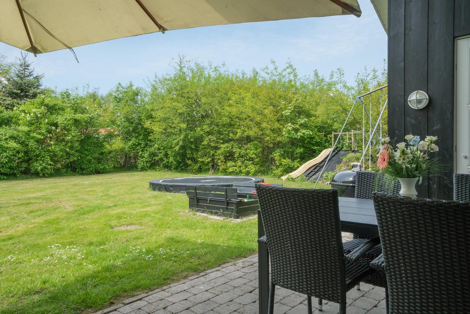 For børnene er haven et lille paradis med gynge, sandkasse og trampolin, hvor der er rig mulighed for leg og bevægelse. Imens kan de voksne nyde roen på den overdækkede terrasse eller tænde op i grillen. Hunden er naturligvis også velkommen – for ferie er bedst, når hele familien er samlet.