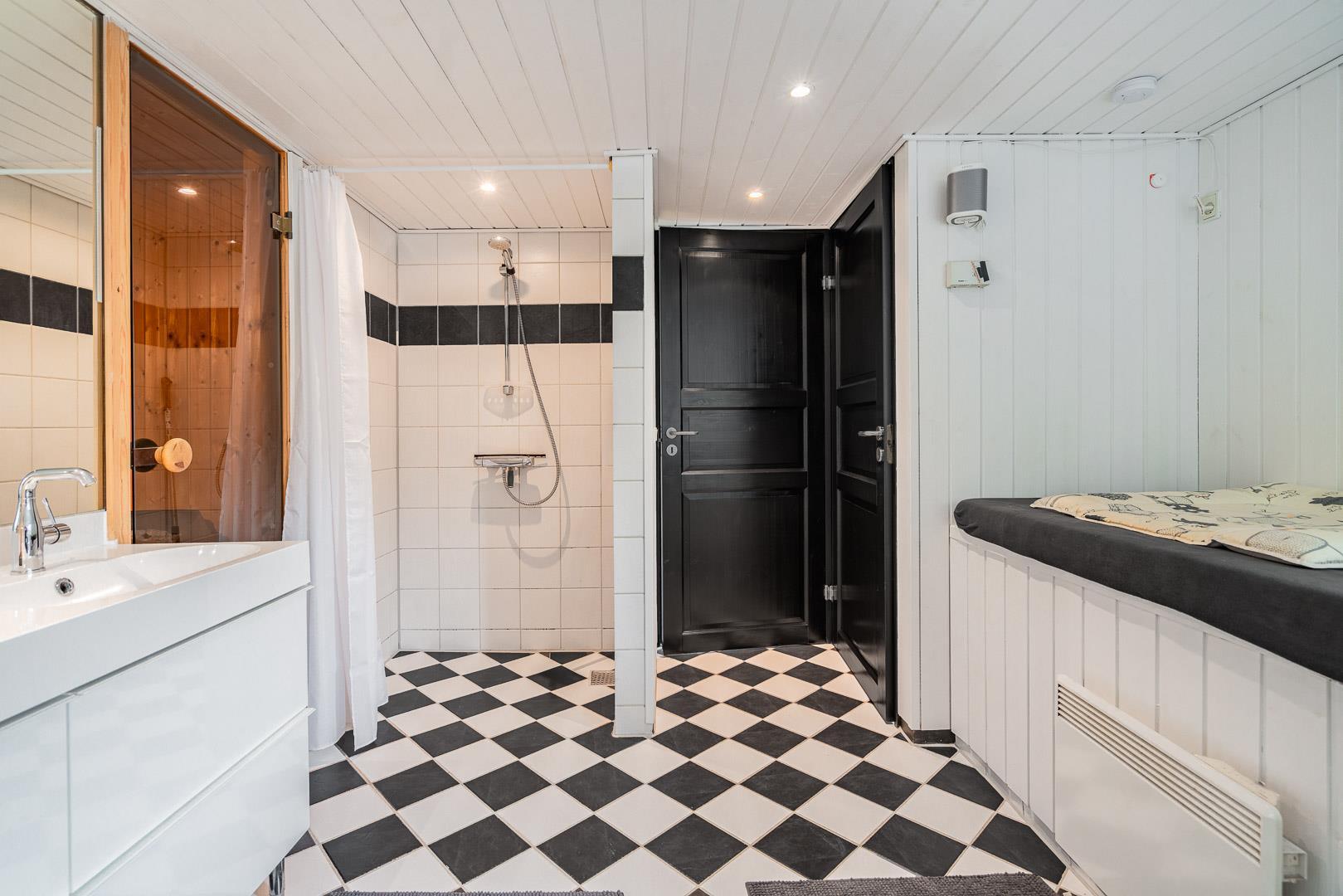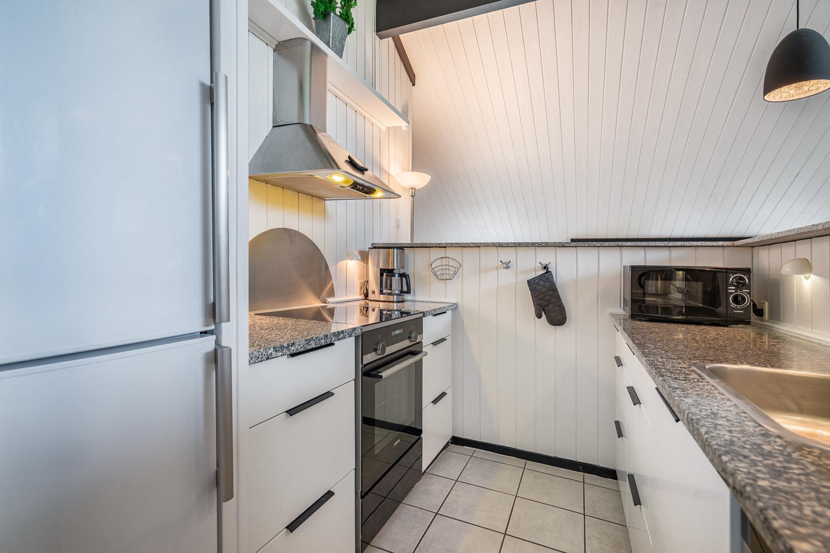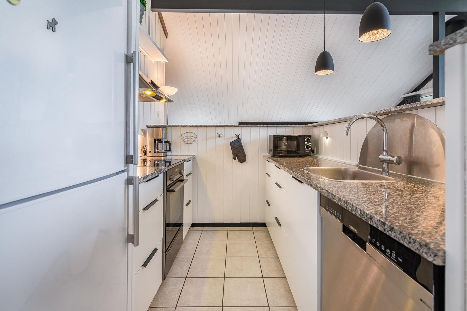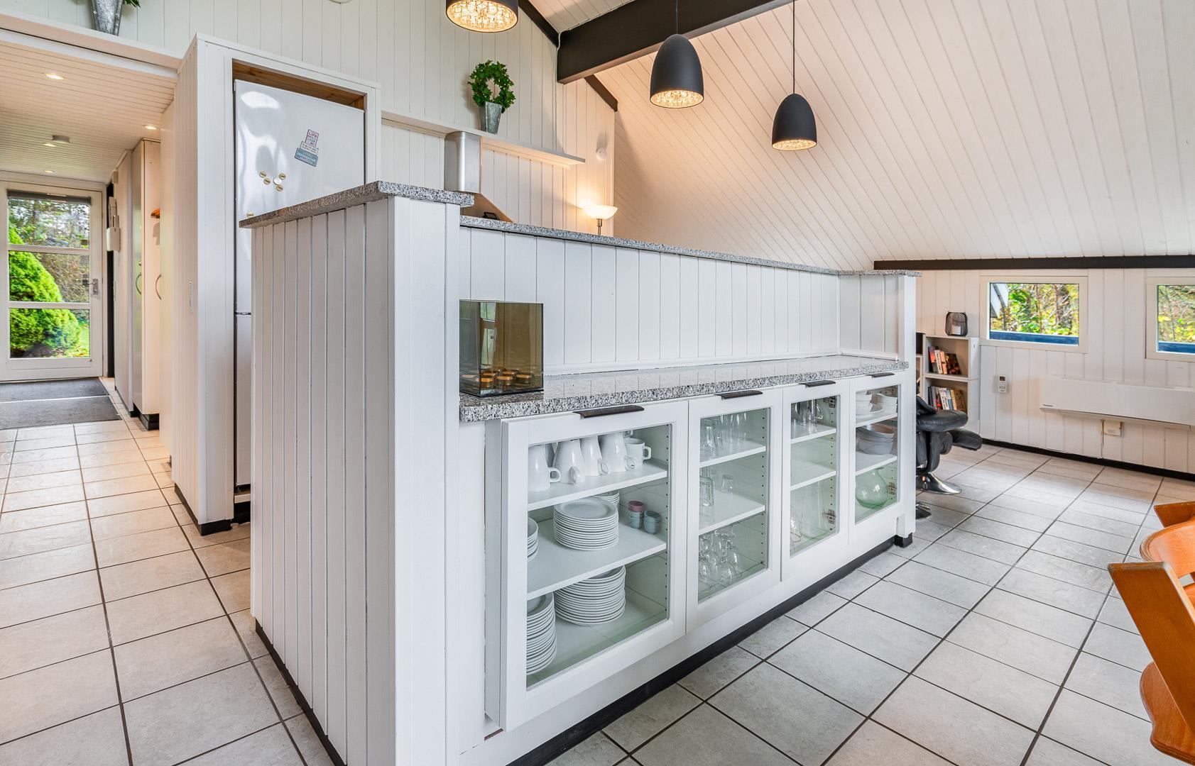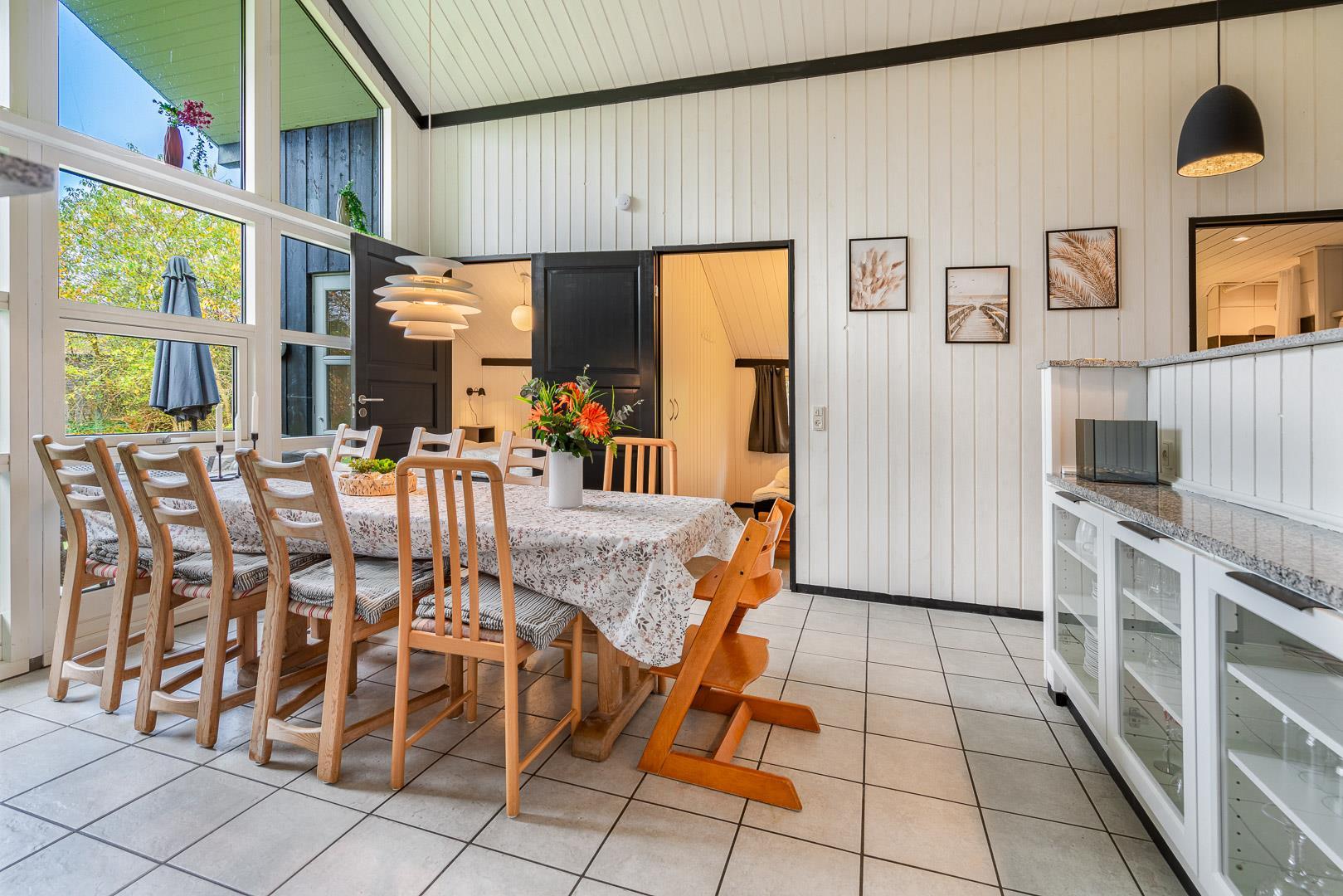 Det åbne køkken er veludstyret med opvaskemaskine, ovn og alt, hvad du behøver for at lave mad sammen. Også her er der gulvvarme for ekstra komfort. Huset rummer i alt 4 soveværelser samt et separat anneks – ideelt til teenagere eller gæster, der gerne vil have lidt ekstra privatliv.