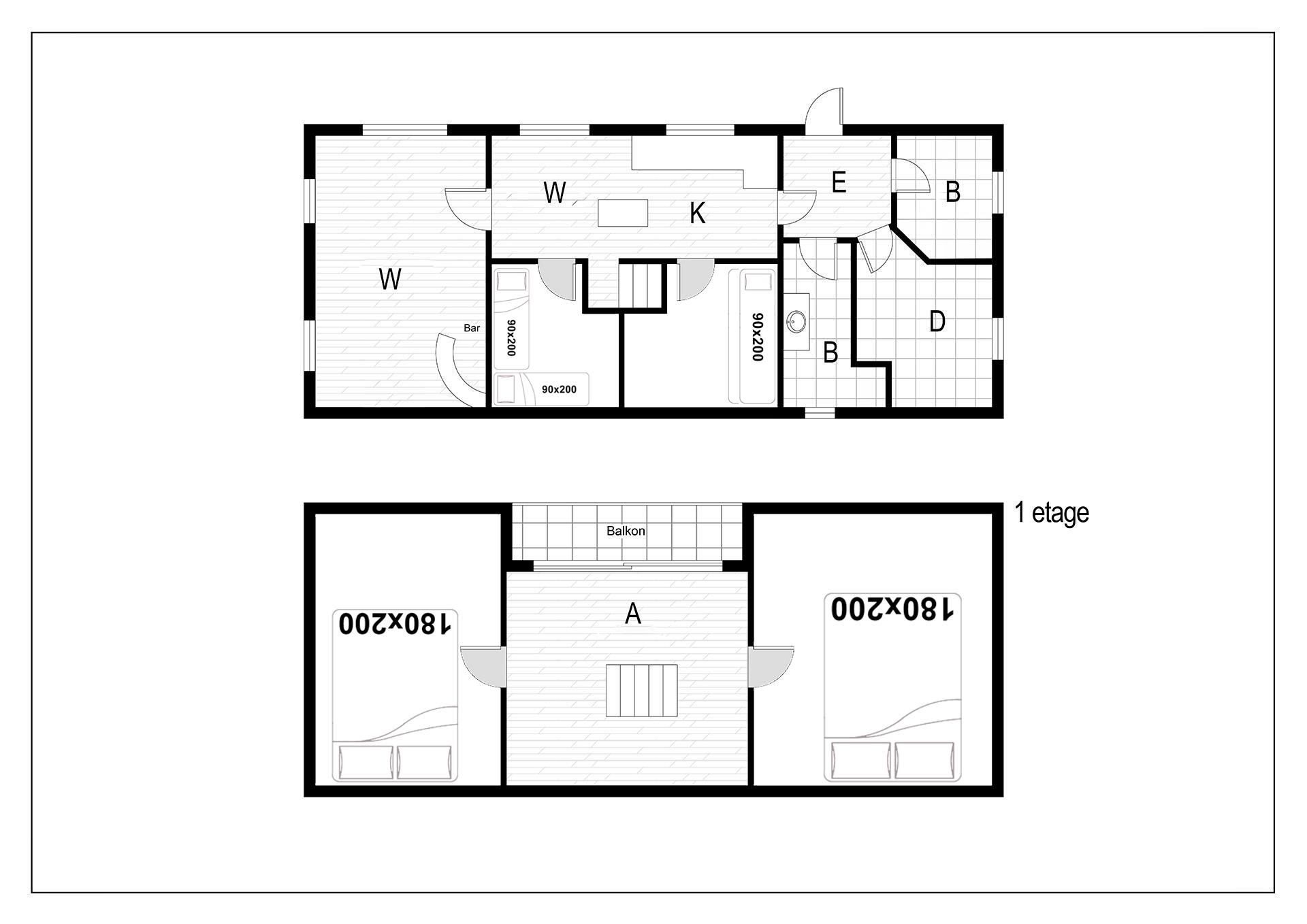 Dobbeltsenge 180 x 200 cm, 2 enkeltsenge 90 x 200 cm samt 1 køjeseng 90 x 200 cm.