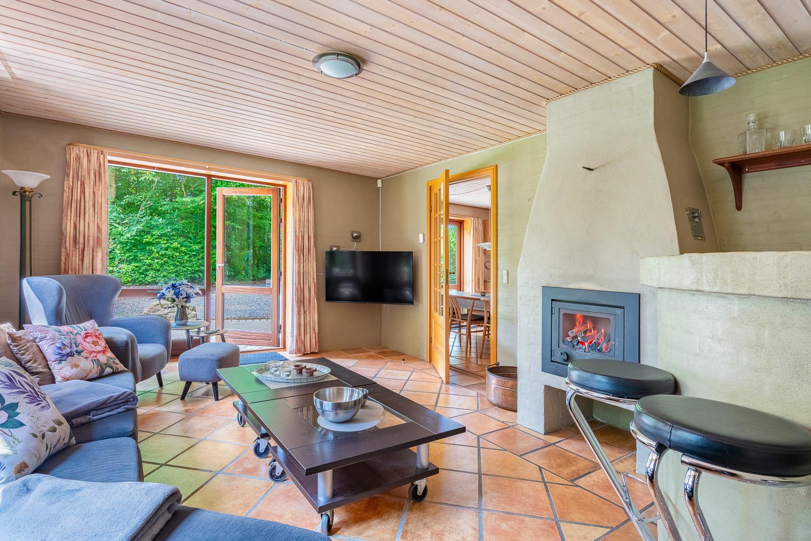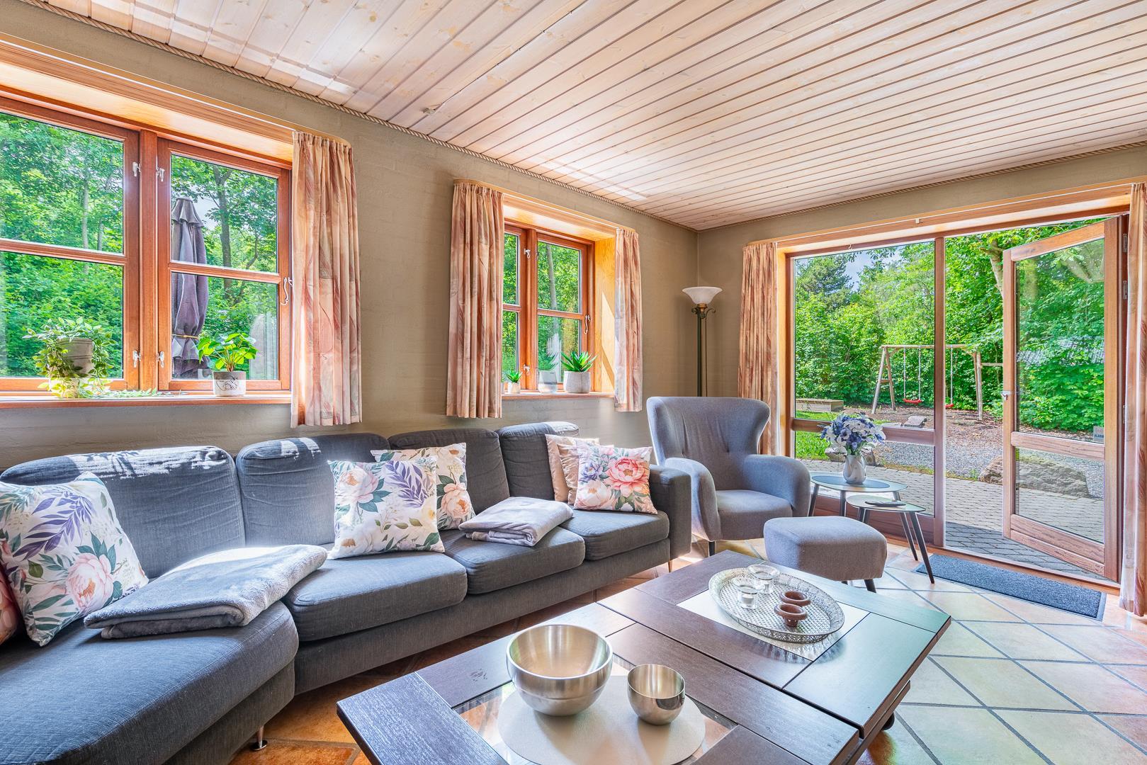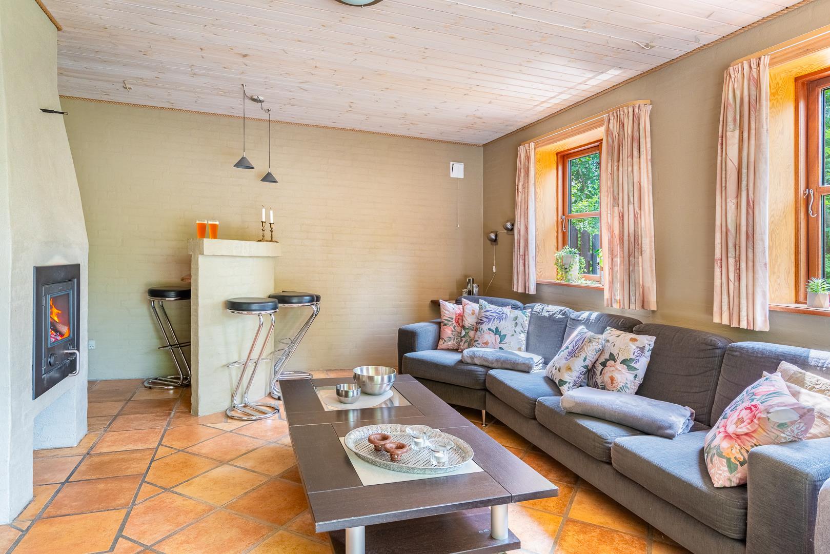 Opholdsrummet er husets naturlige samlingspunkt. Her skaber brændeovnen en varm og hyggelig stemning på kølige dage, mens gulvvarme i soveværelser, køkken og badeværelser sikrer en behagelig temperatur året rundt.