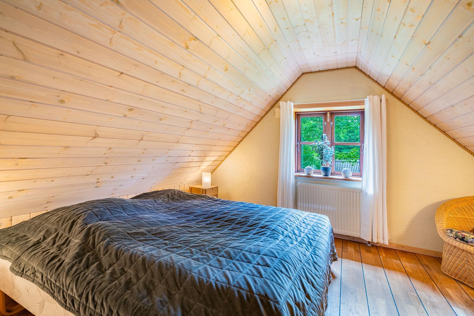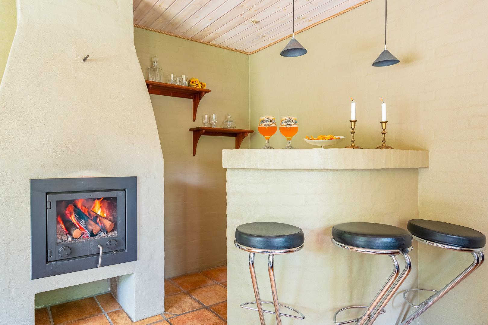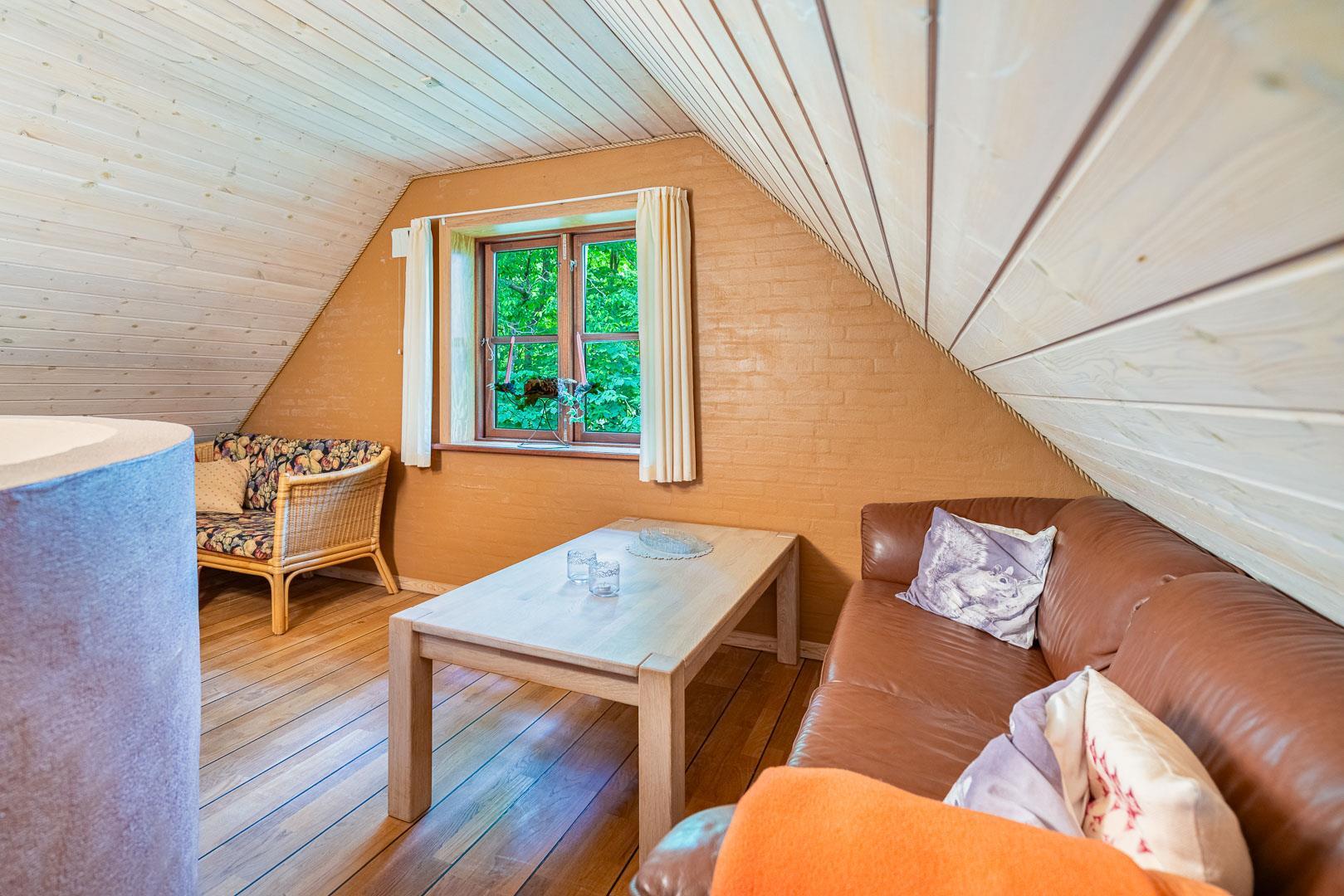 Opholdsrummet er husets naturlige samlingspunkt. Her skaber brændeovnen en varm og hyggelig stemning på kølige dage, mens gulvvarme i soveværelser, køkken og badeværelser sikrer en behagelig temperatur året rundt.