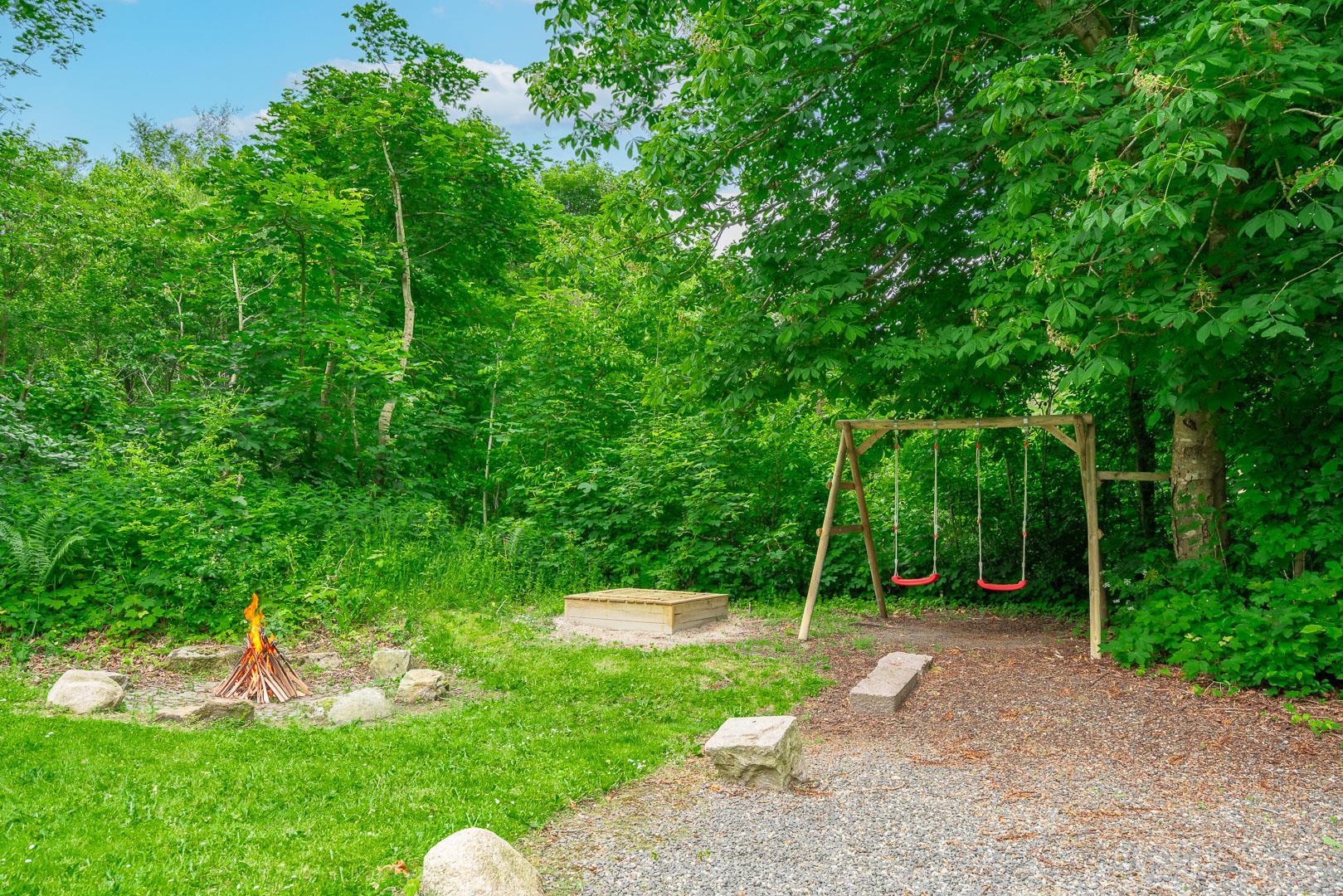Sommerhuset ligger på en stor naturgrund, hvor børnene kan more sig med gynge og sandkasse, mens hundene frit kan snuse og udforske omgivelserne. Her er god plads til både leg og afslapning.