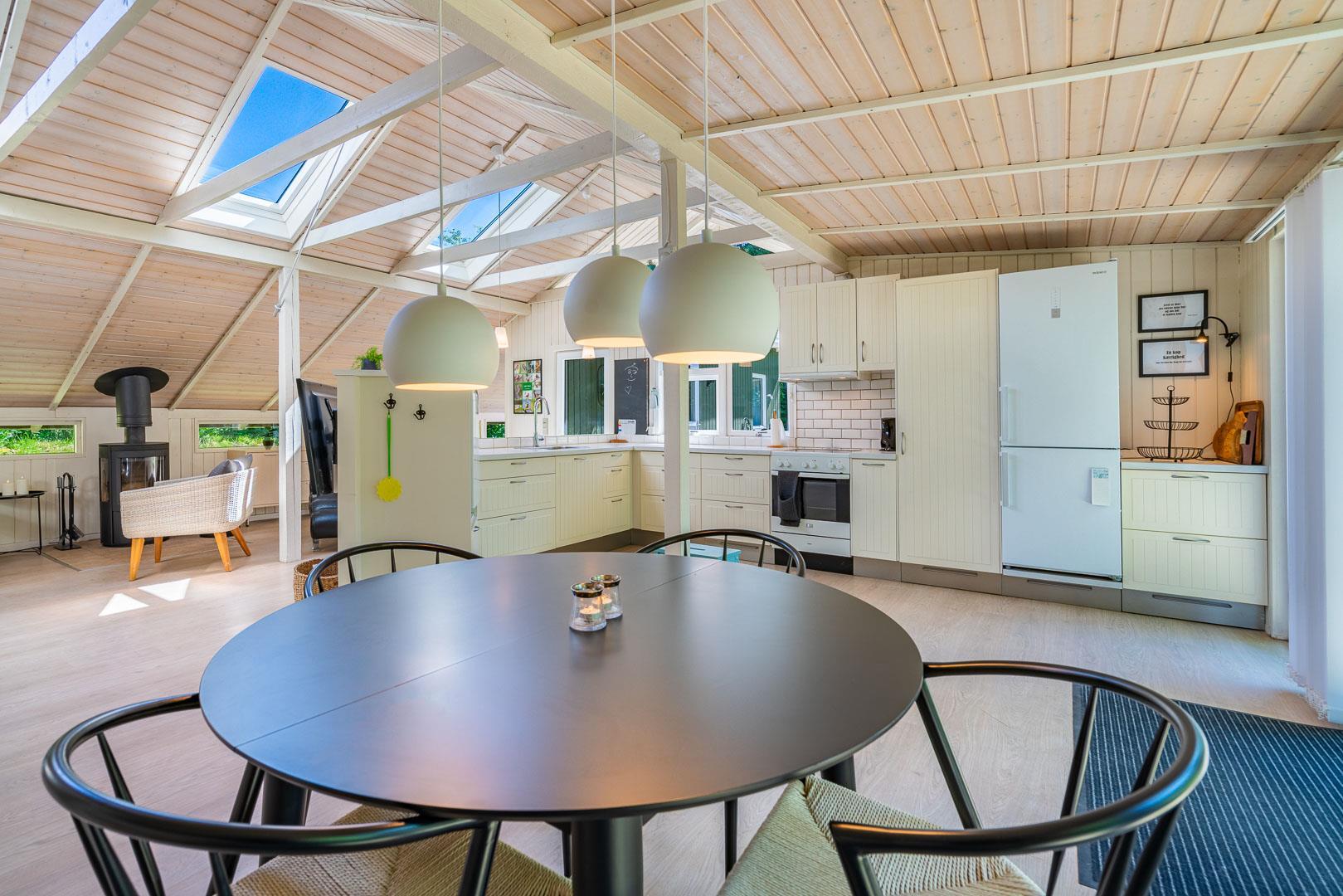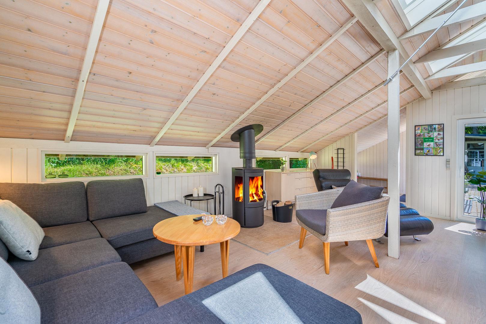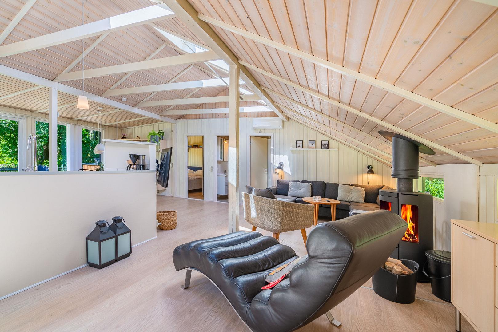Indenfor mødes I af en lys og indbydende atmosfære med moderne indretning og sans for detaljen. De store vinduespartier lukker naturen og lyset ind, mens brændeovnen skaber den helt rette stemning på kølige aftener. Her kan I slappe af med brætspil, film eller bare nyde roen. Varmepumpen sørger samtidig for et behageligt indeklima hele året.