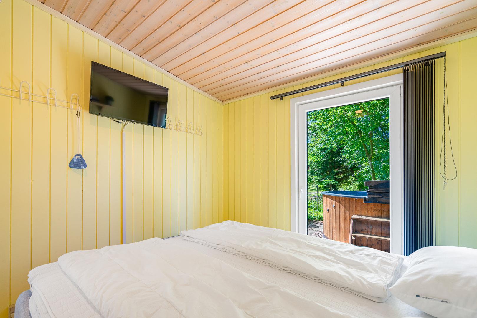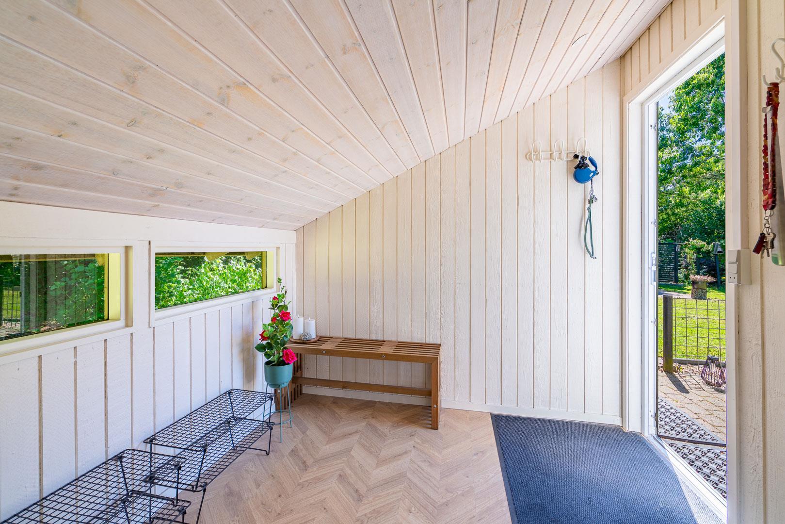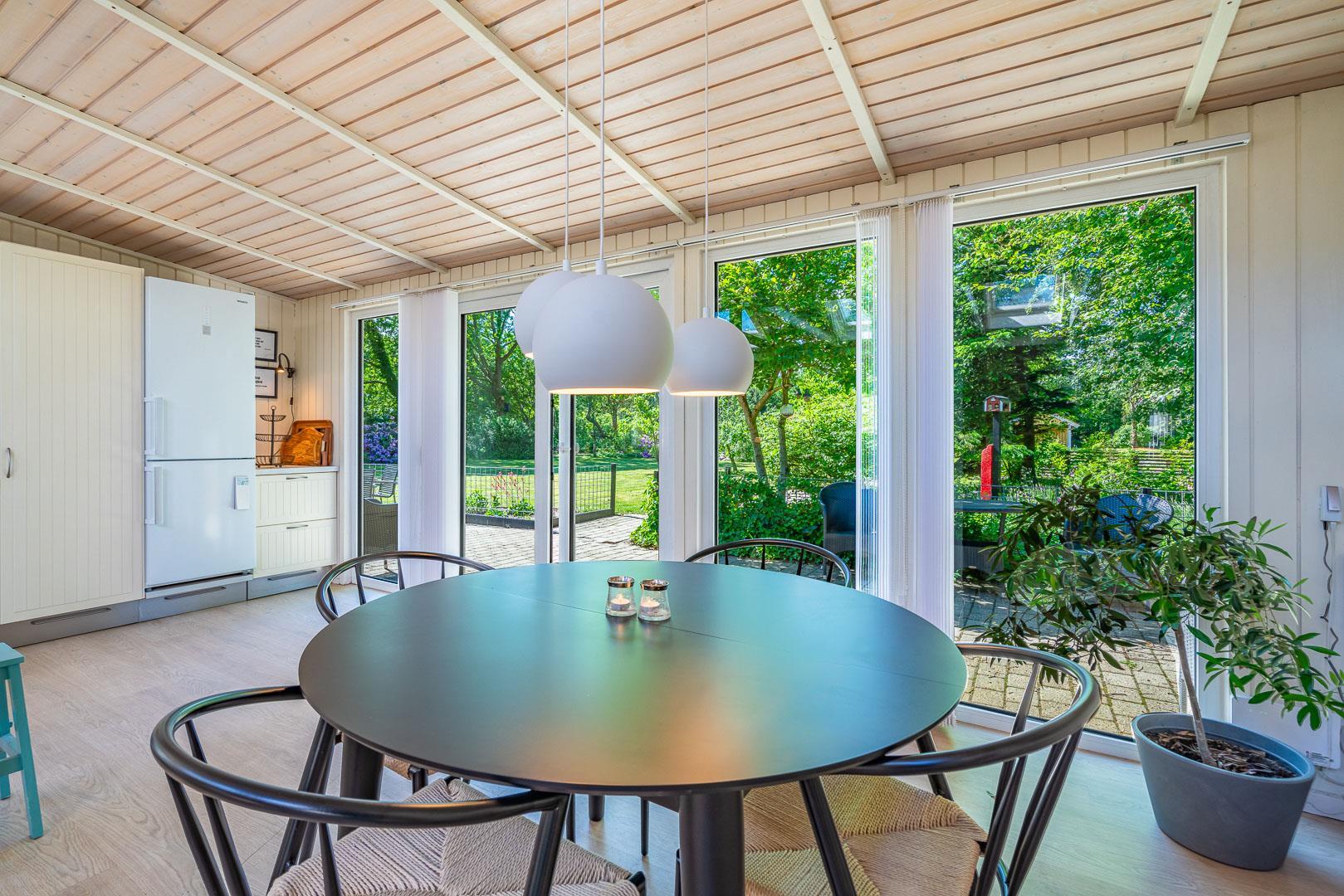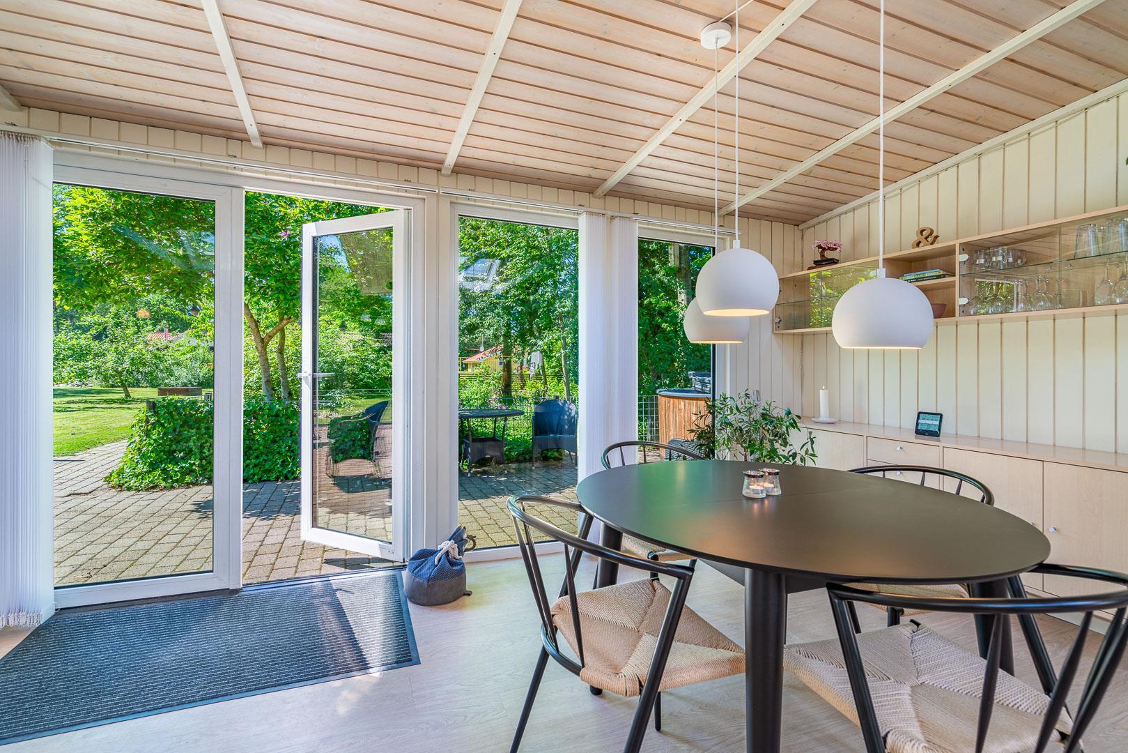 Indenfor mødes I af en lys og indbydende atmosfære med moderne indretning og sans for detaljen. De store vinduespartier lukker naturen og lyset ind, mens brændeovnen skaber den helt rette stemning på kølige aftener. Her kan I slappe af med brætspil, film eller bare nyde roen. Varmepumpen sørger samtidig for et behageligt indeklima hele året.