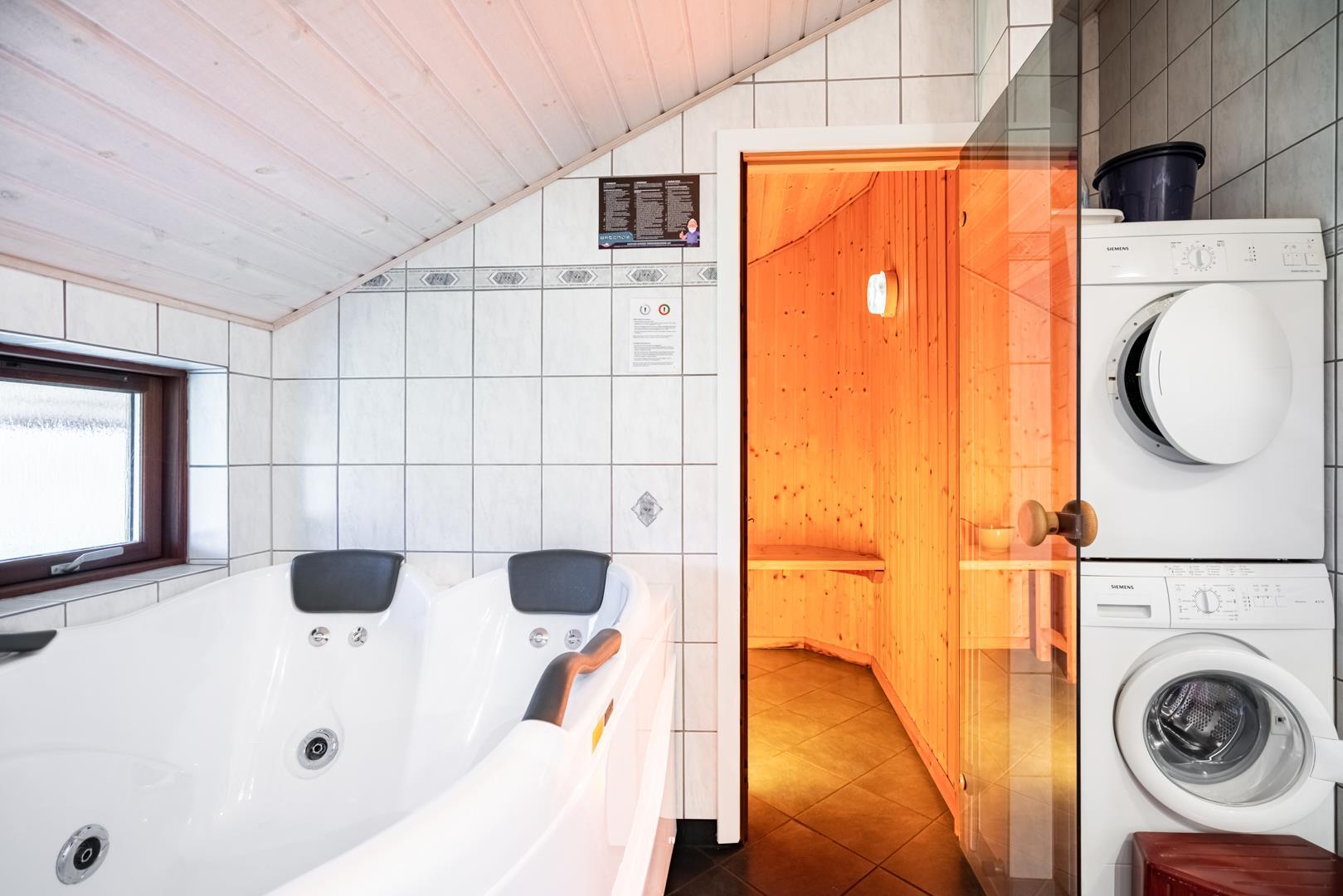 Huset rummer 3 soveværelser med gode sengepladser til 6 personer (3 dobbeltsenge á 160 x 200 cm). Derudover er der 2 badeværelser – begge med gulvvarme. Her kan du forkæle dig selv i saunaen eller slappe af i spabadet efter en aktiv dag. Der er også pusleplads, hvilket gør huset velegnet til ferie med baby.