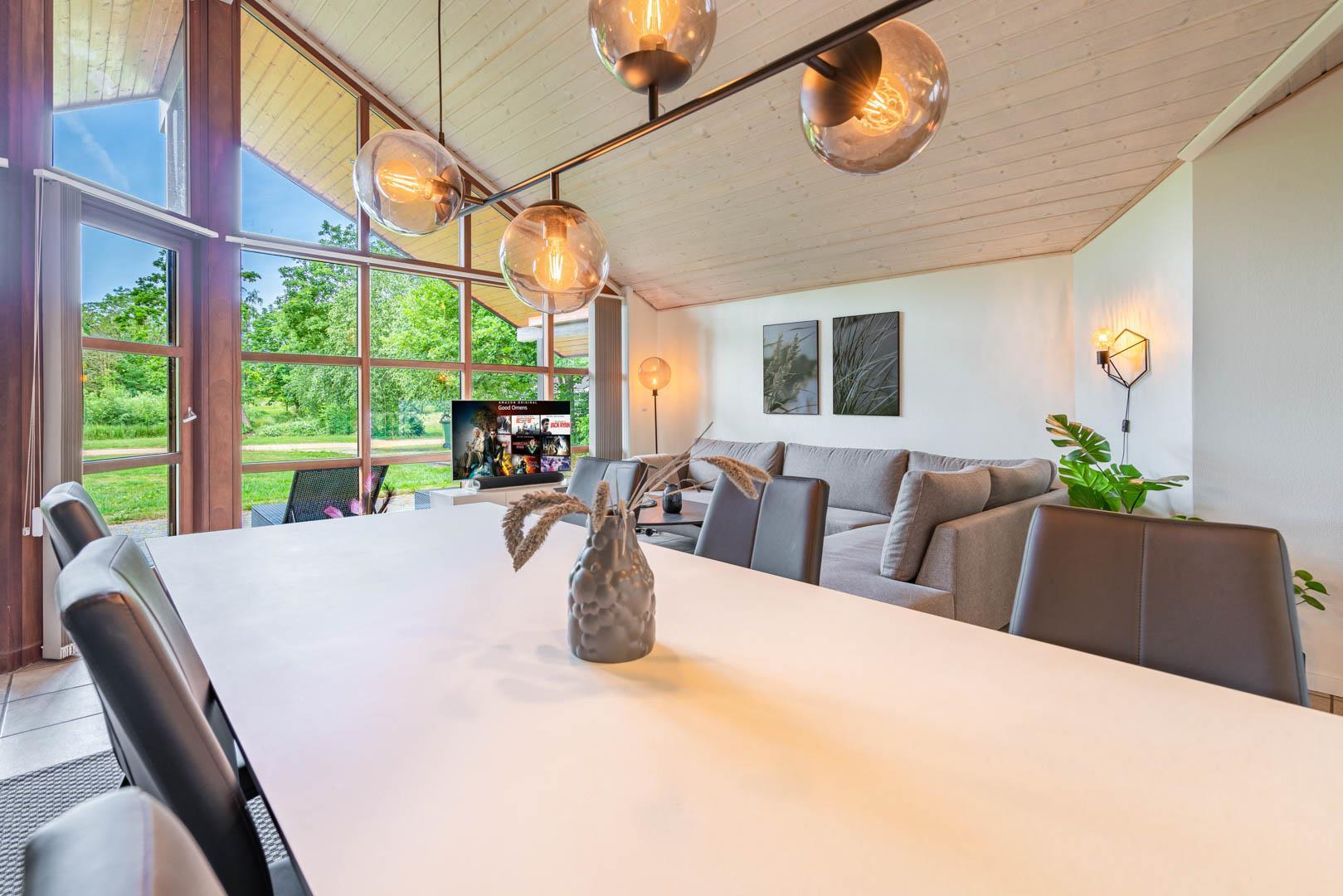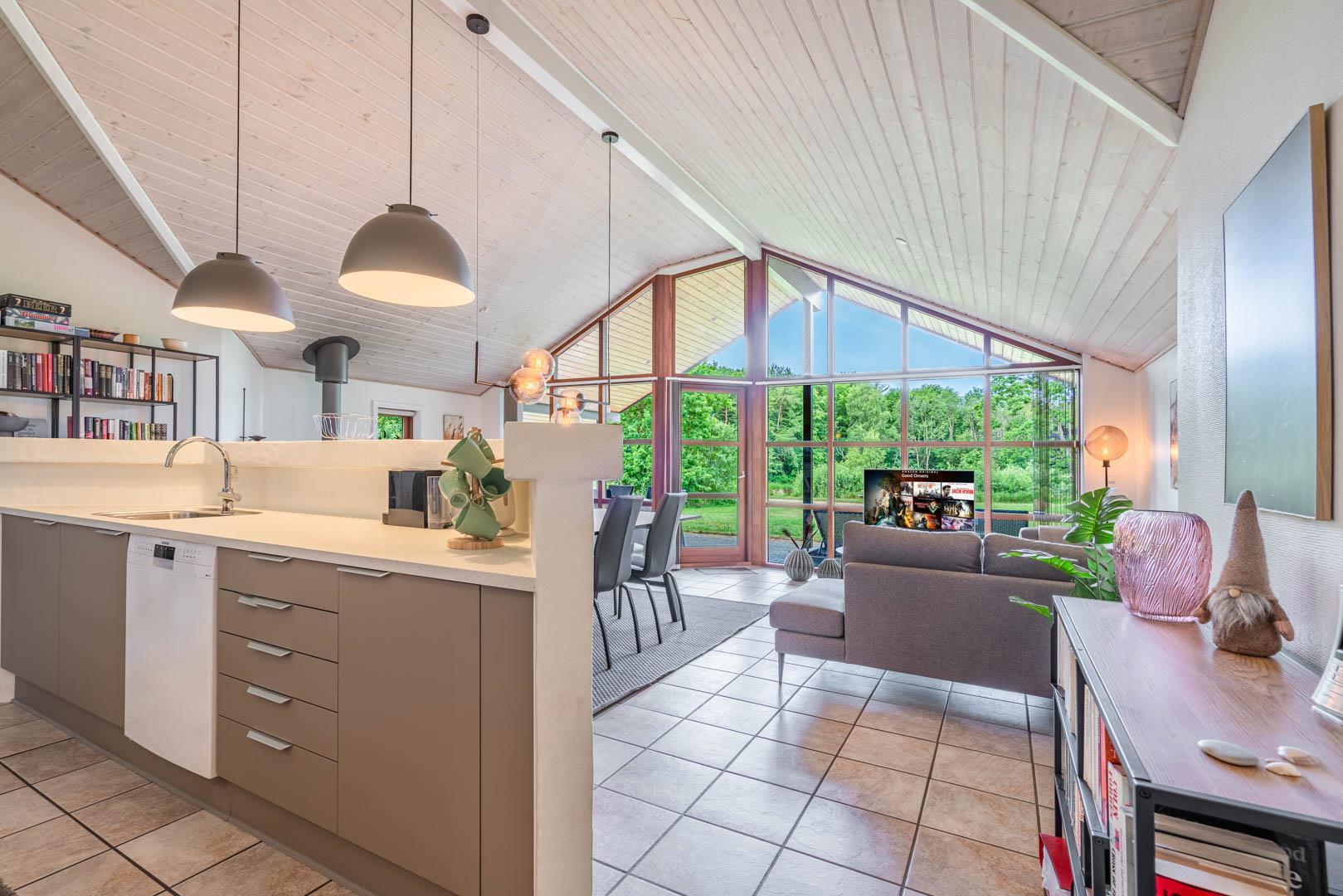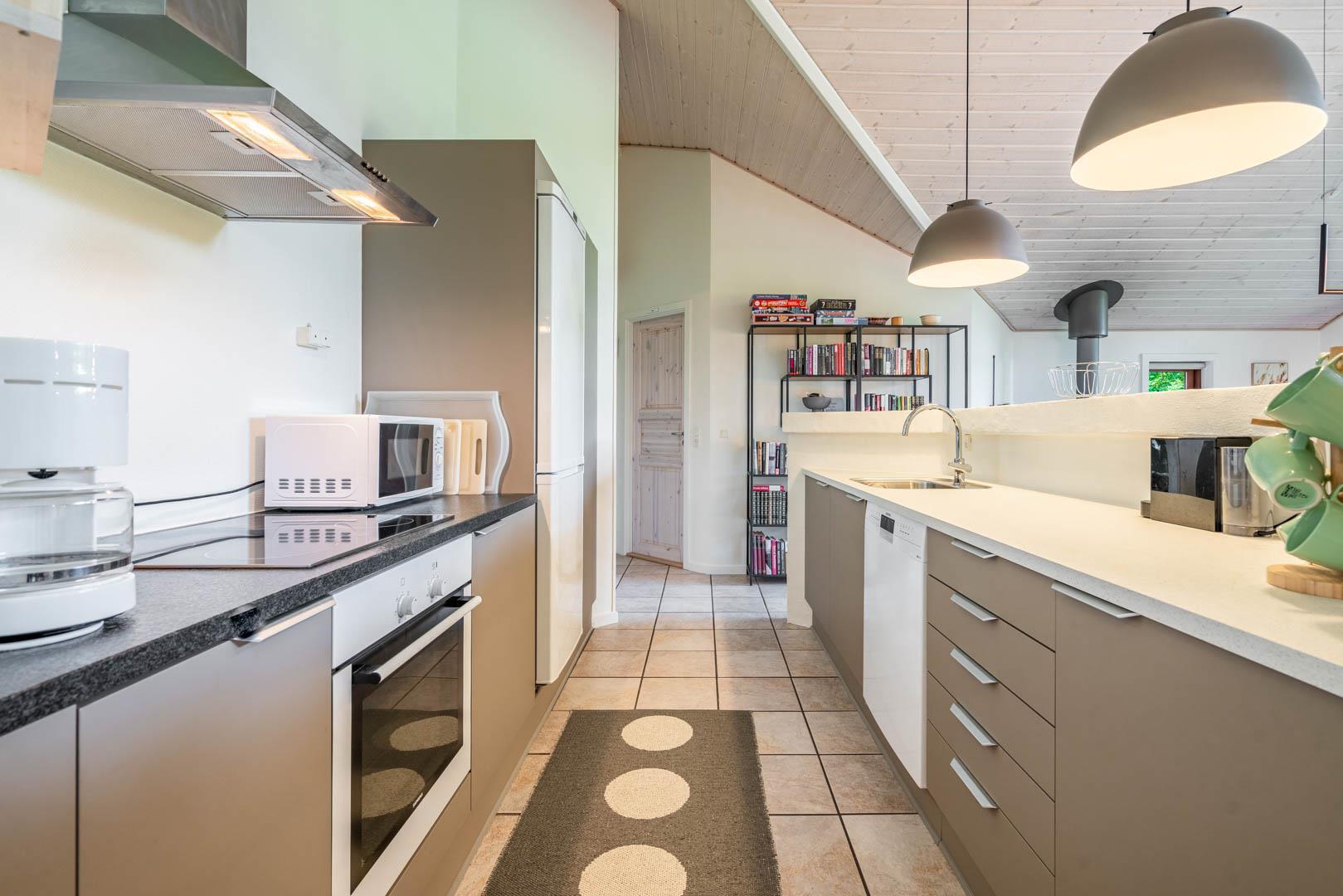 Køkkenet er åbent og praktisk indrettet med opvaskemaskine og gulvvarme – perfekt til fælles madlavning i ferien. Spisepladsen ligger med udsigt til terrasse og have, så I kan nyde lange middage og rolige aftener med kig til det grønne.