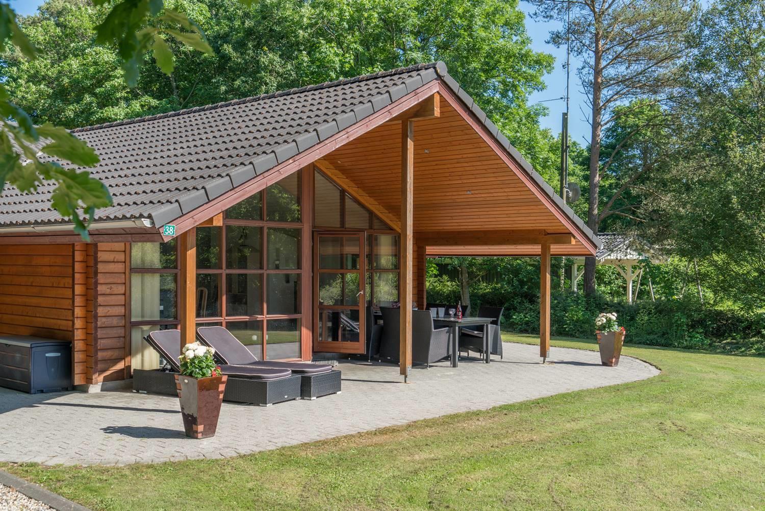 Udendørs venter en overdækket terrasse, hvor I kan nyde måltider i det fri eller slappe af med en kop kaffe efter en dag ved stranden. Den rolige grund giver god plads til både leg og afslapning.