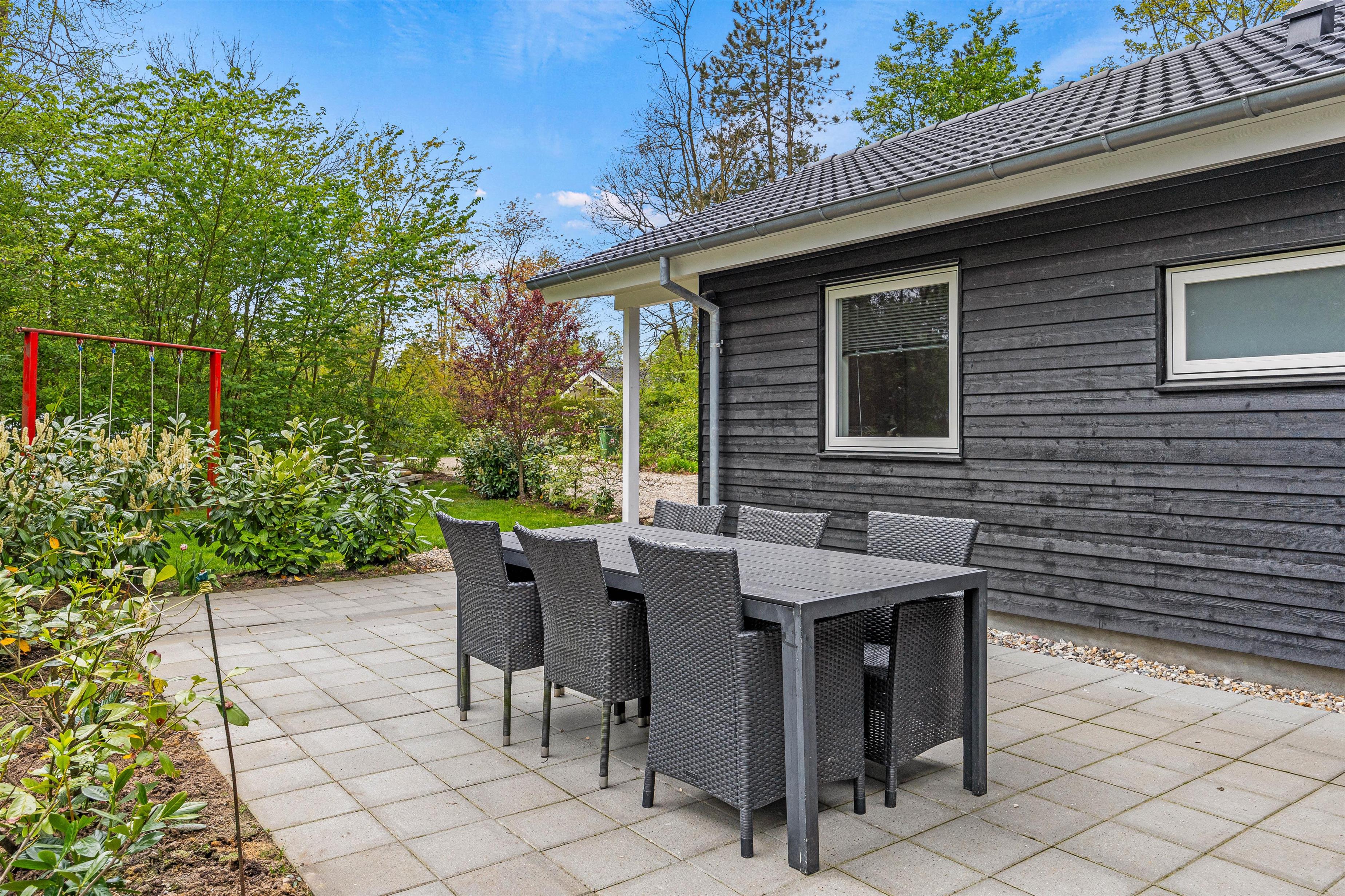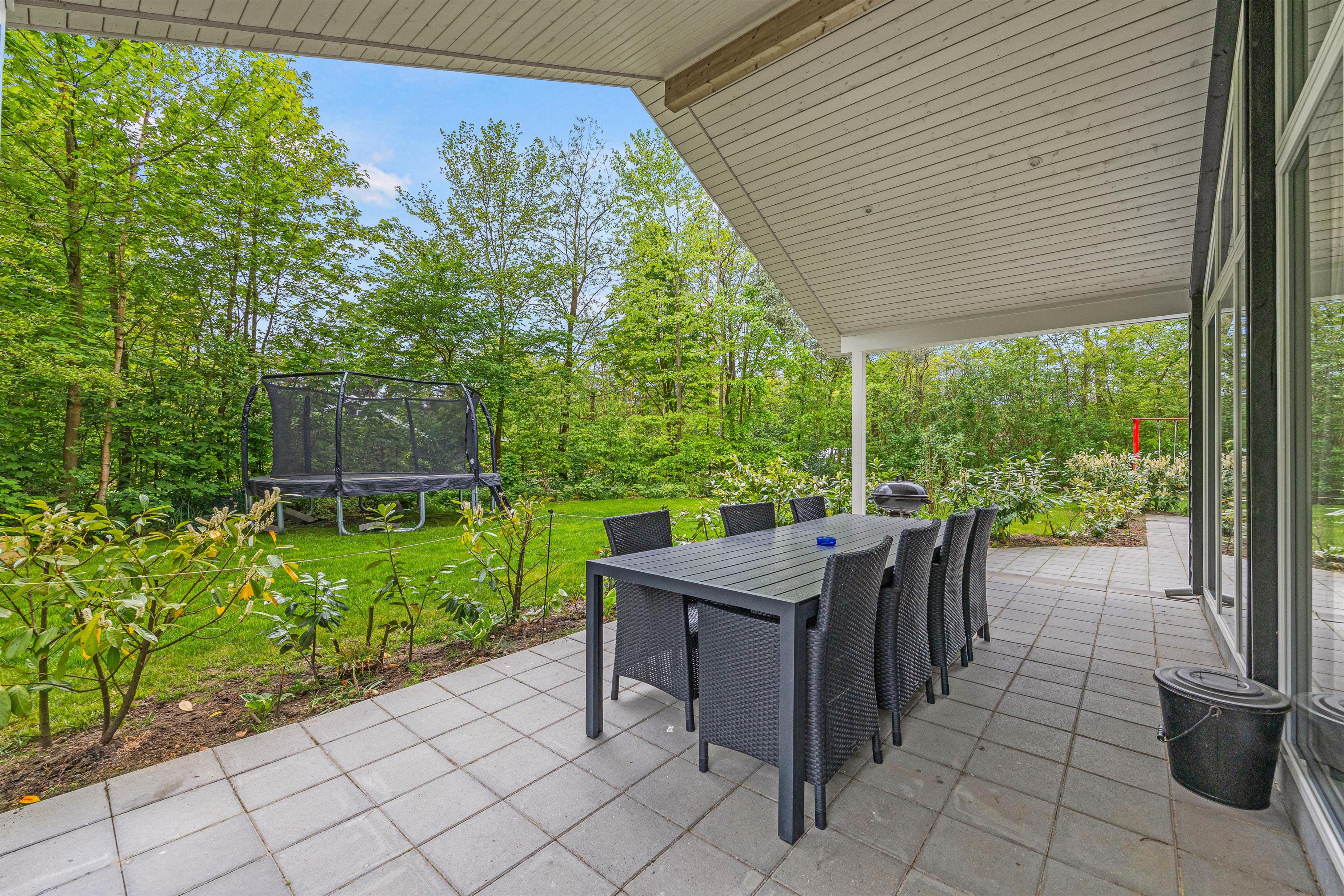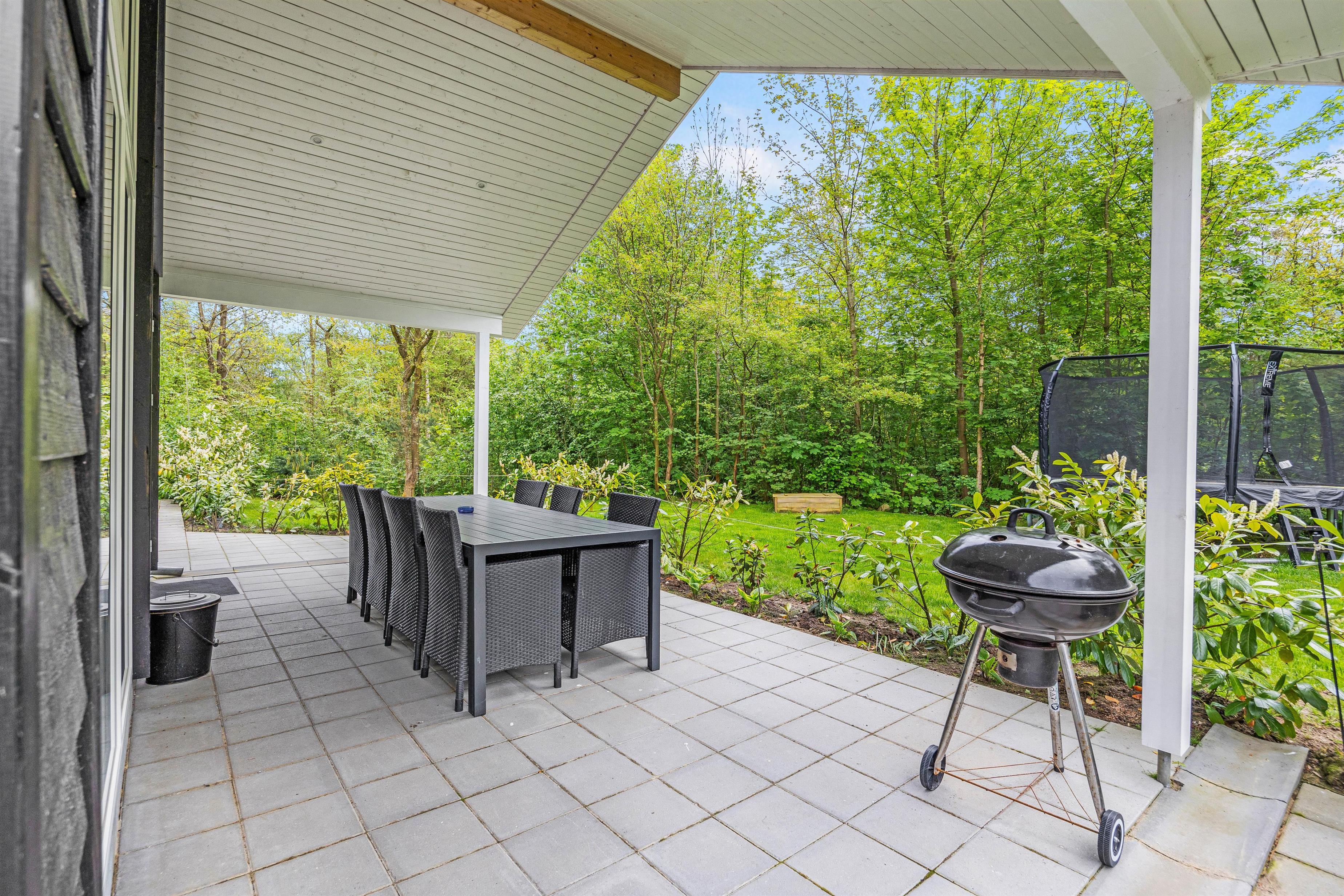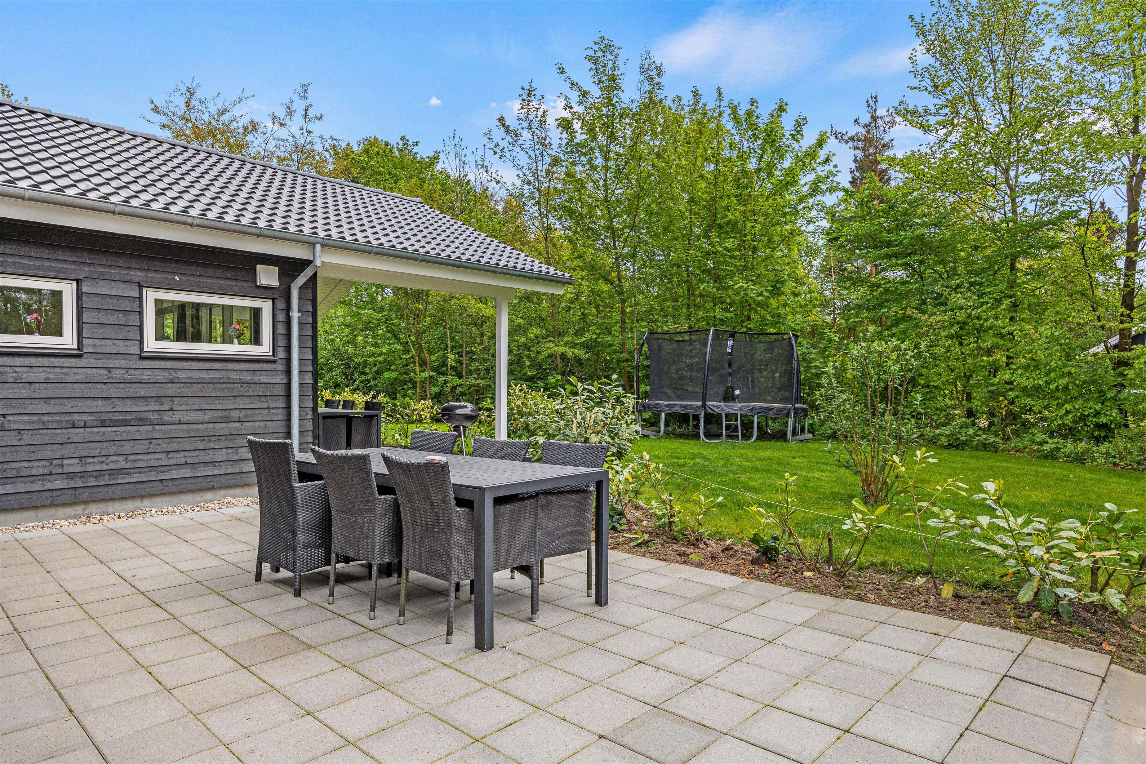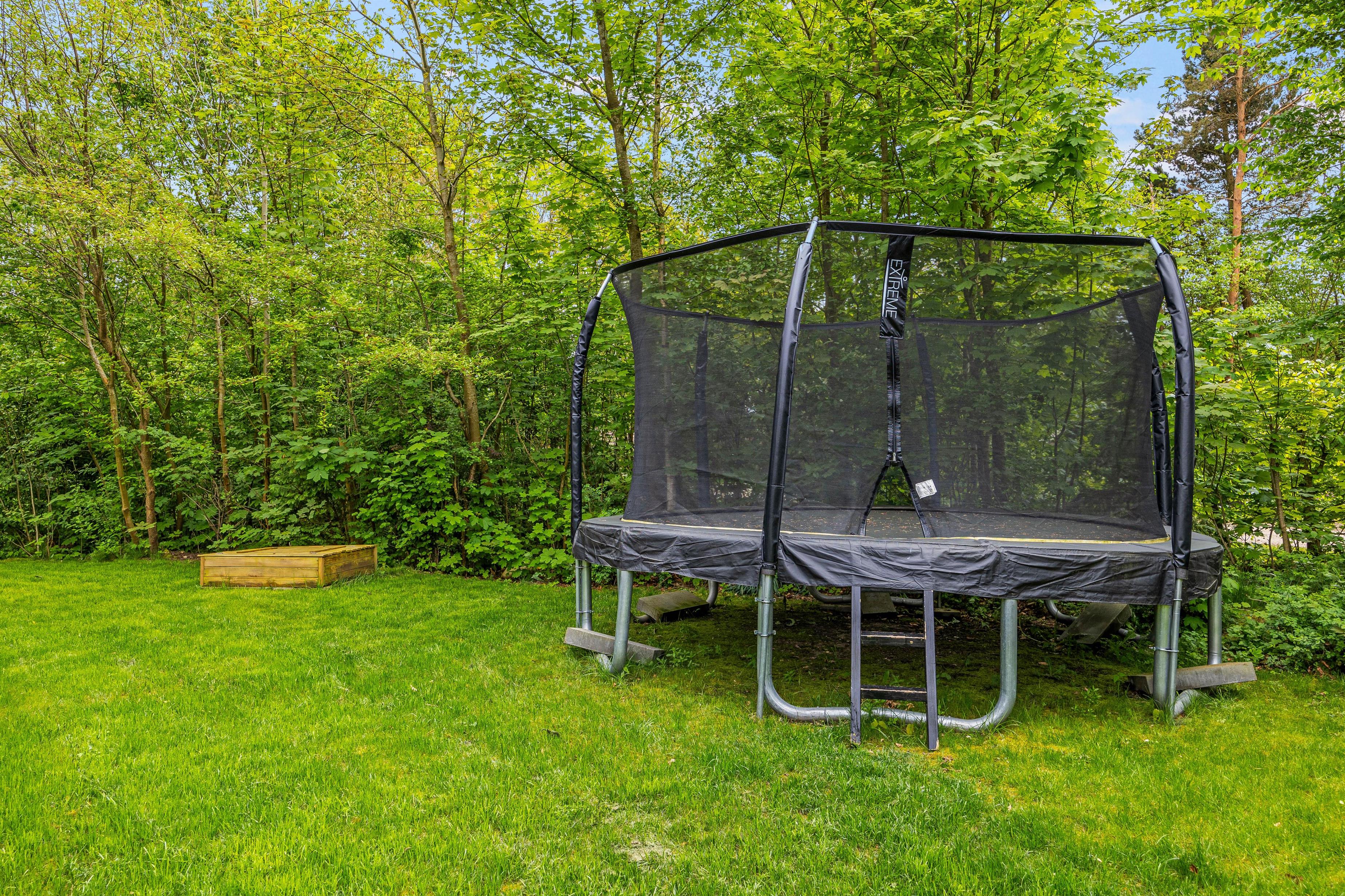 Udenfor venter jer en dejlig have, som er godt afskærmet bag fyrretræerne. Børnene vil elske udendørsfaciliteterne som gynge, sandkasse og trampolin, der inviterer til leg og eventyr i sikre rammer. Her er god plads til leg på den grønne græsplæne, og på den overdækkede terrasse kan I holde de skønneste grillaftner. I haven er der rig mulighed for at nyde udelivet og slappe af i solen!