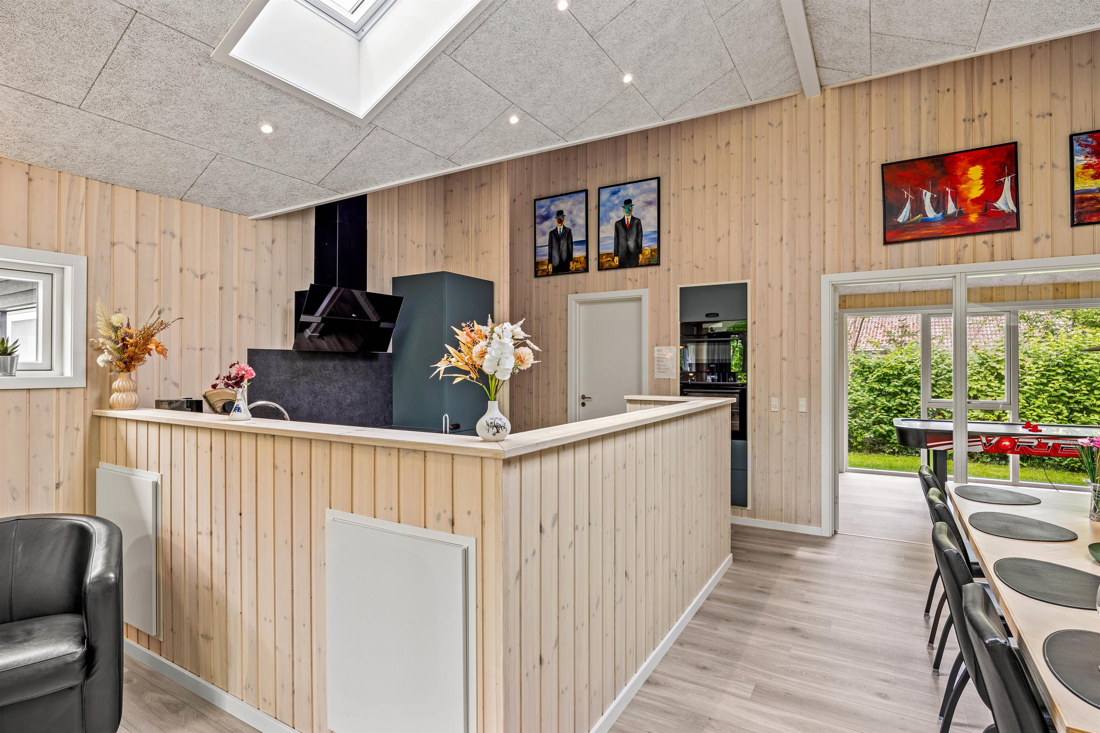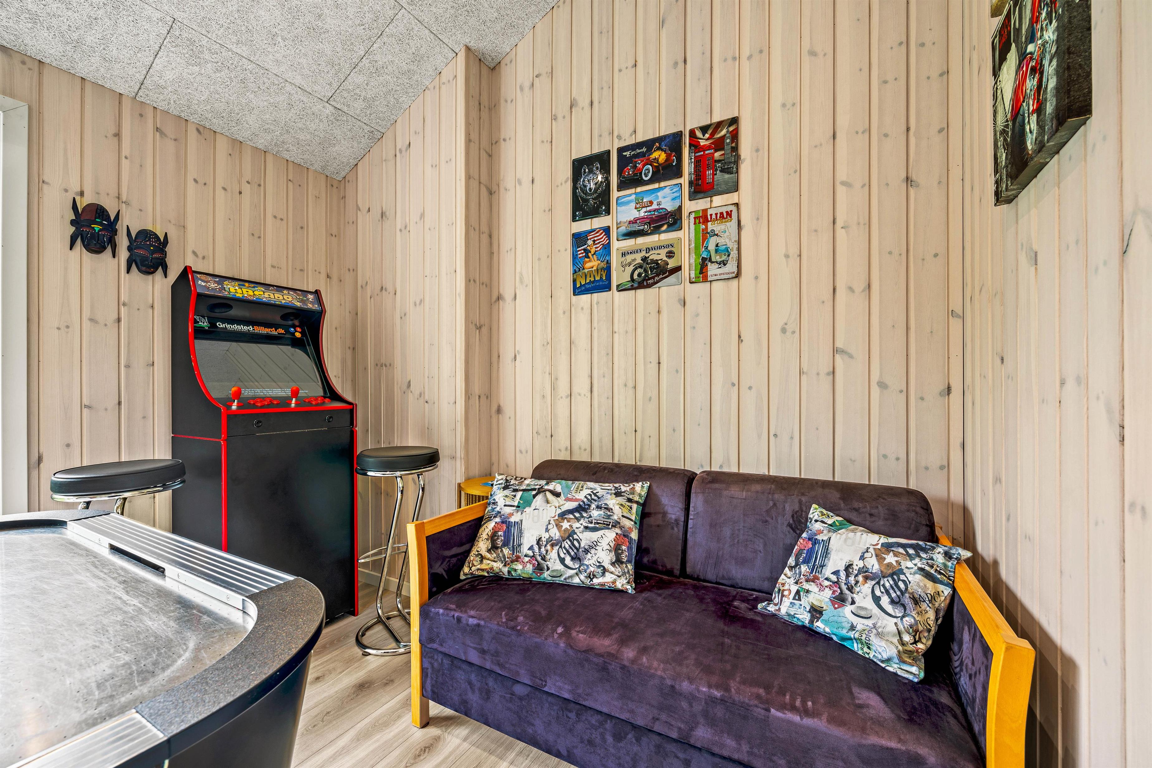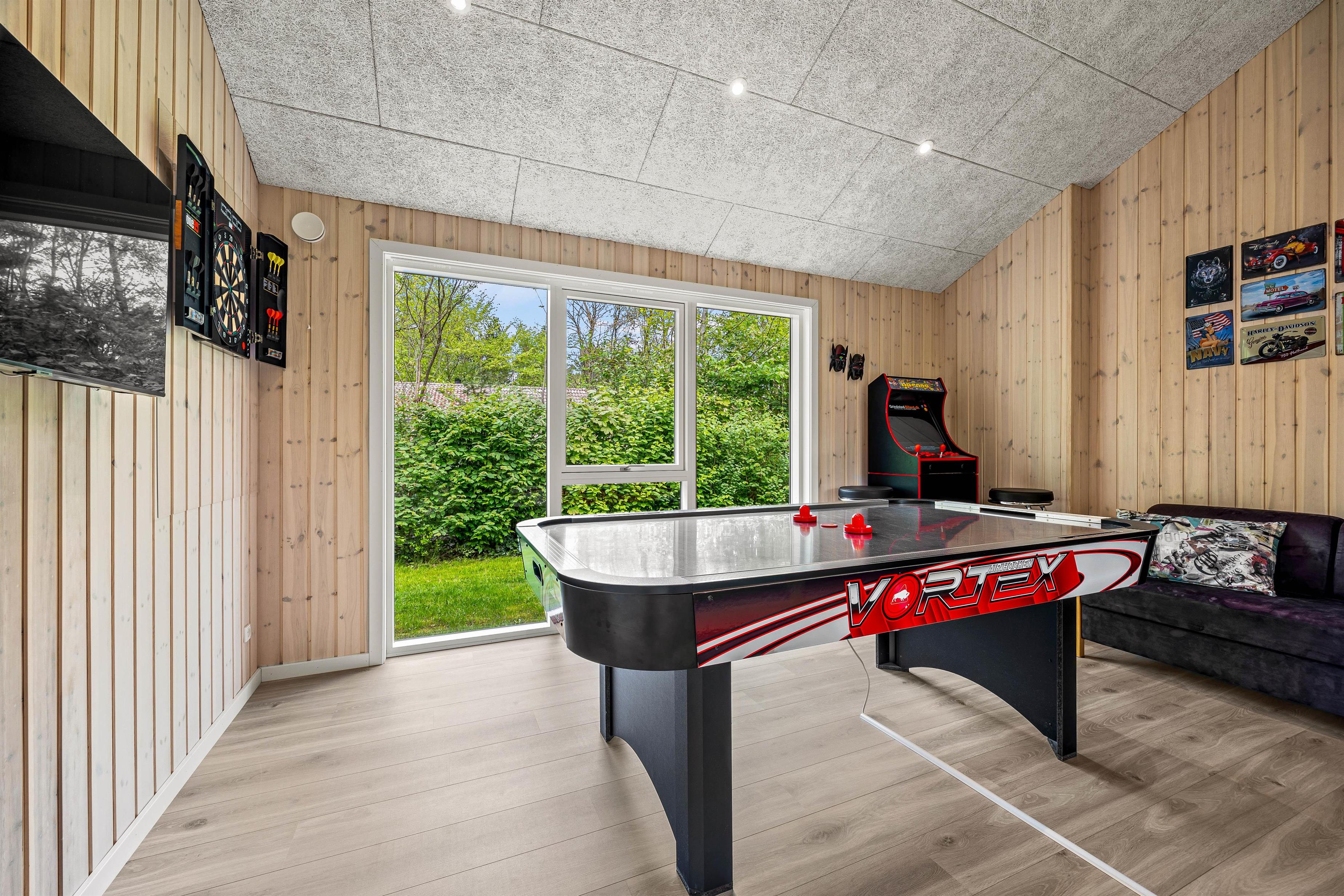 Sommerhuset på 161 m2 i Jegum Ferieland er ikke kun et sted at bo, men også et sted for leg og afslapning. Højdepunktet er poolrummet, der indeholder den 20 m2 store swimmingpool, et boblebad og den varme sauna. Her er der rig mulighed for afslapning, dykning og vandleg – et fantastisk sted uanset vejret. Aktivitetsrummet vil helt sikkert også blive nydt af alle feriegæster uanset alder, da her både er dart, airhockey og en arkademaskine. Her kan I spille om opvasken eller sætte ny high score.