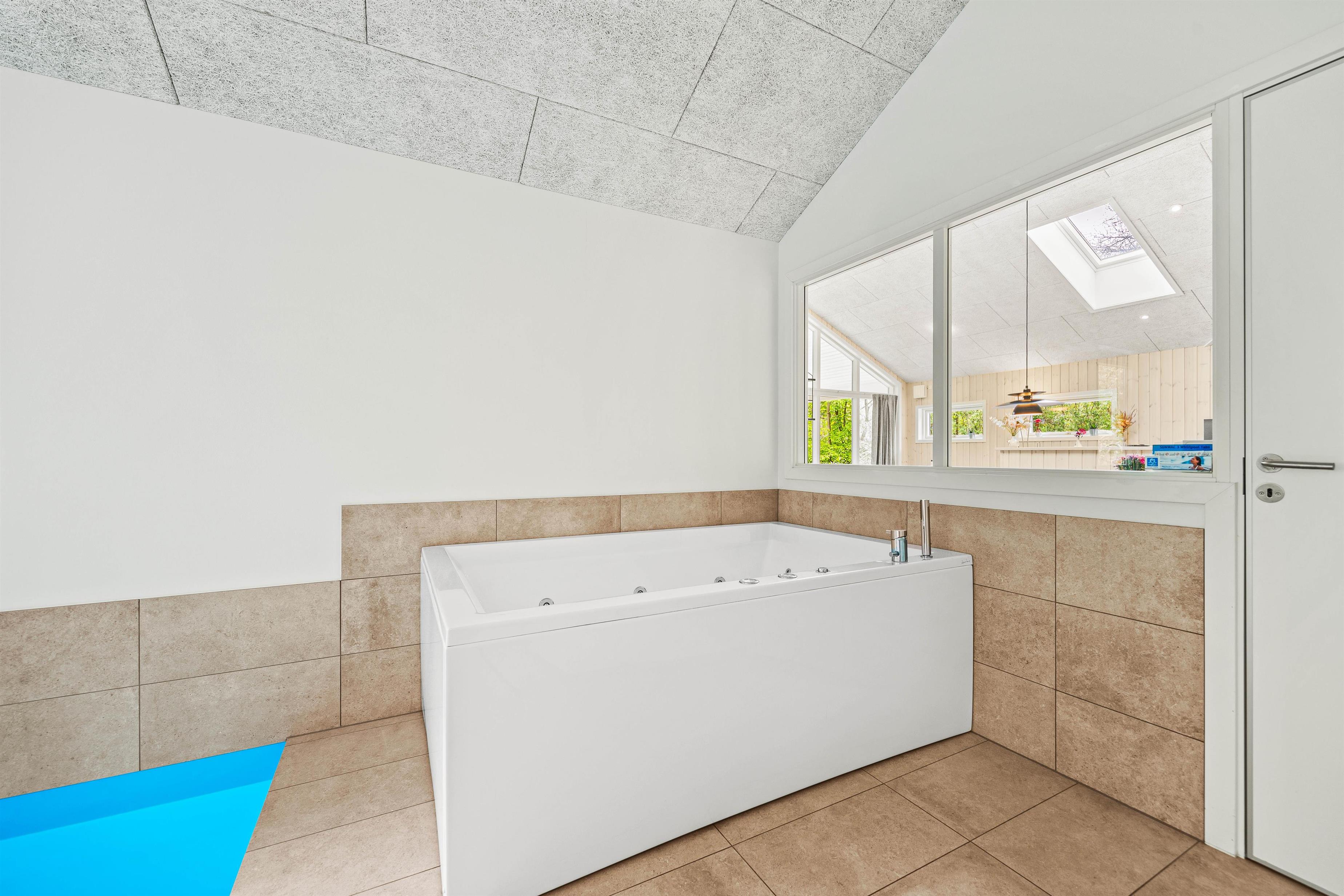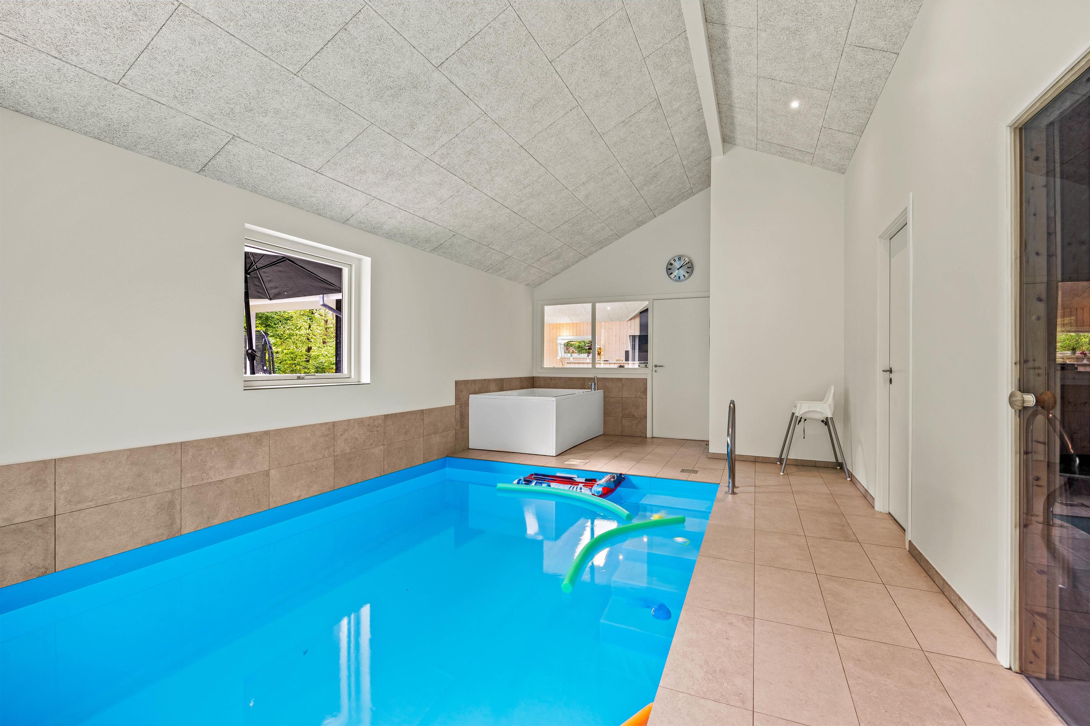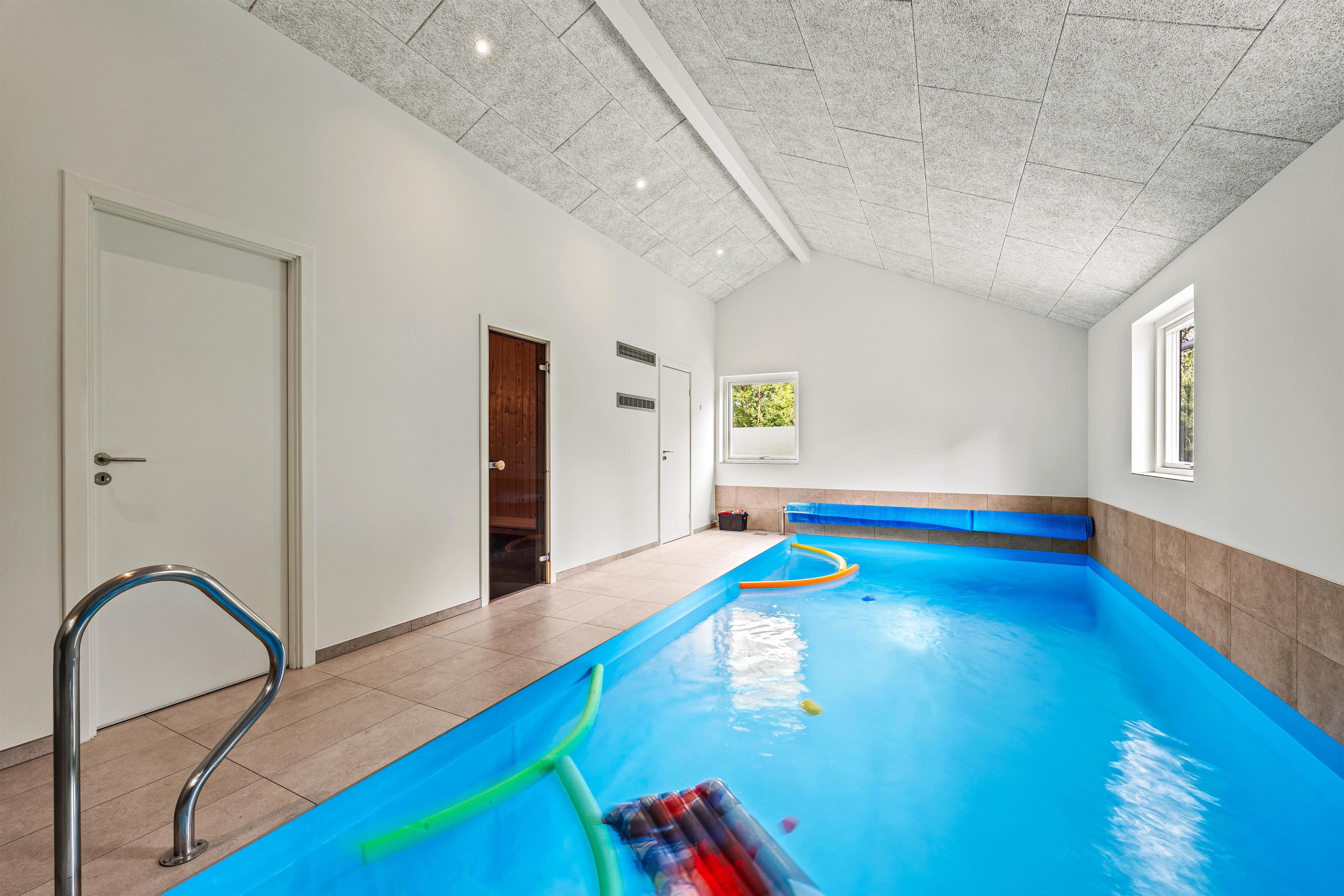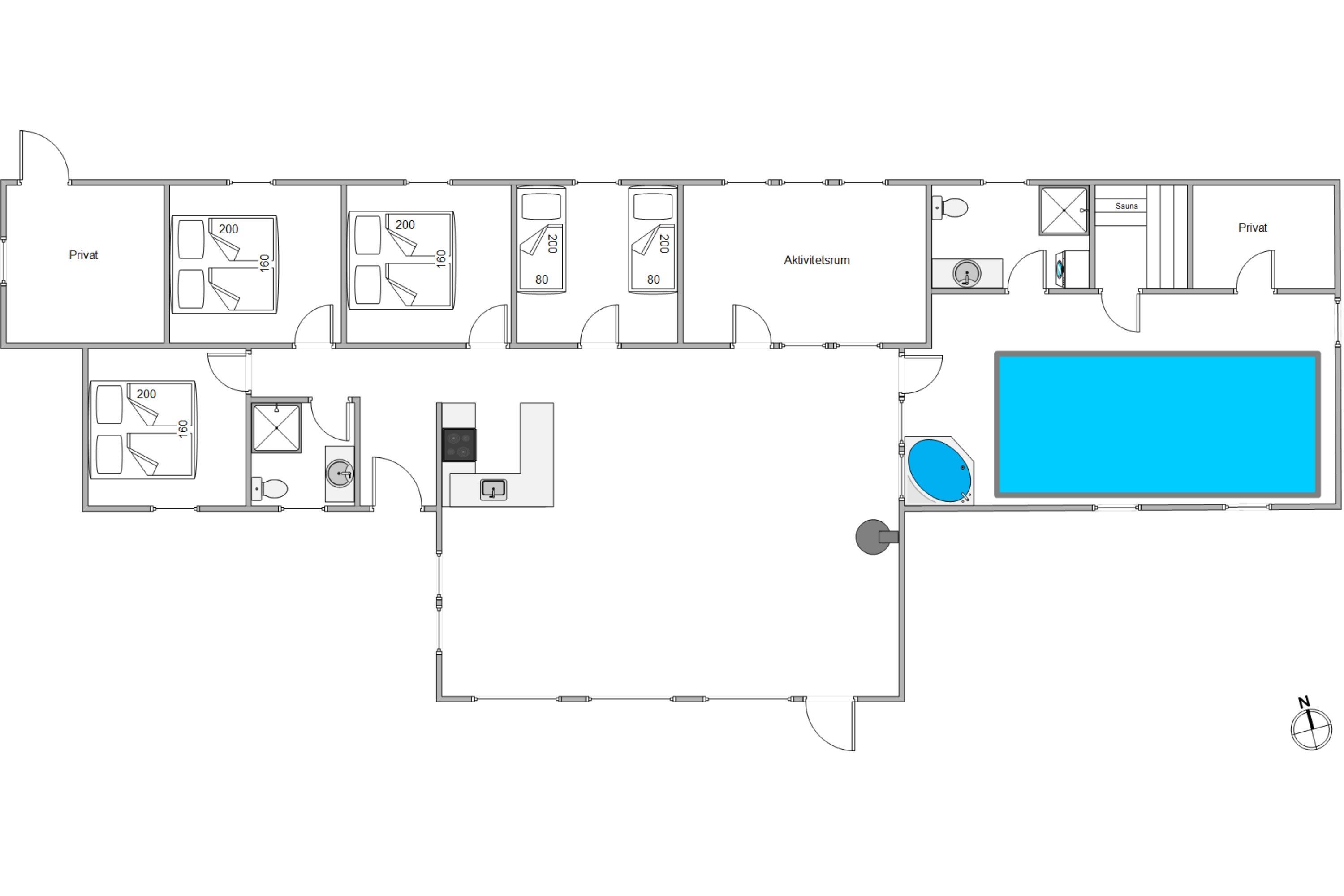 Sommerhuset på 161 m2 i Jegum Ferieland er ikke kun et sted at bo, men også et sted for leg og afslapning. Højdepunktet er poolrummet, der indeholder den 20 m2 store swimmingpool, et boblebad og den varme sauna. Her er der rig mulighed for afslapning, dykning og vandleg – et fantastisk sted uanset vejret. Aktivitetsrummet vil helt sikkert også blive nydt af alle feriegæster uanset alder, da her både er dart, airhockey og en arkademaskine. Her kan I spille om opvasken eller sætte ny high score.