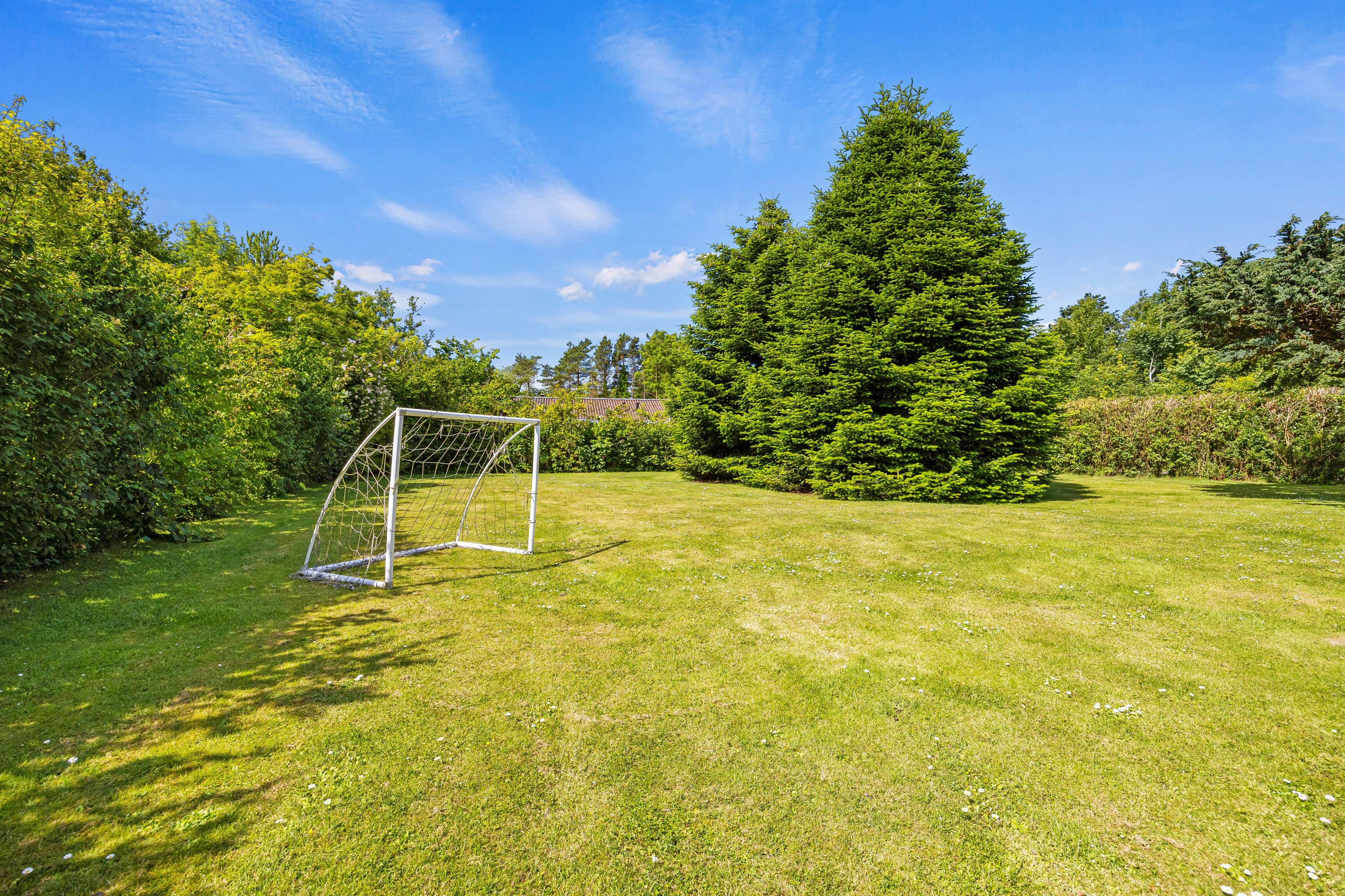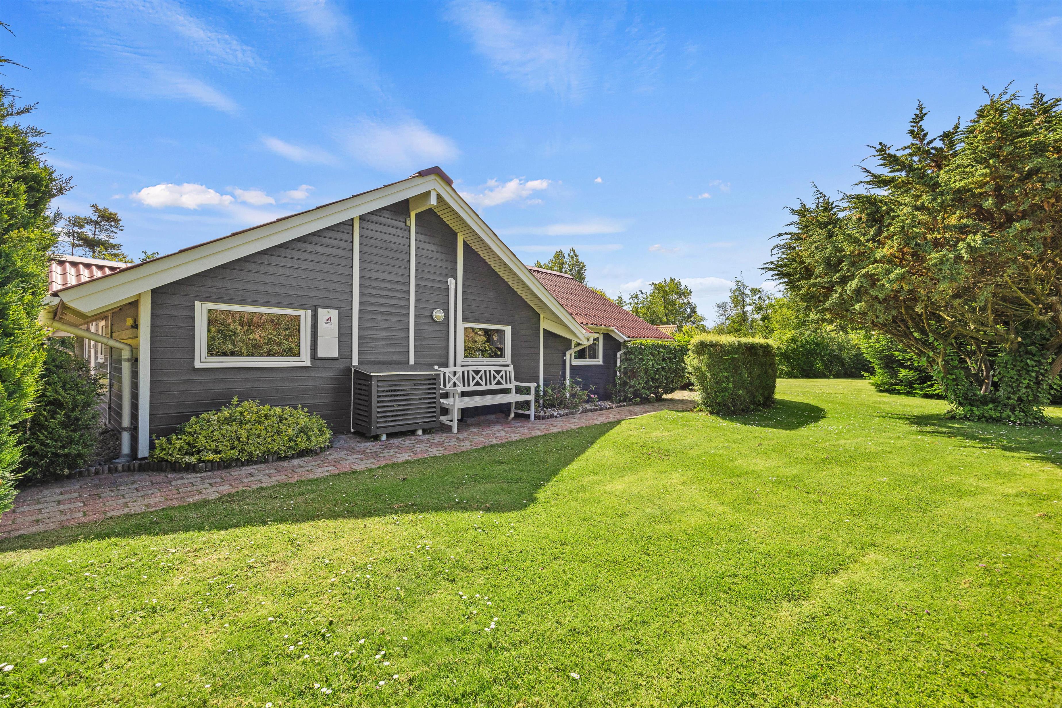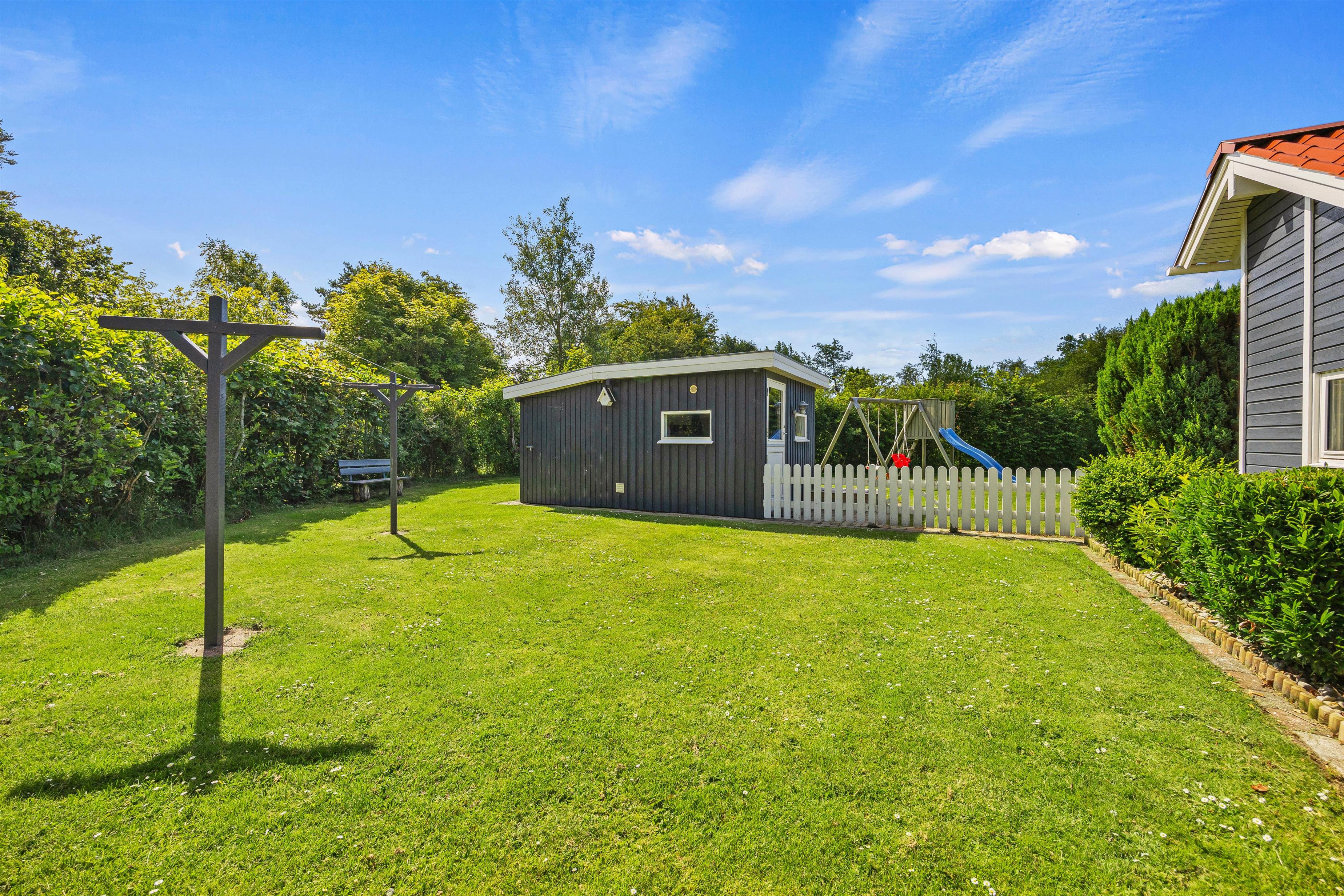 Sommerhuset ligger på en fin plænegrund med god plads til sjov og leg. Til familiens yngste er der en gynge og en sandkasse, hvor de kan tilbringe timevis med kreativ leg og aktivitet. Sommerhusets terrasse er delvist overdækket og afskærmet, hvilket giver jer mulighed for at nyde udelivet i al slags vejr. Her står havemøbler, liggestole og grill klar til jer, så I kan indrette den perfekte afslapningszone.