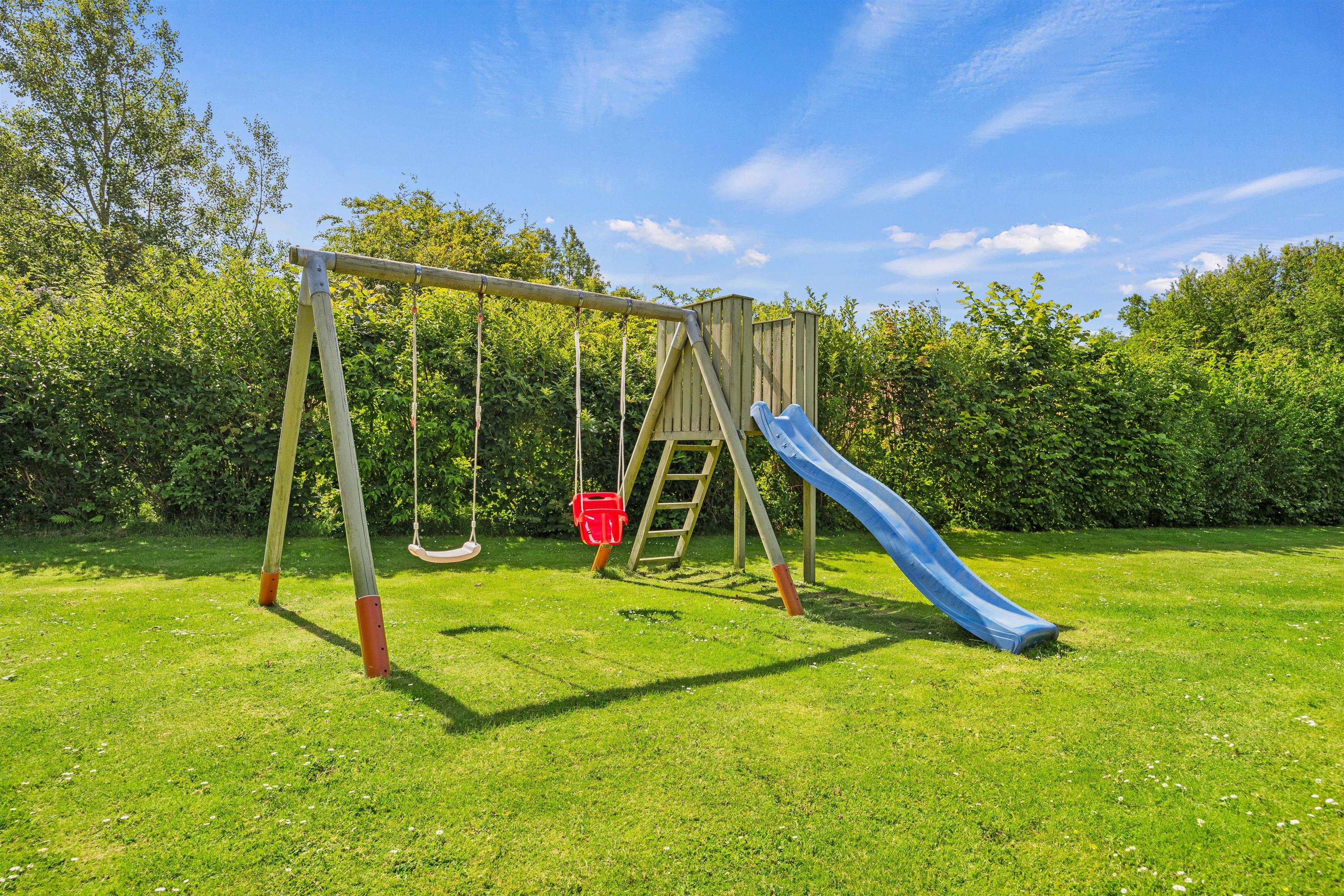 Plænegrund med gynge og sandkasse
