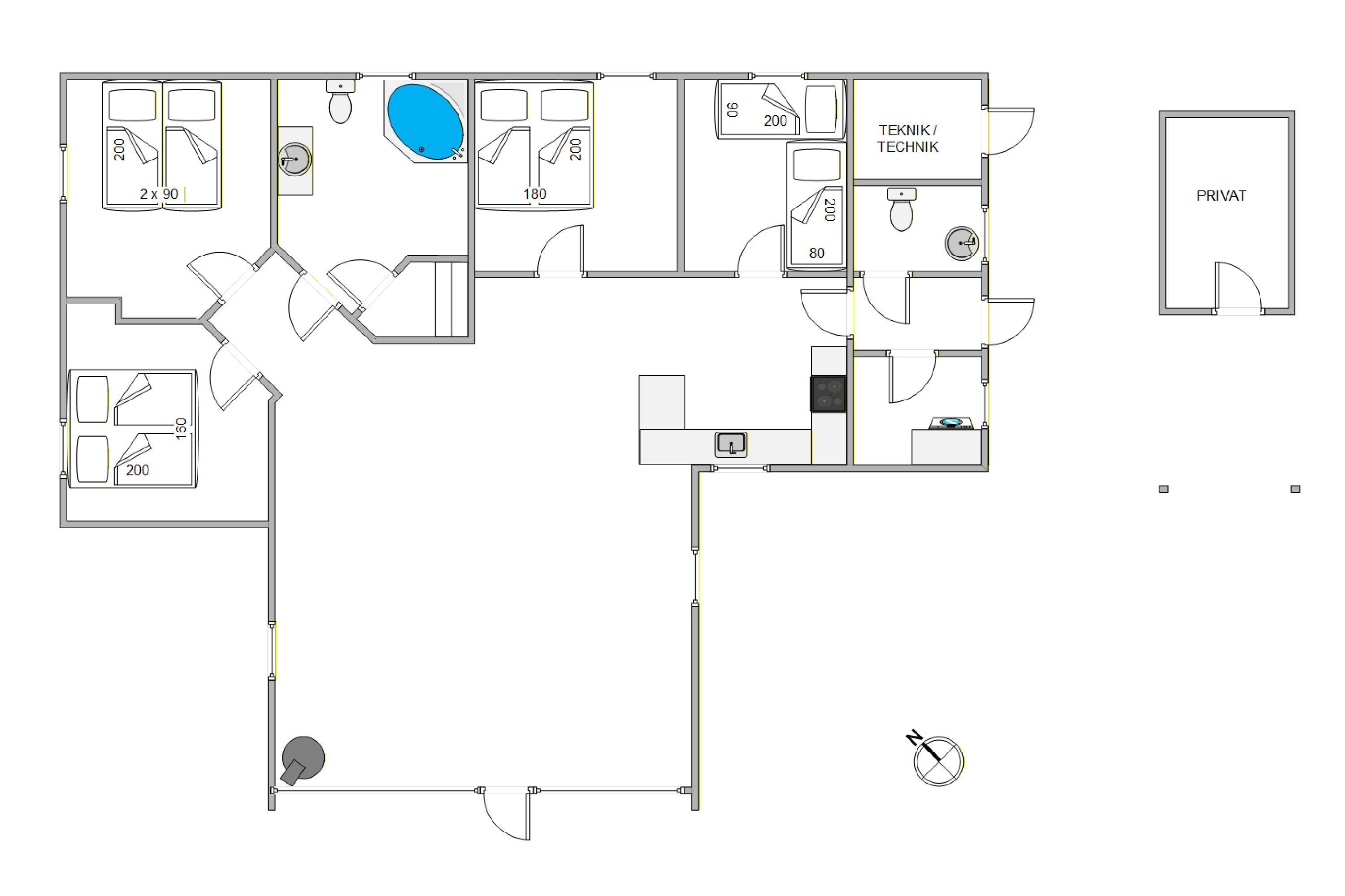 Sommerhusets 4 soveværelser fordeler 8 sovepladser og sikrer, at alle har et behageligt sted at hvile. Det er altså oplagt for både familier og vennegrupper, der ønsker en hyggelige base ved Vestkysten. Derudover finder I både 1 badeværelse og 1 gæstetoilet i sommerhuset. Badeværelset er udstyret med både sauna og tømmespa, der sammen med gulvvarmen skaber en behagelig og afslappende oplevelse. Efter gode lange dage med masser oplevelser, kan I roligt overlade vasketøjet til sommerhusets vaskemaskine og tørretumbler som står klar til brug.