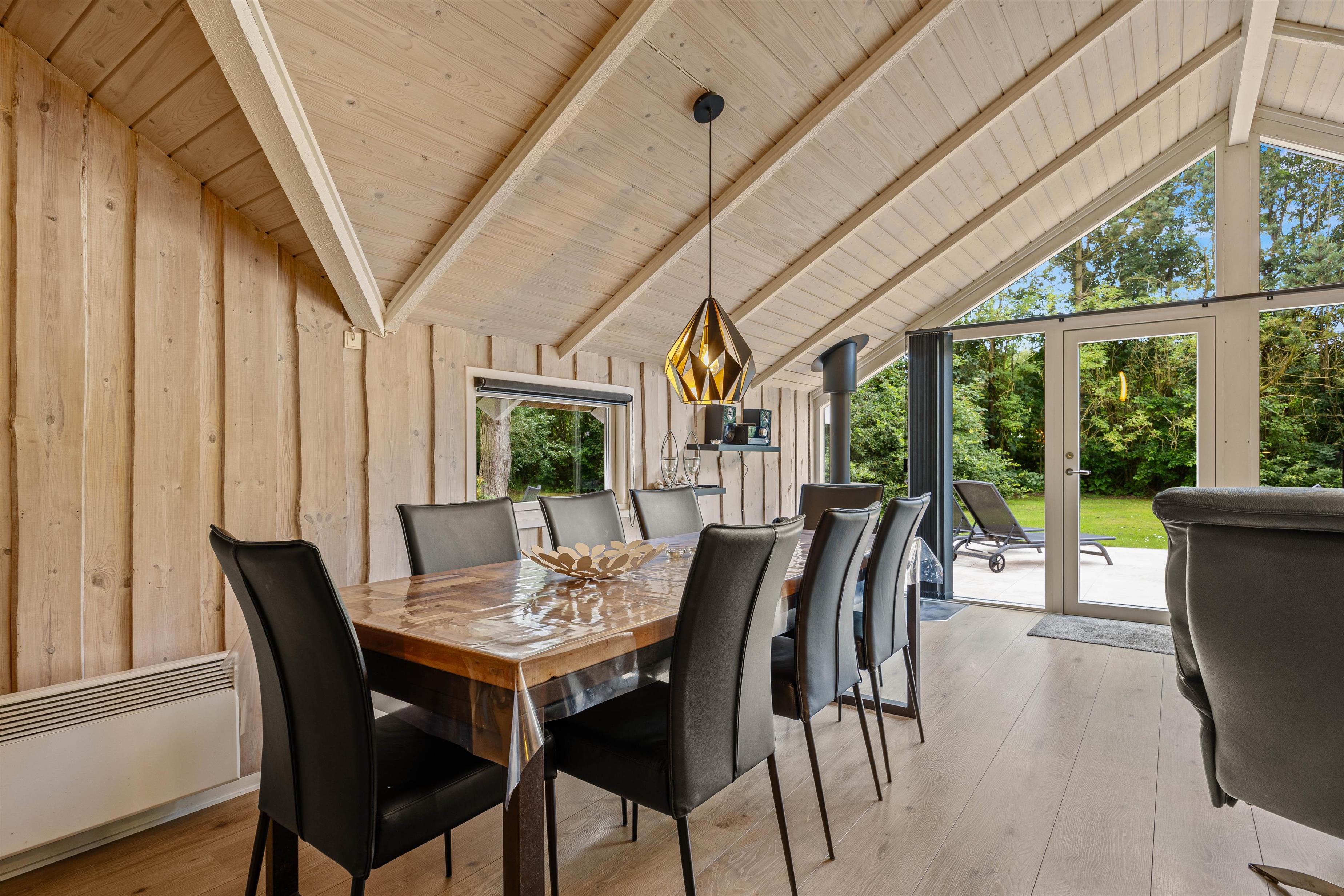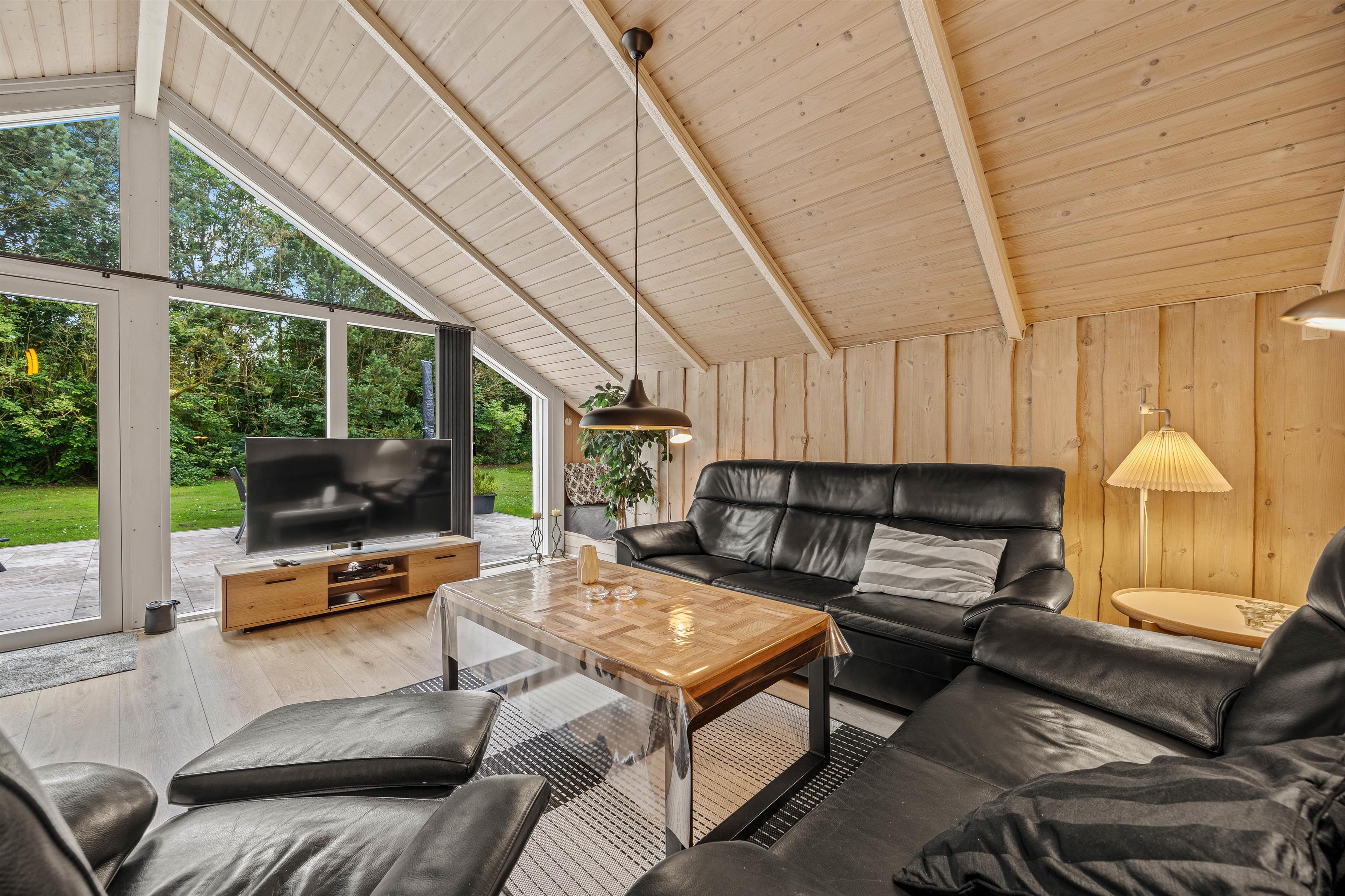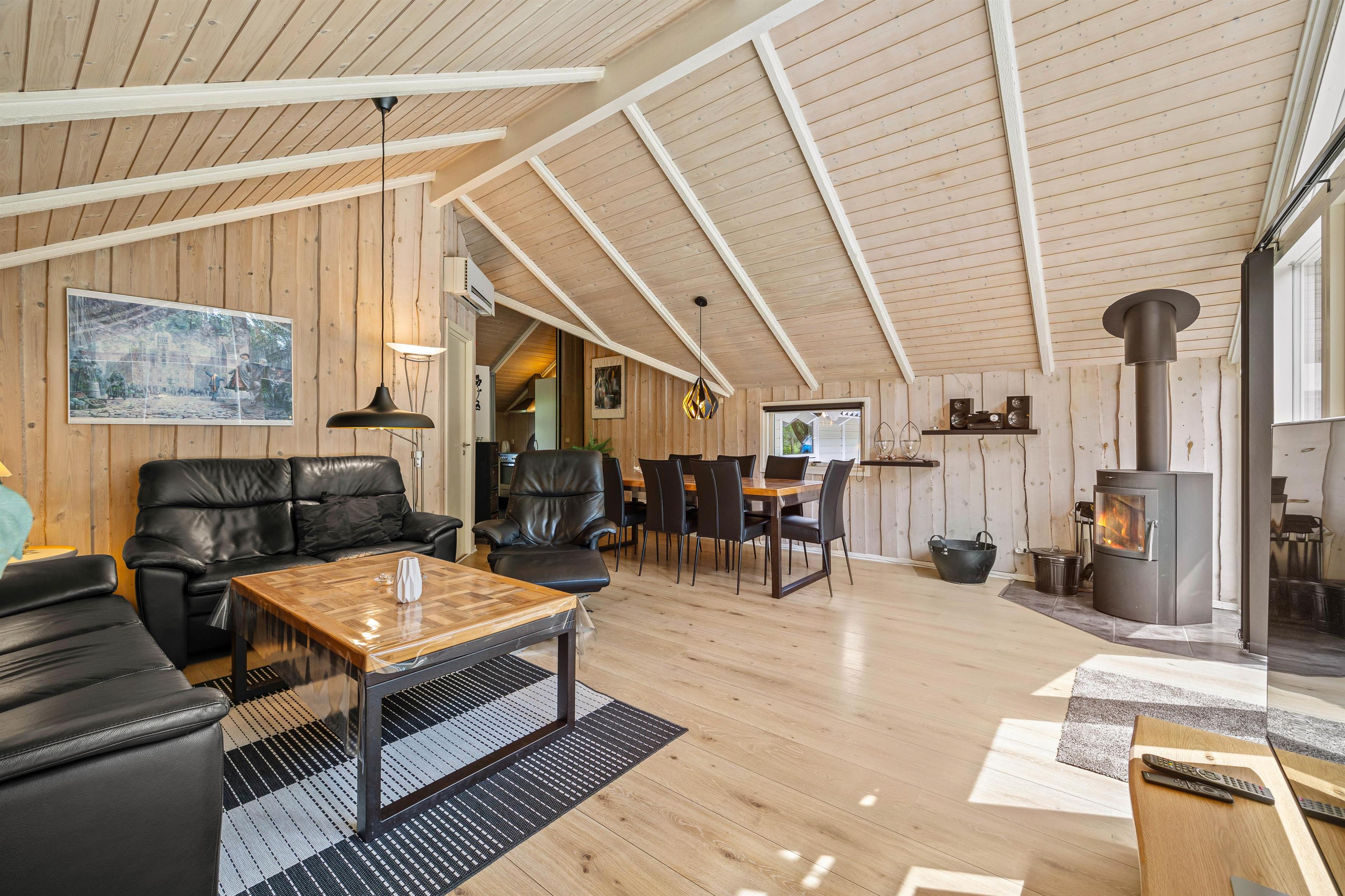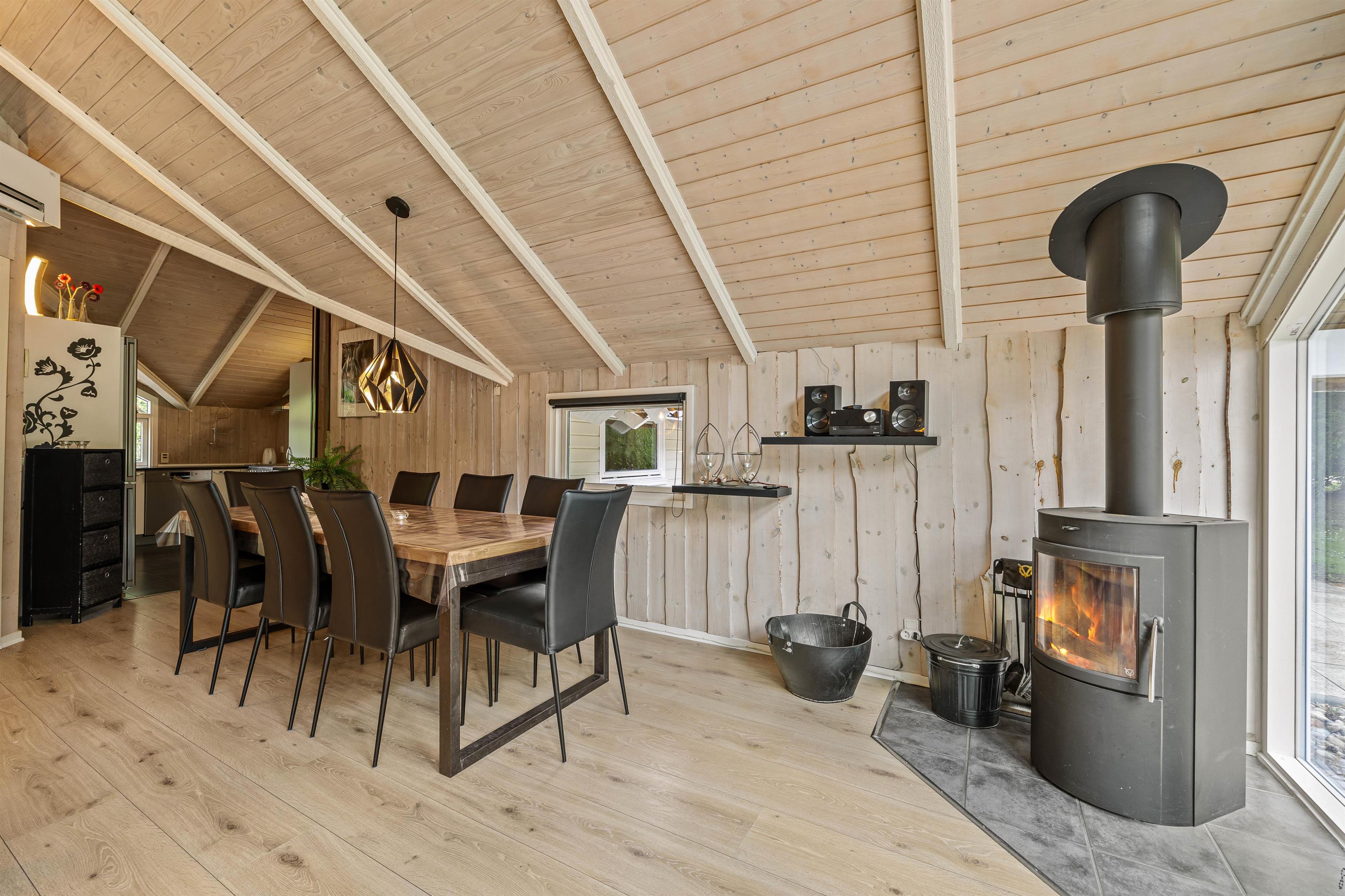 Indenfor i sommerhuset mødes I af en varm og indbydende atmosfære, der straks får jer til at føle jer hjemme. Den hyggelige stue, centreret omkring en charmerende brændeovn, inviterer til afslappende aftener med knitrende flammer og hyggelige stunder sammen.
