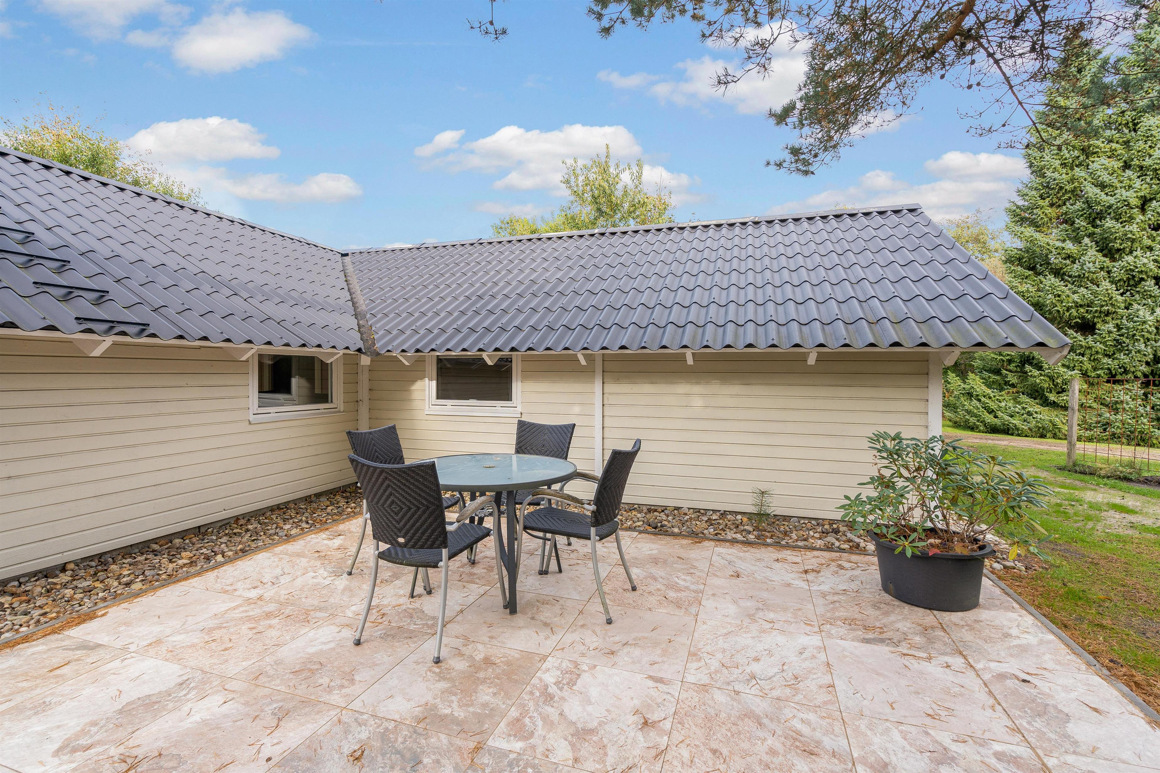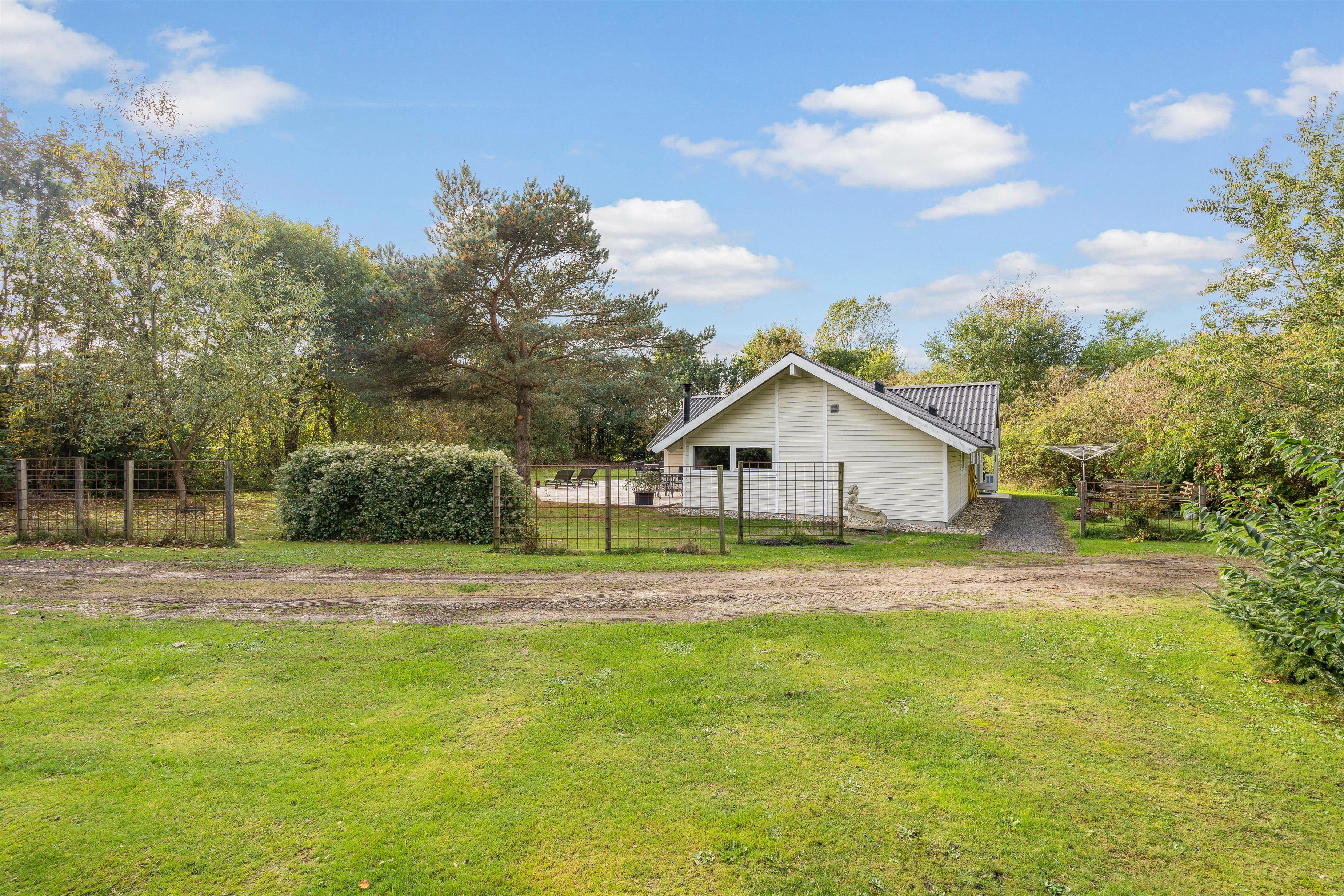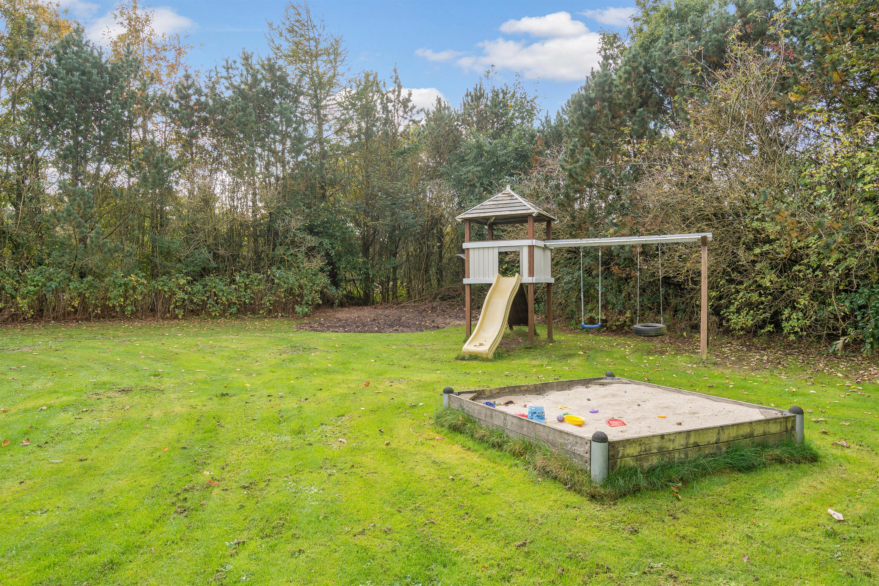 Sommerhusets udendørs areal er et herligt sted for både børn og voksne. Med en rummelig grund på 1584 m2 er der masser af plads til udendørs aktiviteter og afslapning. Den store plænegrund indbyder til boldspil og leg, mens sandkassen og gyngen byder på sjov for de yngre familiemedlemmer.