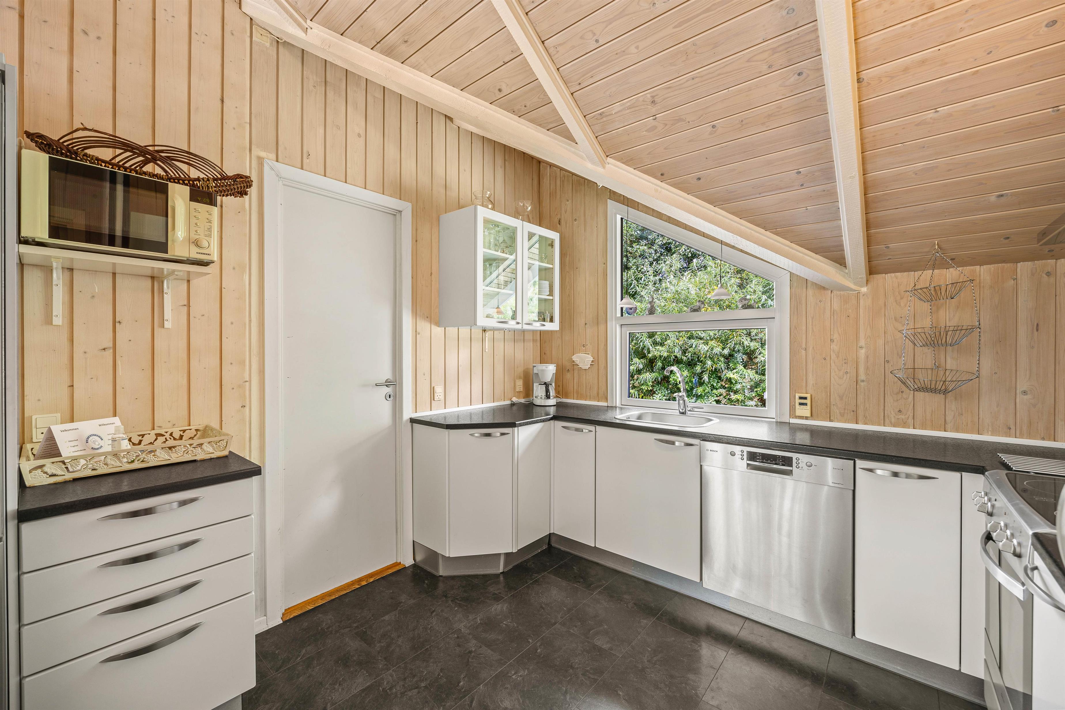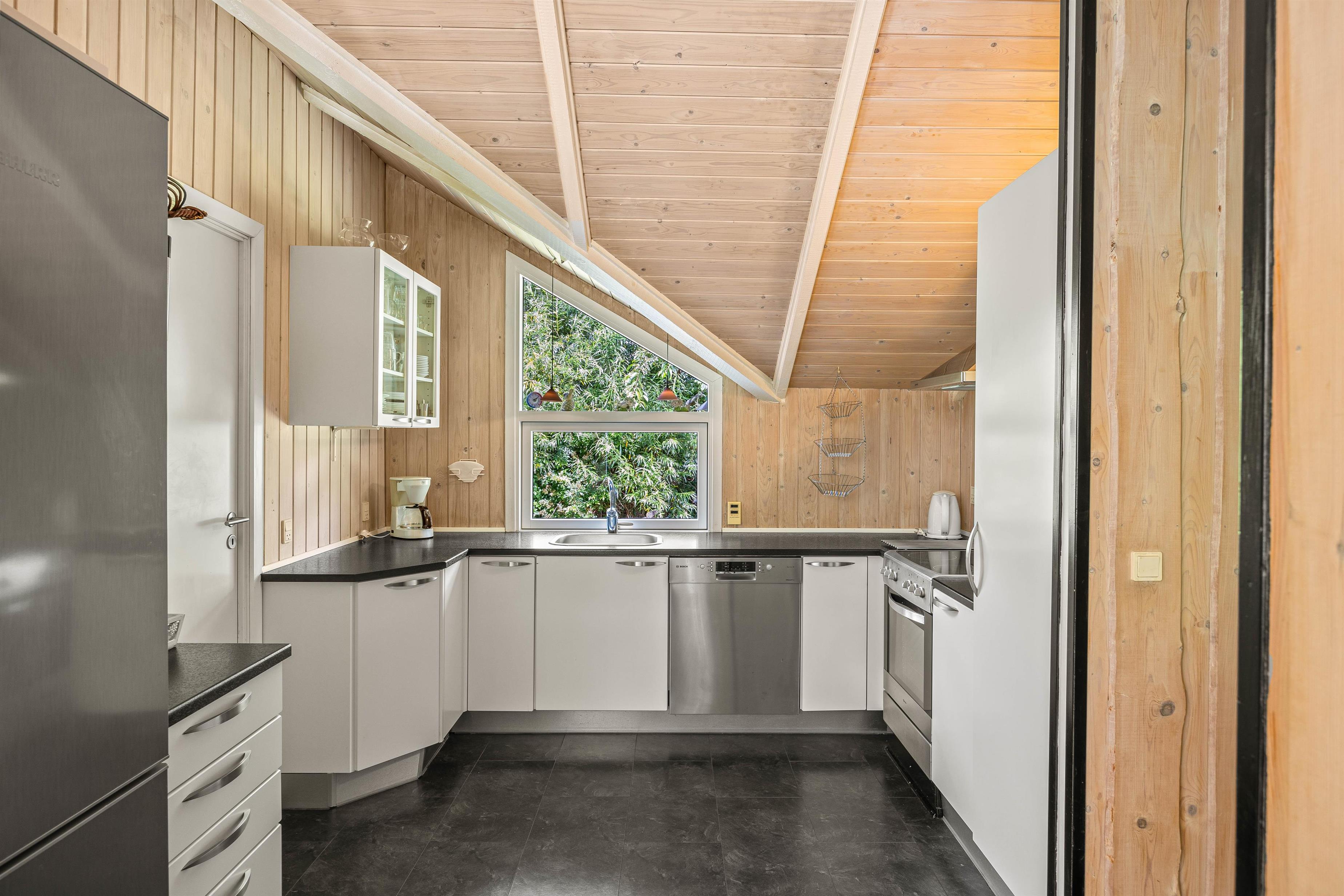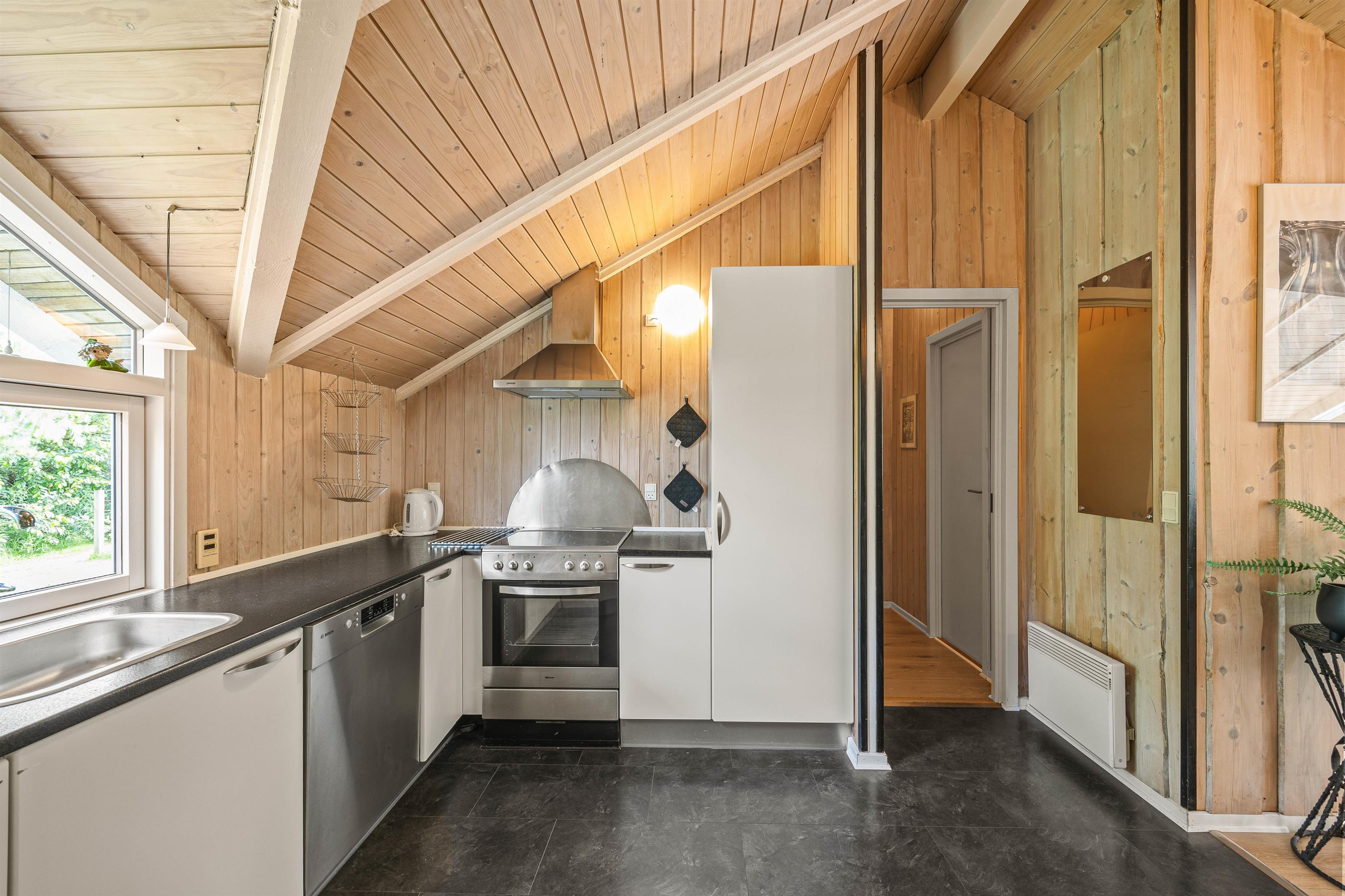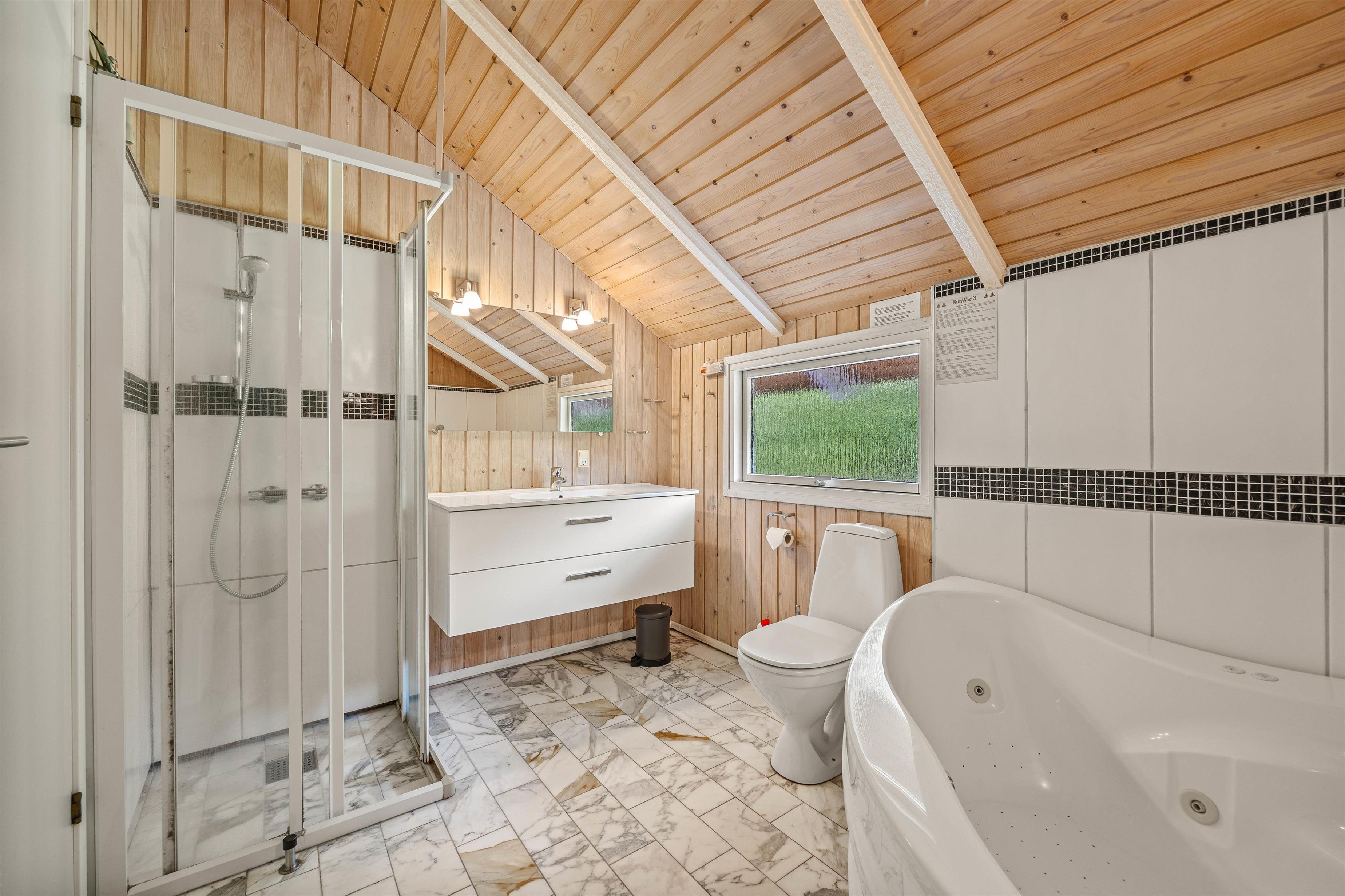 Et af højdepunkterne er husets badeværelse, der ikke kun er funktionelt, men også byder på en sauna samt en lækker tømmespa, perfekt til at forkæle jer selv efter en dag i naturen. Når det kommer til praktiske gøremål, letter vaskemaskinen og opvaskemaskinen husarbejdet, så I kan fokusere på at nyde jeres ferie.