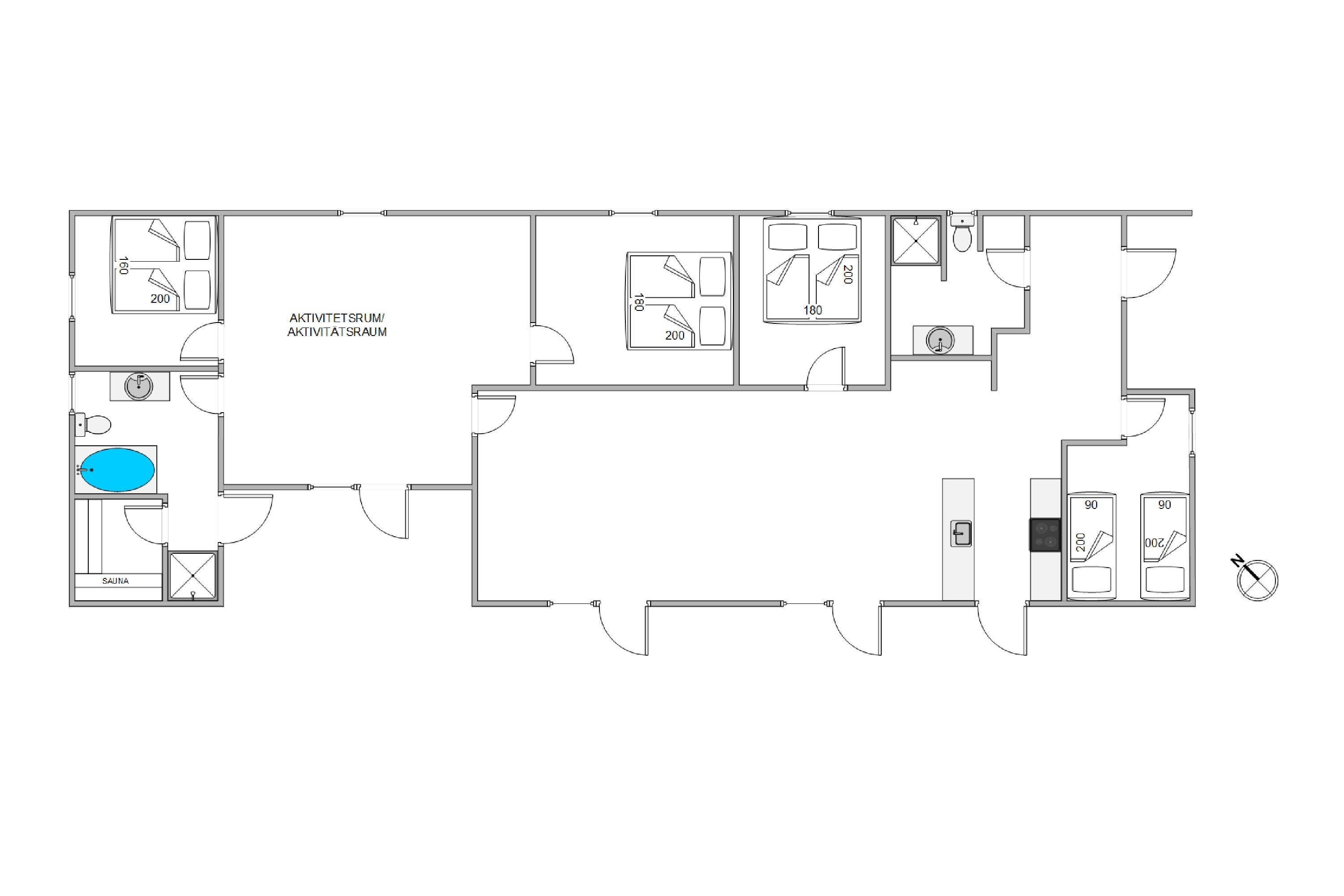Der er adgang til 2 ud af de i alt 4 rummelige soveværelser direkte fra aktivitetsrummet, hvor begge er indrettet med komfortable dobbeltsenge, hvor I kan se frem til en god nats søvn. De sidste 2 soveværelser er placeret i henholdsvis køkkenet og gangen. Sommerhuset råder også over 2 velindrettede badeværelser; det ene lokker med et afslappende badekar og en dampende sauna, hvor I kan belønne jer selv med lidt ekstra luksus og velvære under ferien.