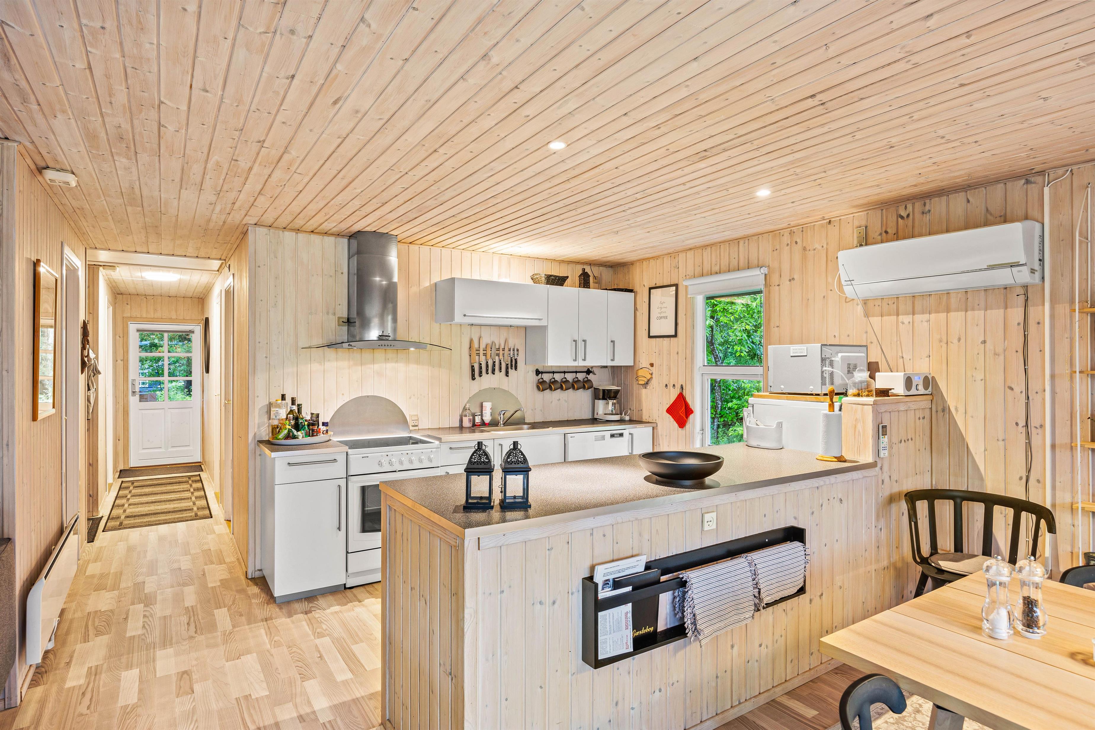 Køkkenet er udstyret med en opvaskemaskine, så oprydningen efter måltider er nem, og I hurtigt kan komme tilbage til hyggen. Stuen har en hyggelig brændeovn, som skaber en dejlig atmosfære på de kølige aftener.