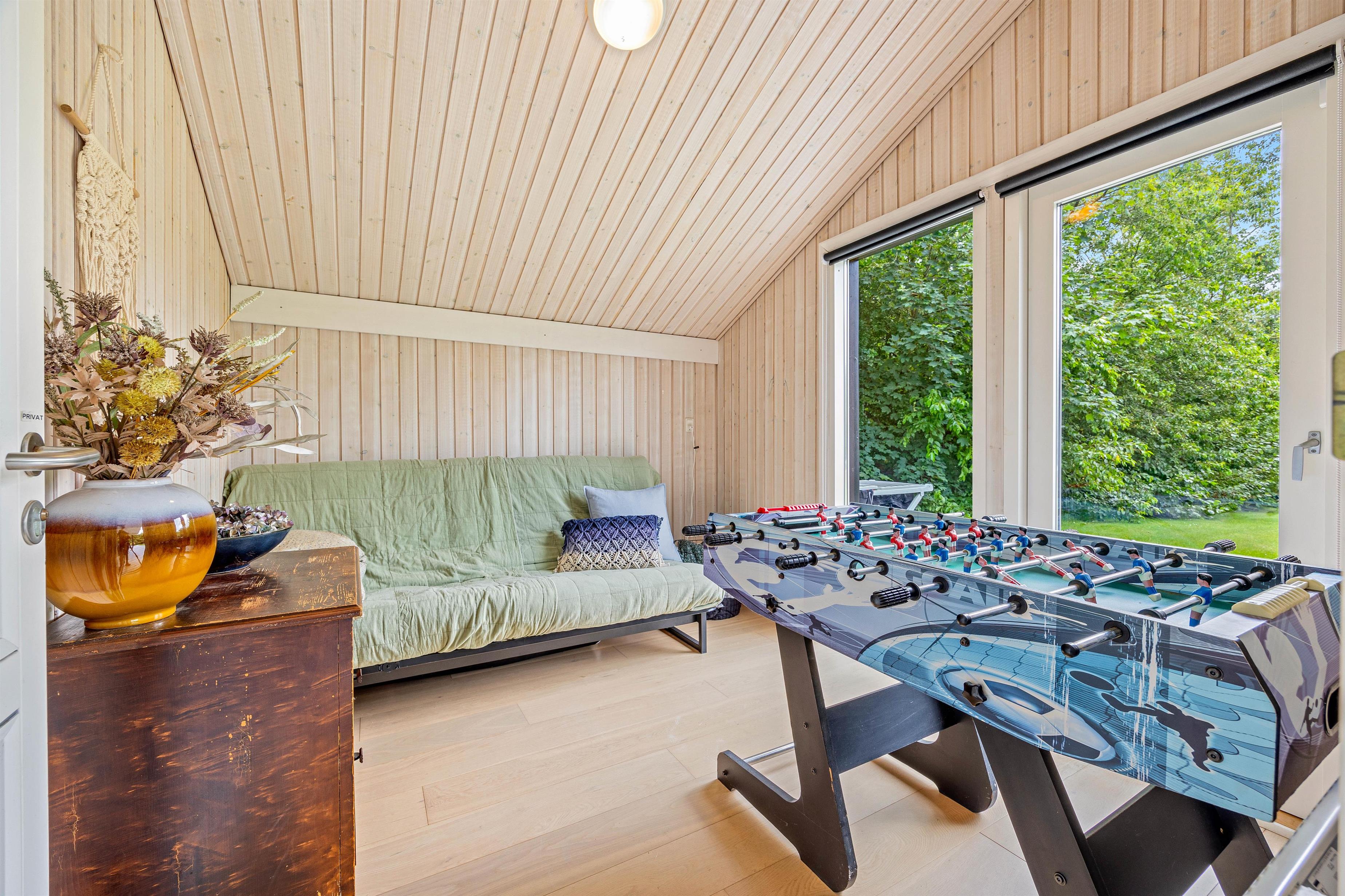 Sovepladserne er fordelt på 4 værelser, hvilket giver god plads og privatliv til alle. 3 lyse soveværelser i selve sommerhuset – 2 med dobbeltsenge og ét med 2 enkeltsenge – samt et hyggeligt anneks med 2 sovepladser. Annekset er desuden indrettet med smart-TV og bordfodbold, og bliver hurtigt et populært fristed for både børn og unge - eller dem, der bare vil have deres eget lille helle.