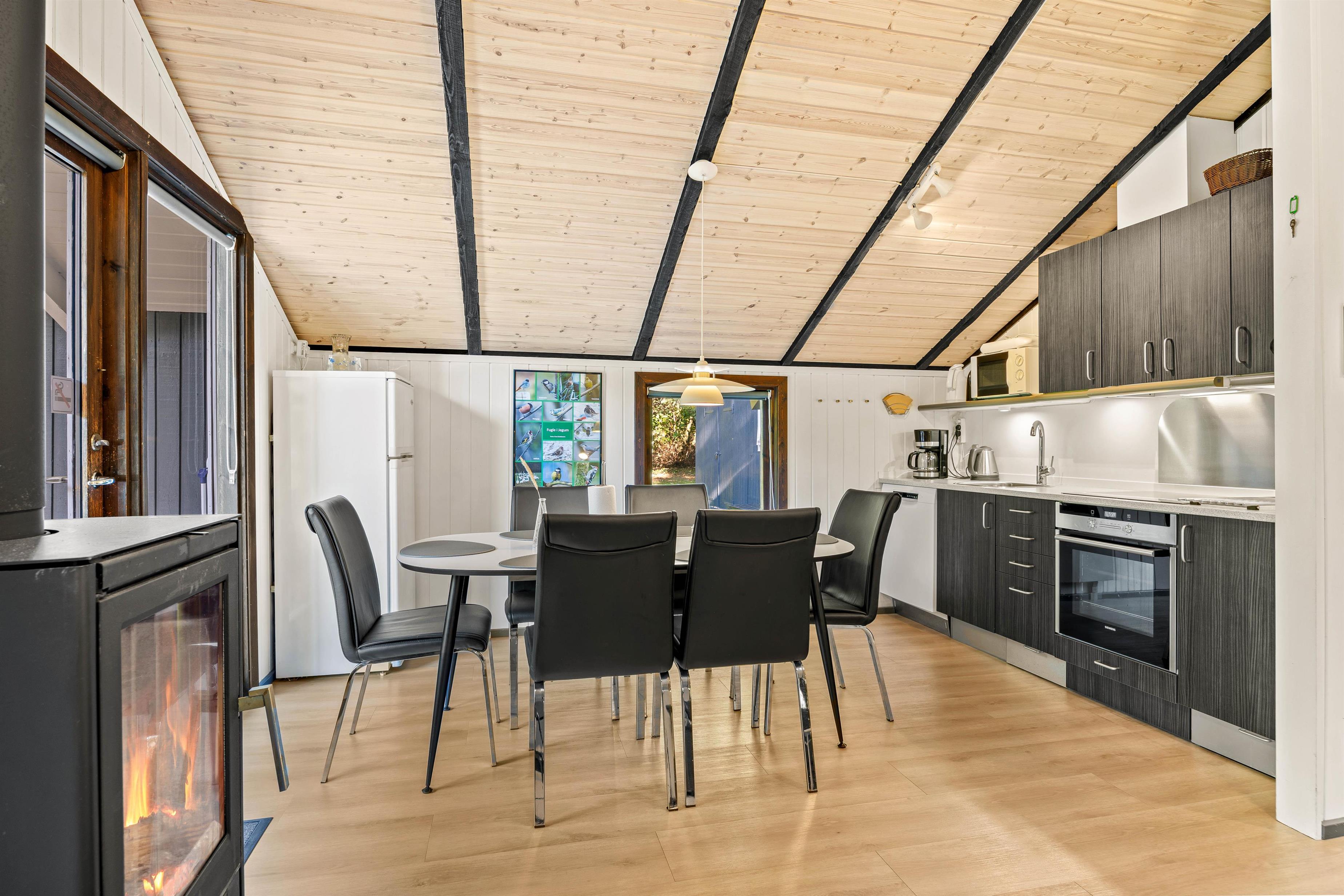 Feriehuset gennemgik i 2023 en renovering og fremstår lys og rummelig med de nødvendige faciliteter, der gør jeres ophold endnu mere behageligt. Her kan I nyde hyggelige aftener sammen med brætspil eller en god film, imens brændeovnen sørger for en behagelig varme og en hyggelig atmosfære. Det velindrettede køkken med opvaskemaskine giver jer mulighed for at tilberede jeres yndlingsretter uden at skulle tænke på besværlig opvask.
