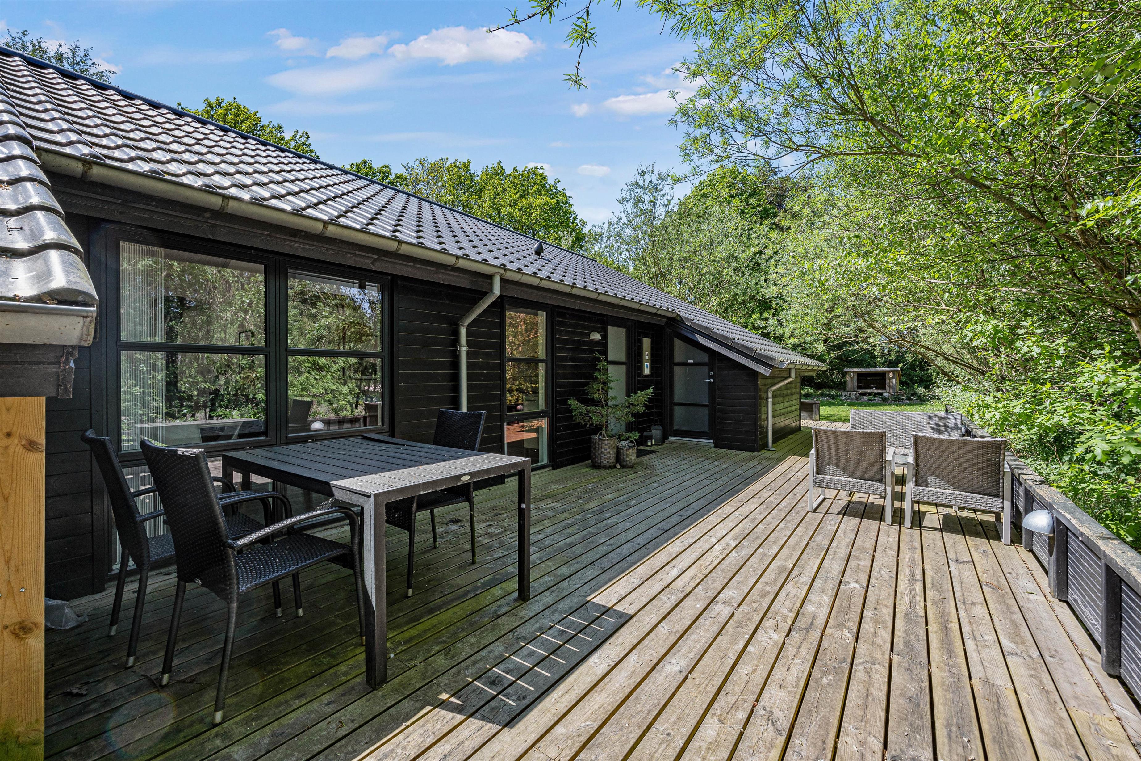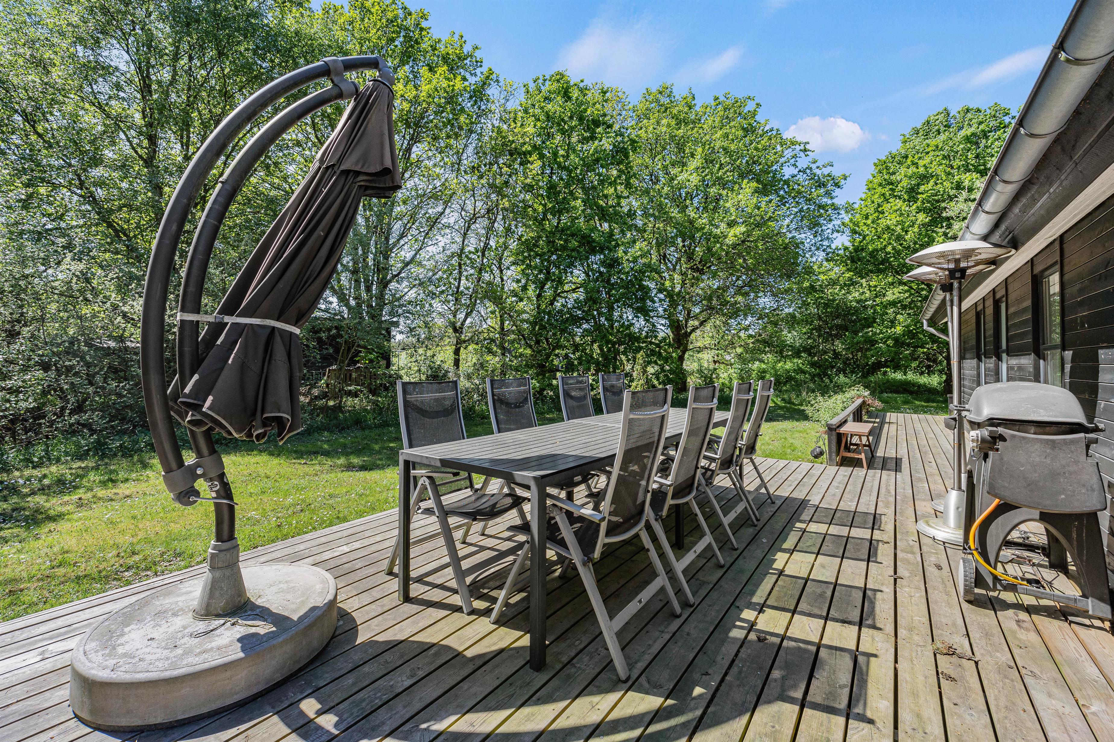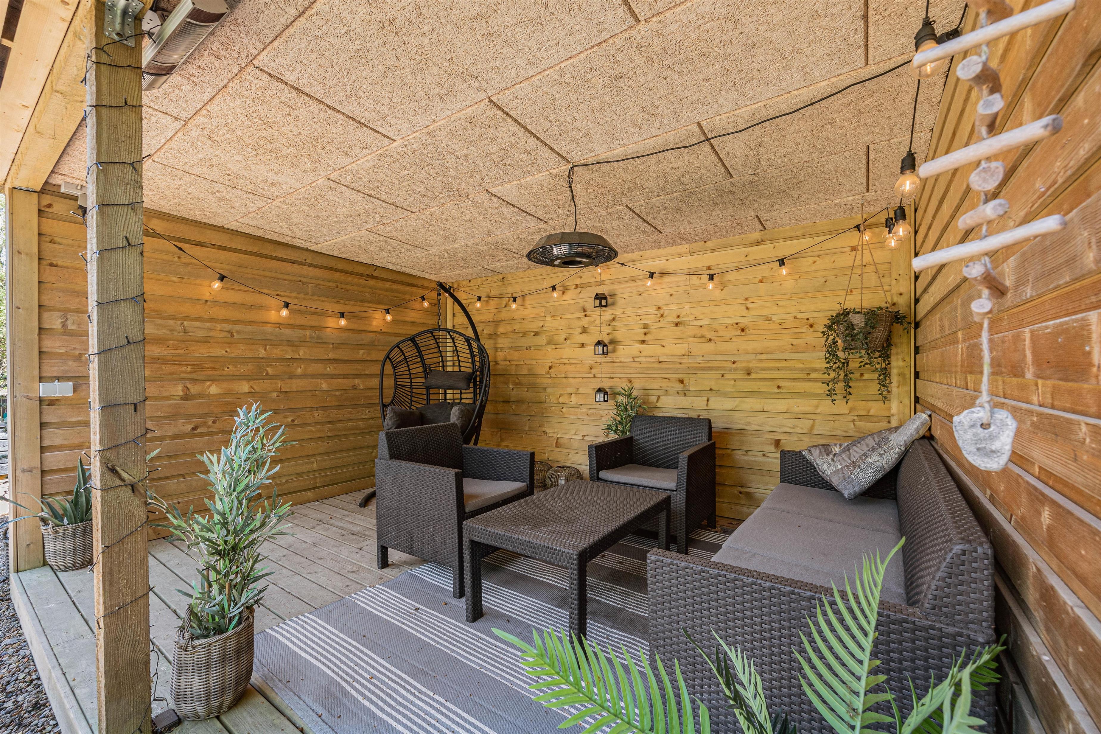 Under den overdækkede terrasse er der indrettet et hyggehjørne, der giver jer mulighed for at sidde udenfor selv i let regnvejr og nyde naturen omkring jer. For de eventyrlystne er der shelter i haven, hvis I har lyst til at tage en overnatning i det fri og bålsted, så I rigtig kan nyde udelivet.