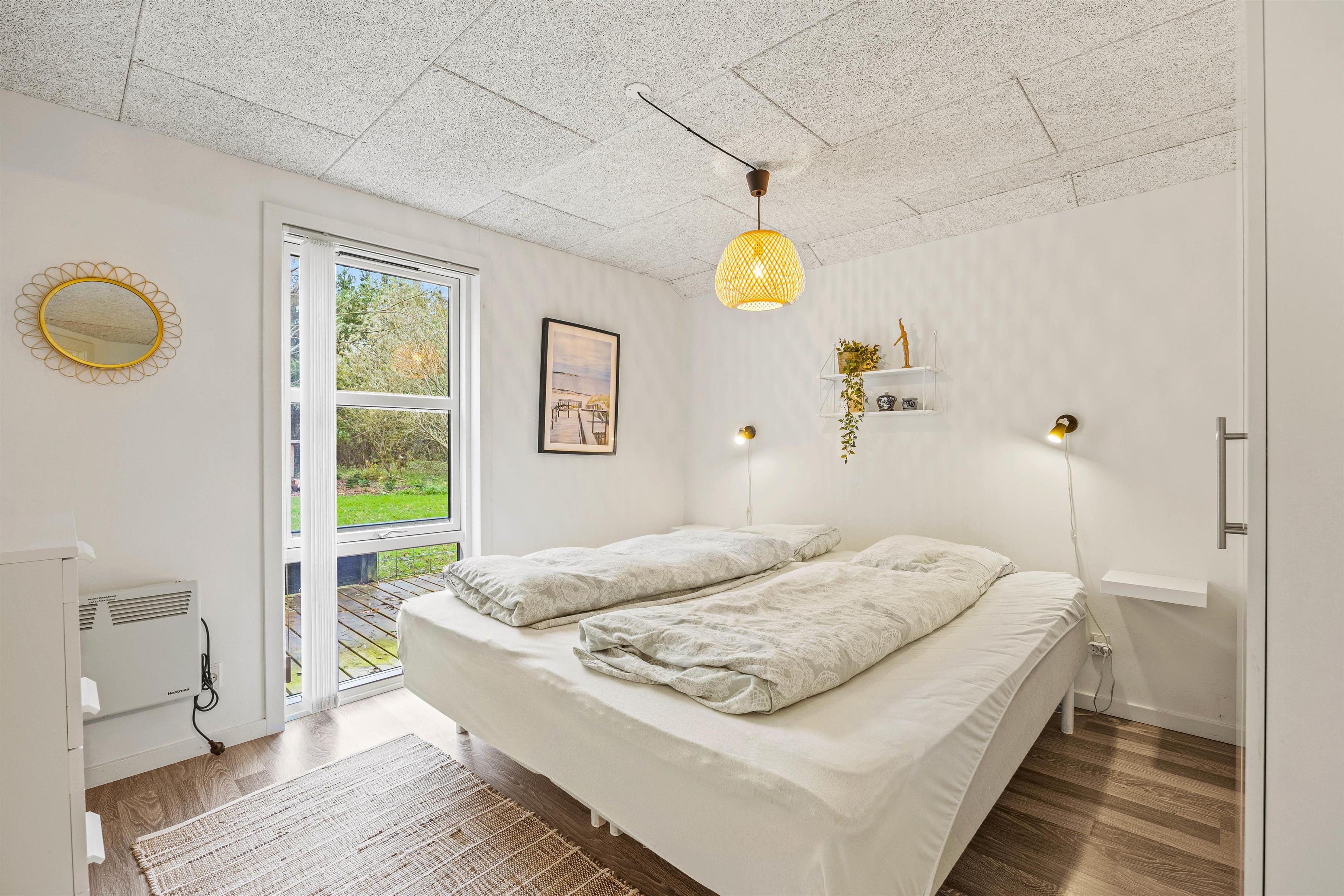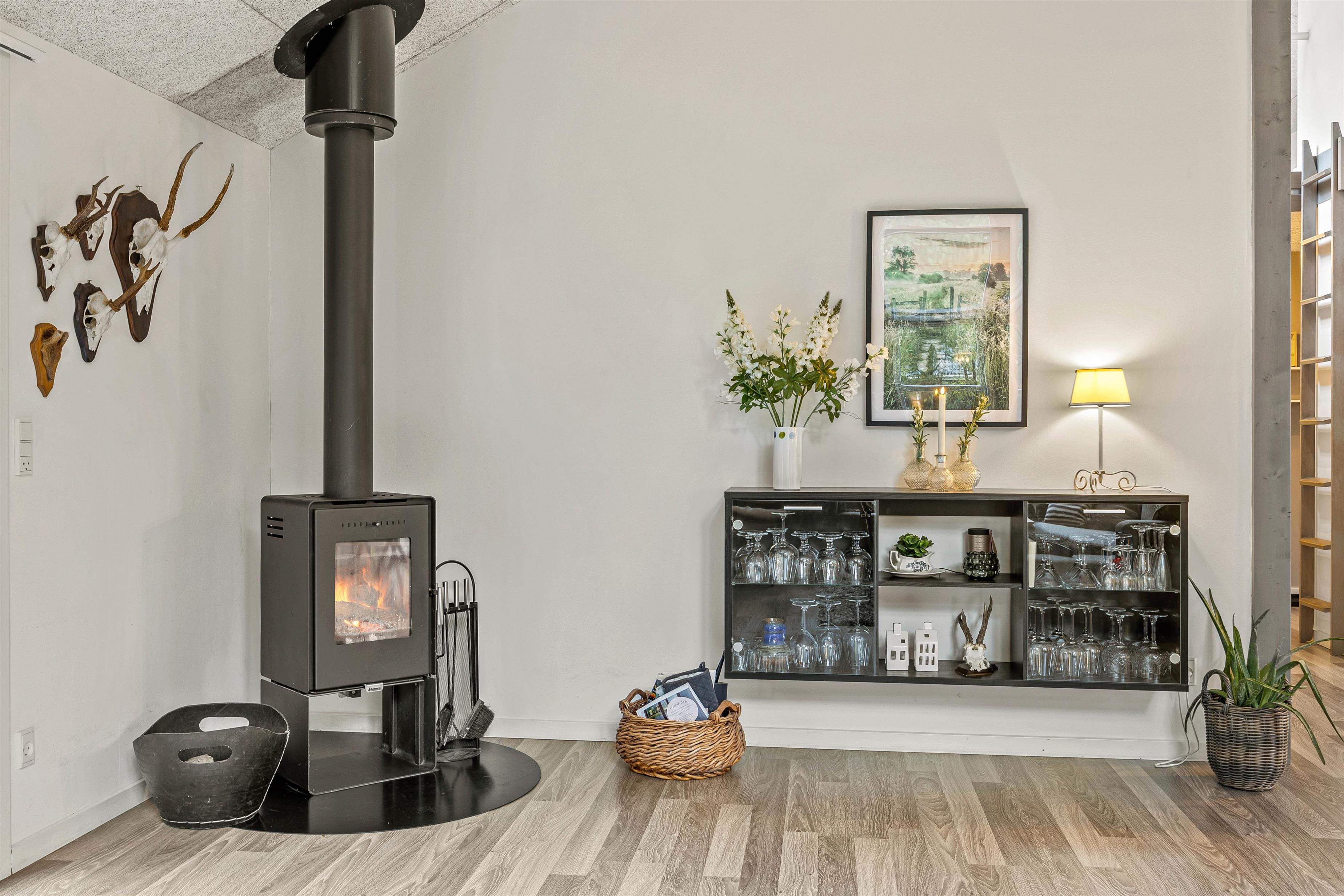 Udover brændeovnen er feriehuset også udstyret med en energisparende varmepumpe, der sørger for behagelige temperaturer og et godt indeklima.