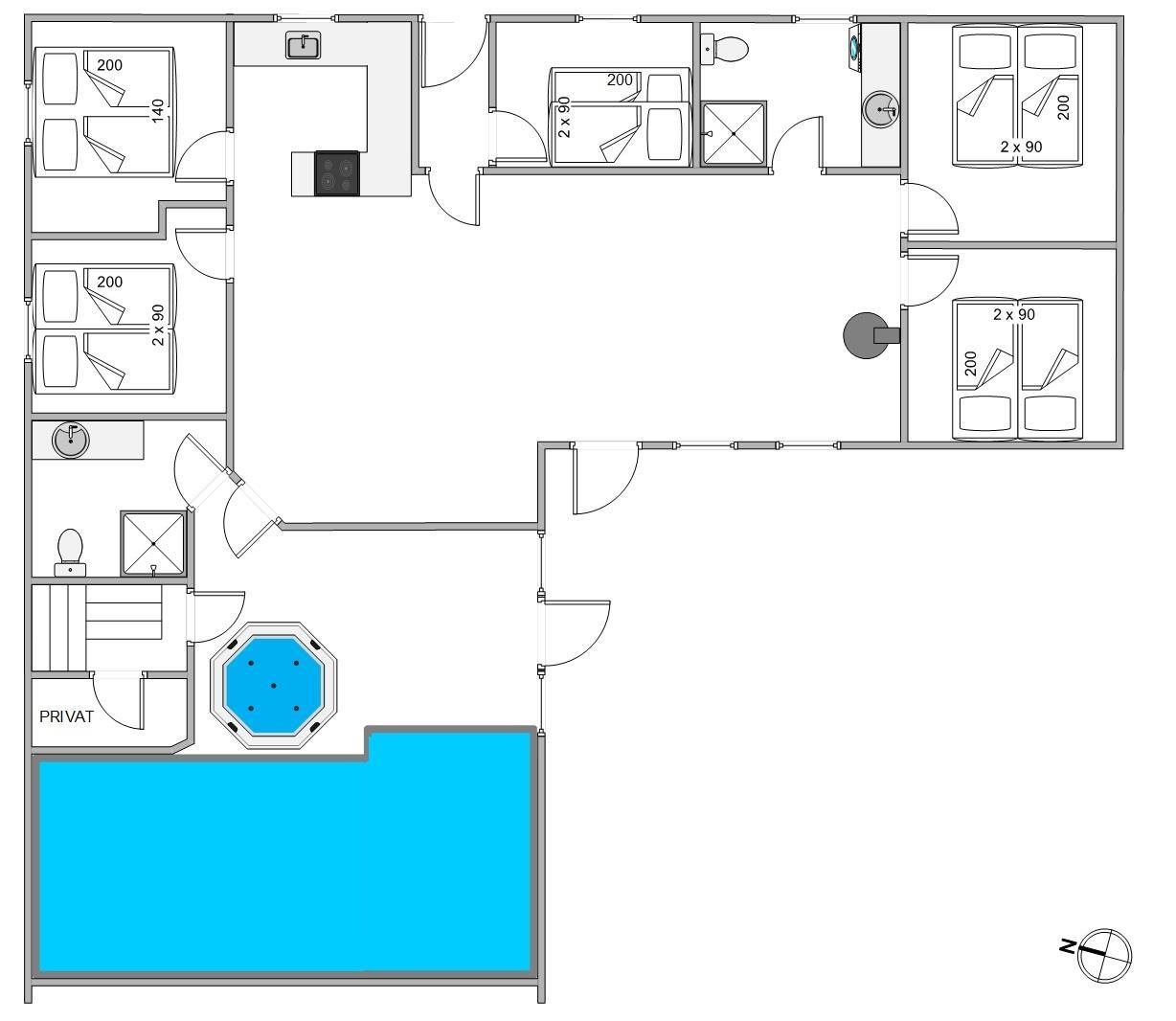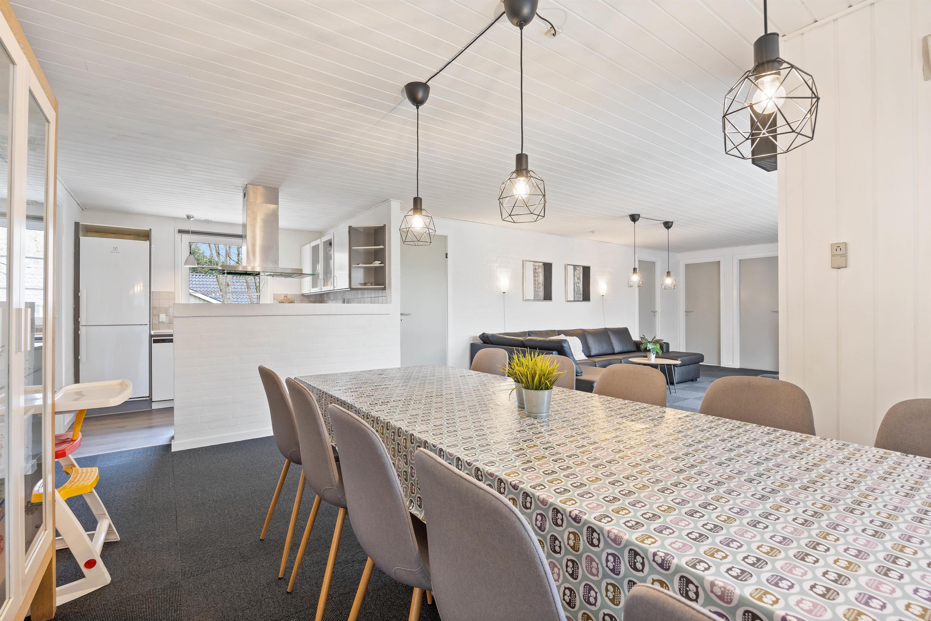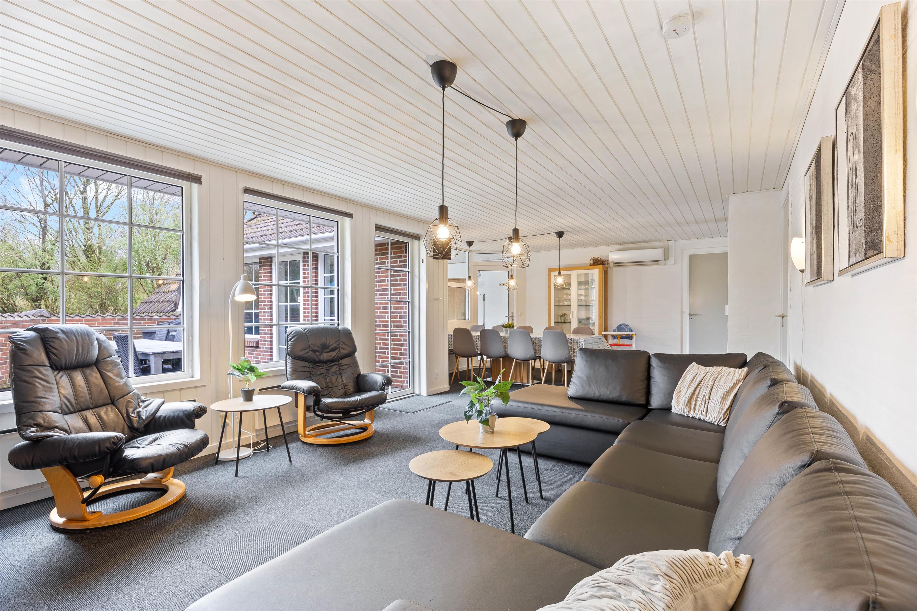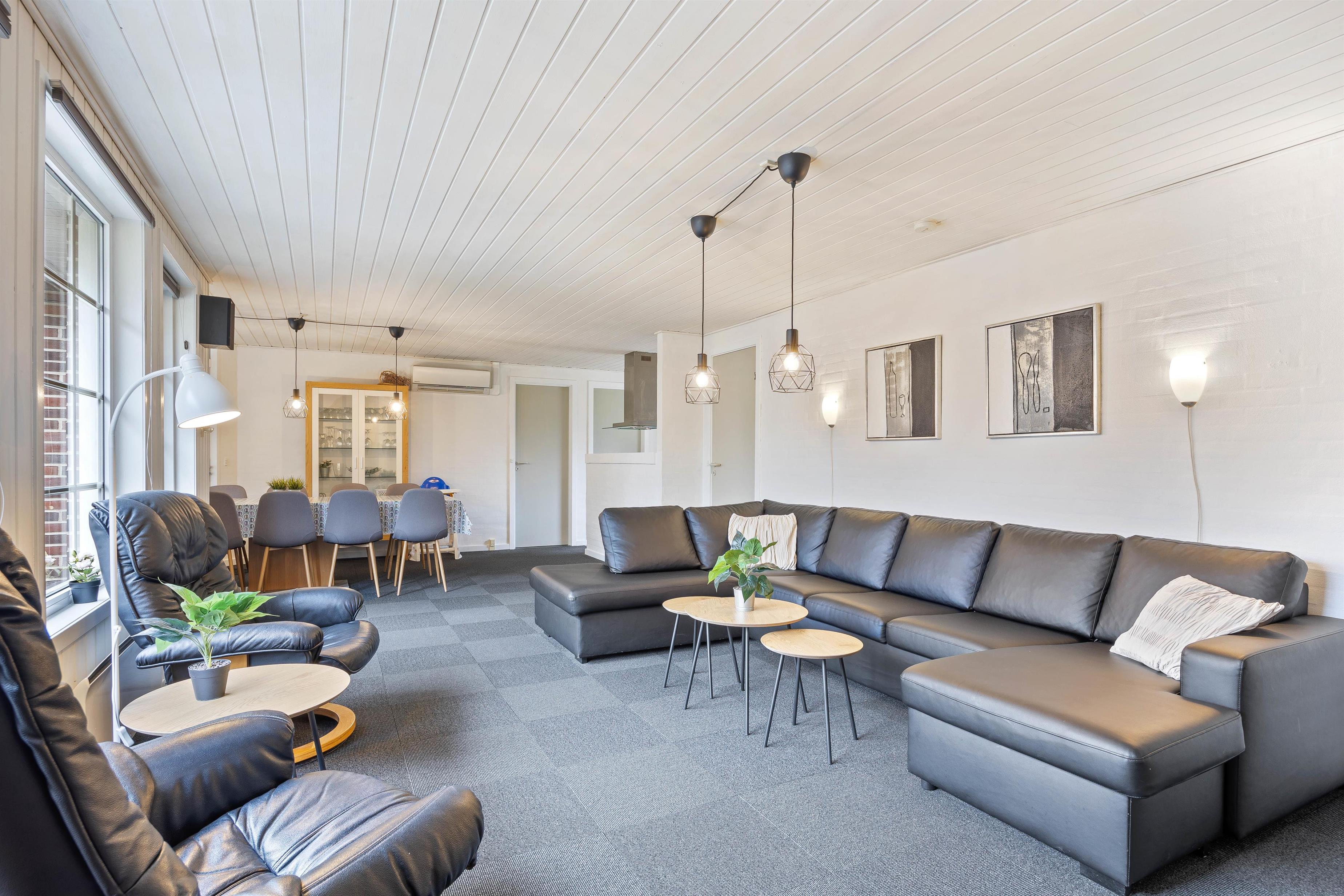 Højdepunkterne for dette dejlige feriehus er opholdsrummet, hvor stue og køkken er i åben forbindelse, og selvfølgelig poolrummet. Her er den 19 m2 store swimmingpool samt spa og sauna til afslapning. Her sætter fantasien kun grænser, og I er sikret mange dejlige stunder uanset vind og vejr. Efter en lang dag i poolen, kan I alle samles omkring det lange spisebord. Lad opvaskemaskinen klarer oprydningen, mens I slænger jer i den komfortable sofa. Pop popcornene og se en god film, mens brændeovnens varme breder sig i rummet.