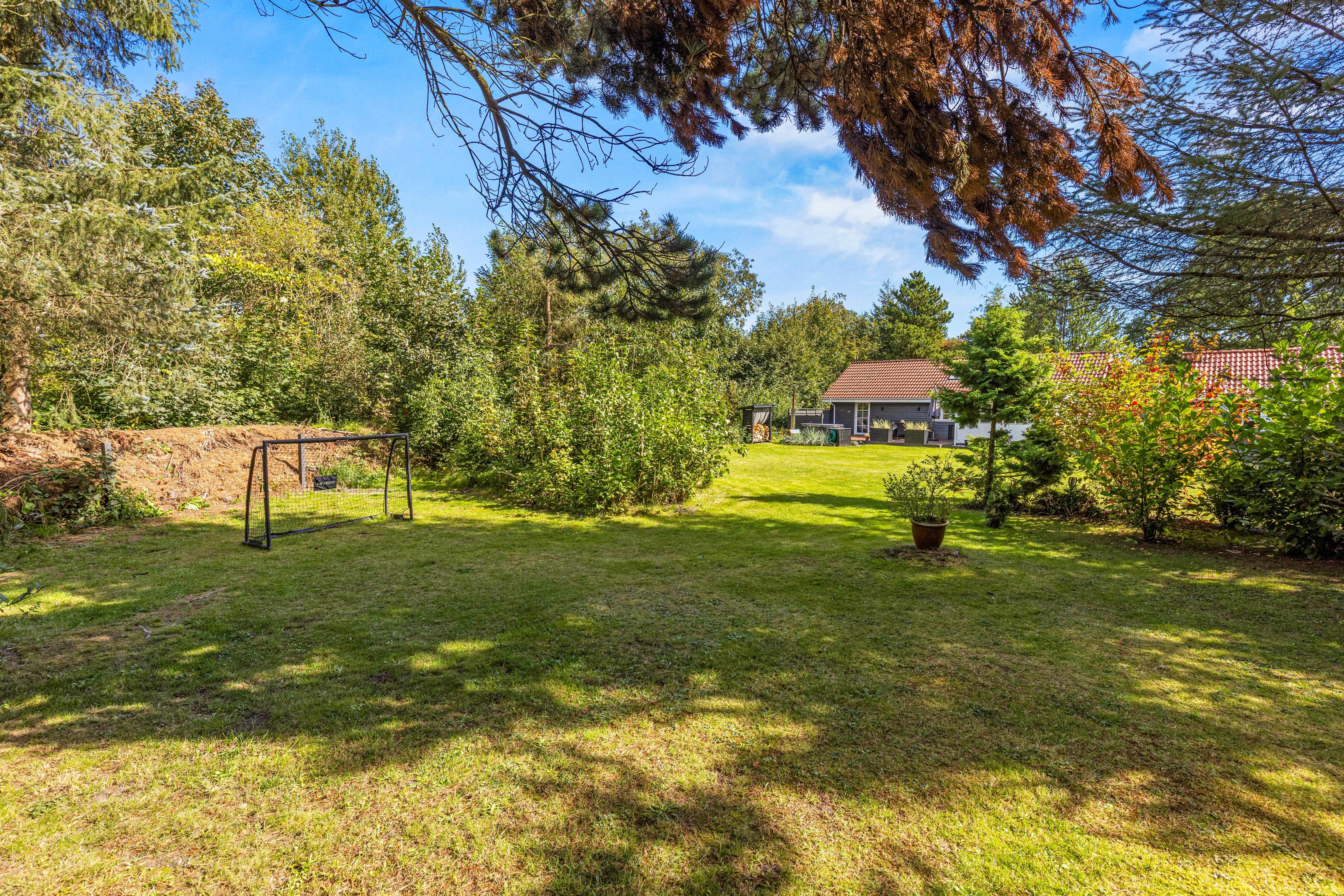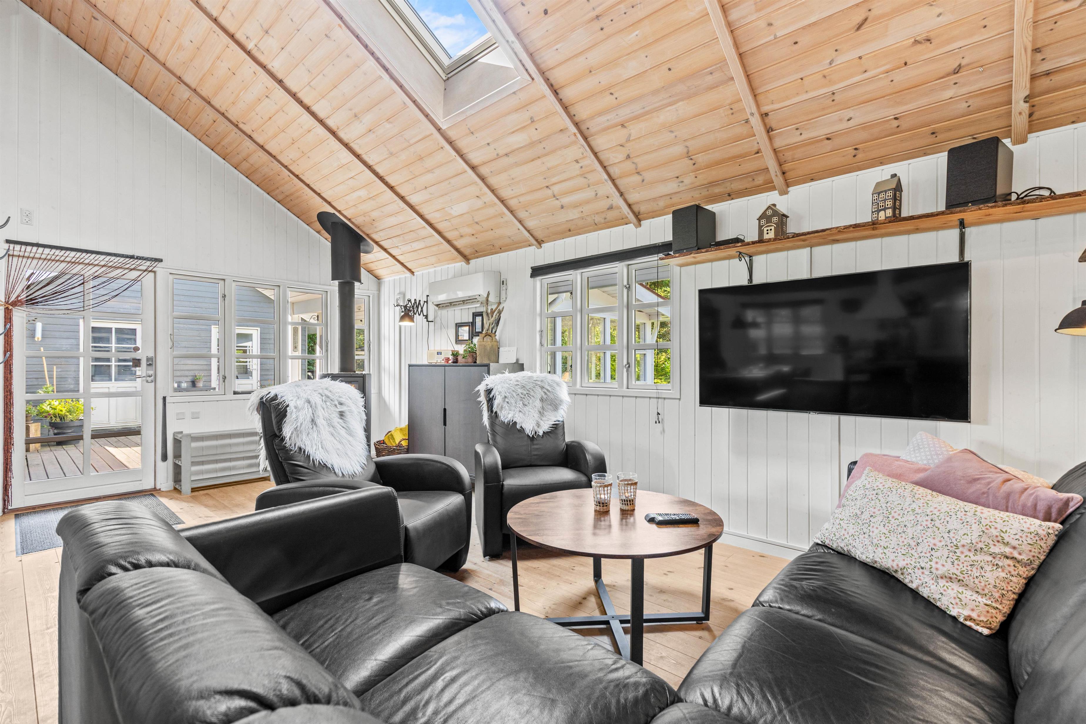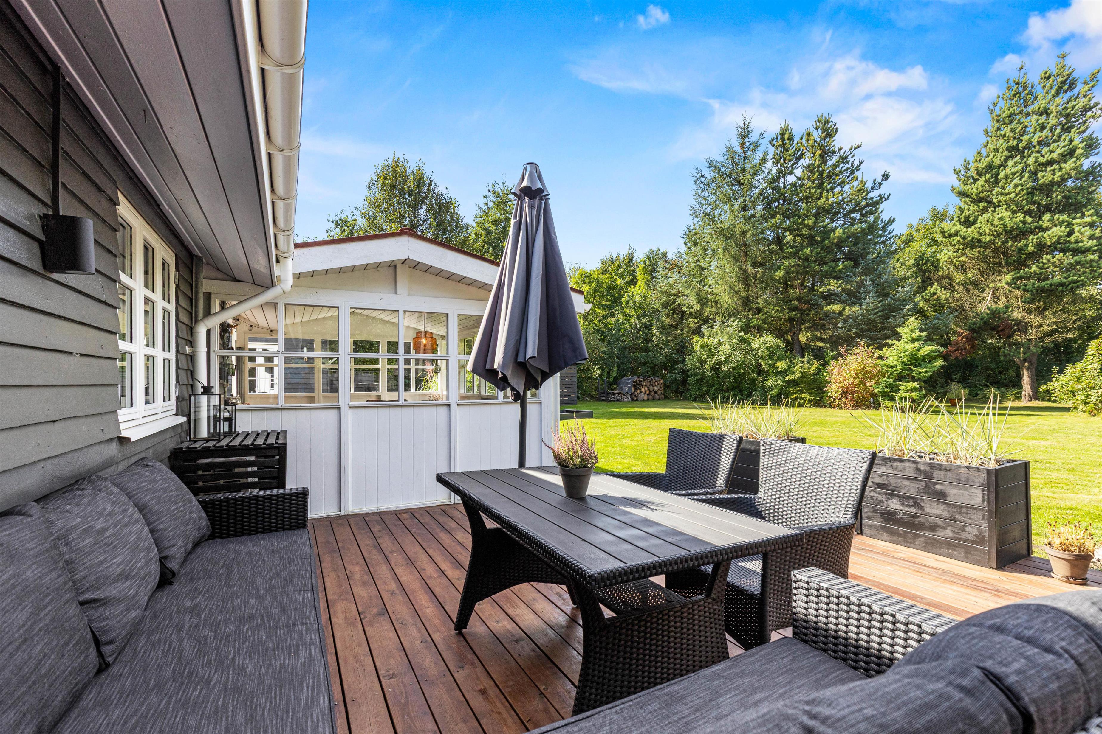 På Fyrrelunden 12 er udelivet i fokus. Glæd jer over et stort overdækket terrasseareal med vinduer, som næsten fungerer som en udestue og dejlige, læfyldte hjørner, hvor I kan slappe af i de gode havemøbler og blive opslugt af en god bog, mens kullene bliver varme og klar til tilberedelsen af lidt lækker grillmad.