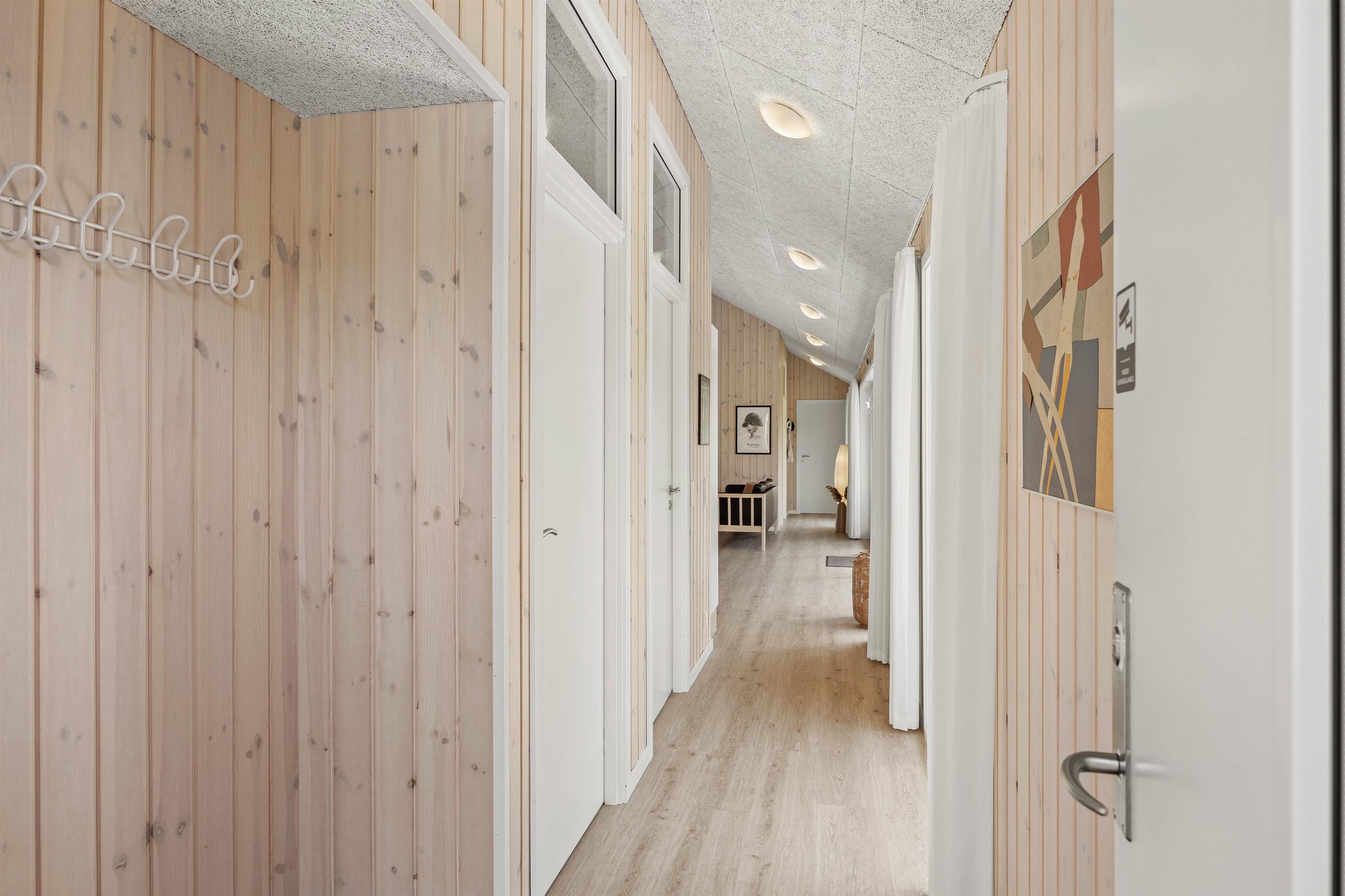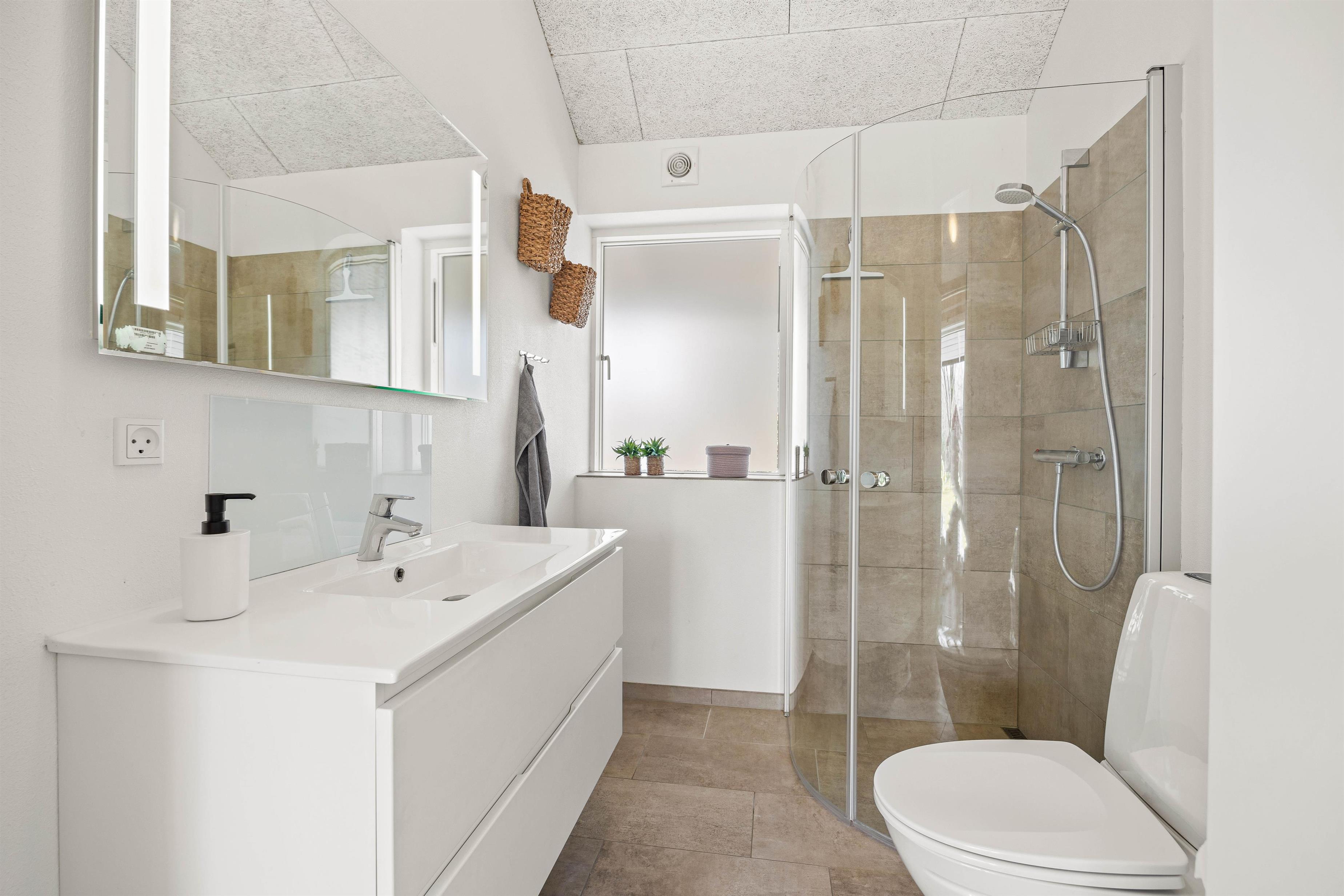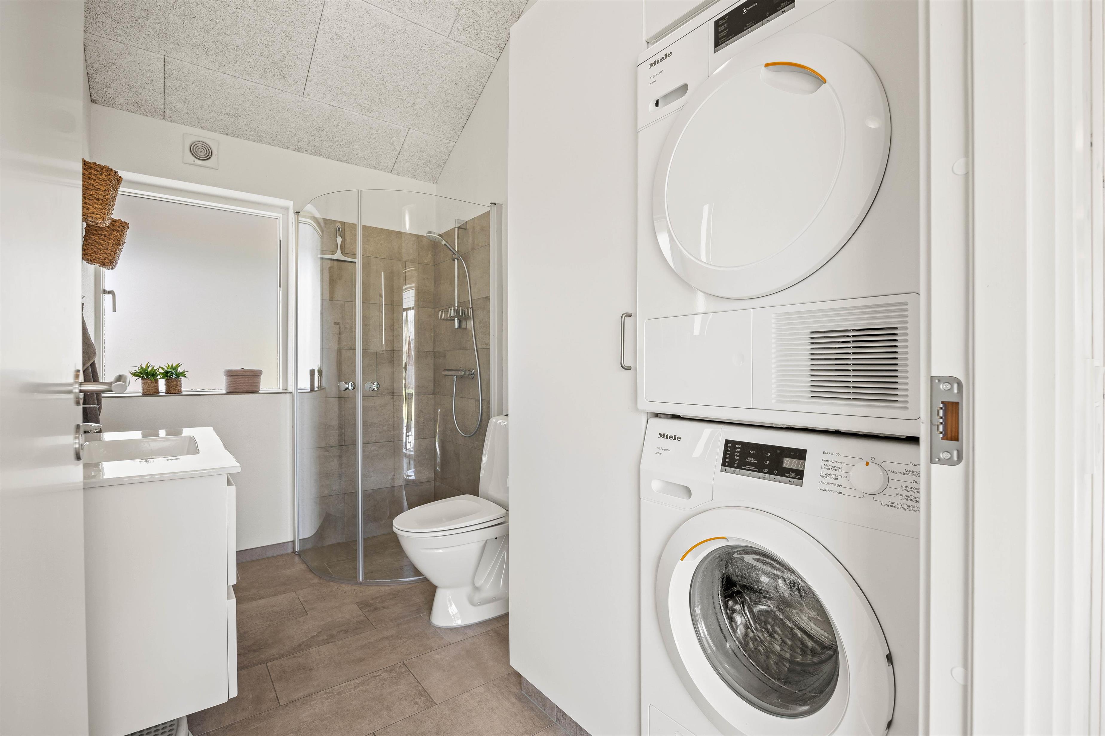 Det lyse badeværelse er udstyret med behagelig gulvvarme, som sikrer en luksuriøs start på dagen. Dertil er sommerhuset udstyret med både vaskemaskine og tørretumbler, så I ikke skal bekymre jer om garderoben under ferien.