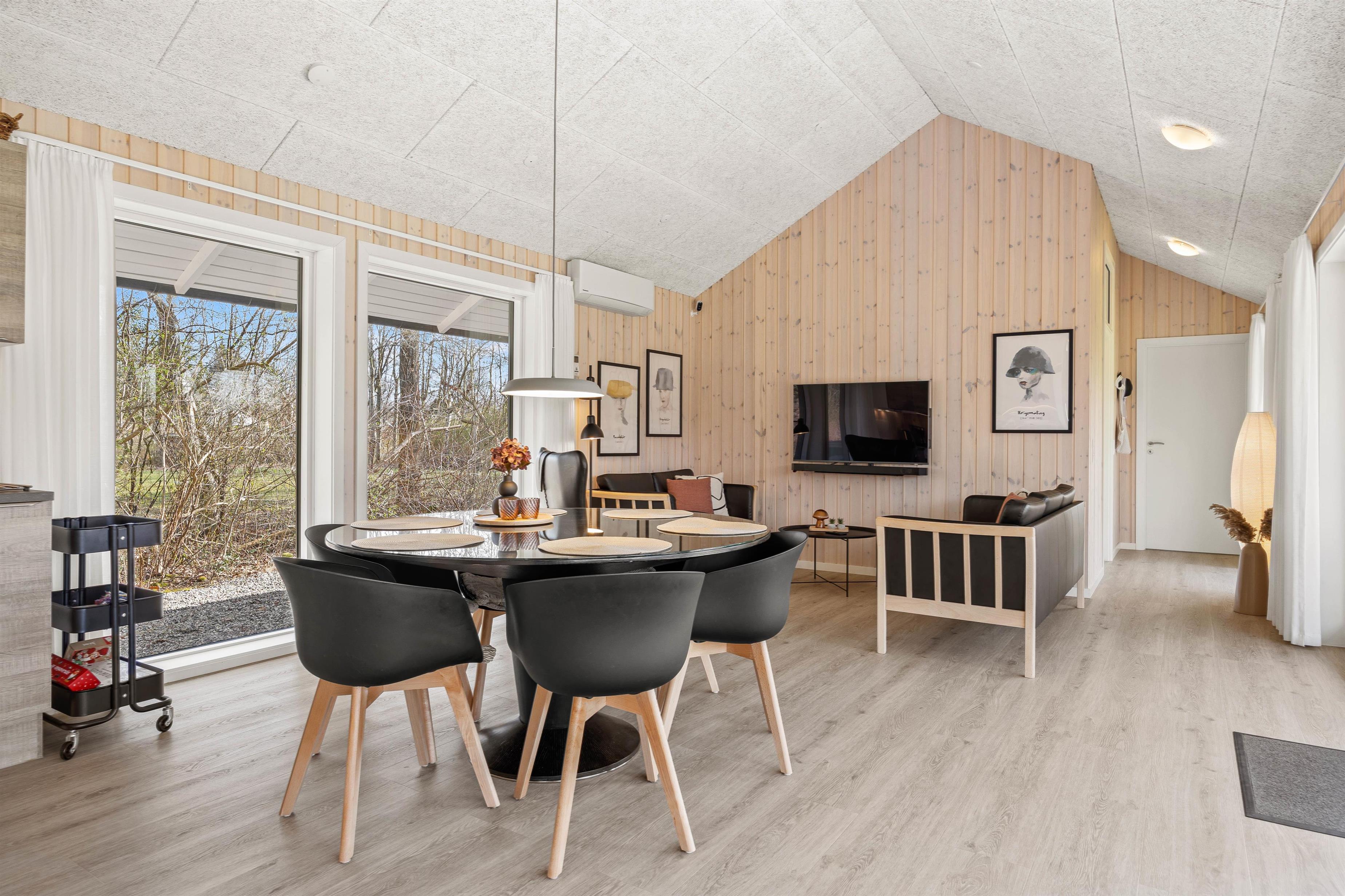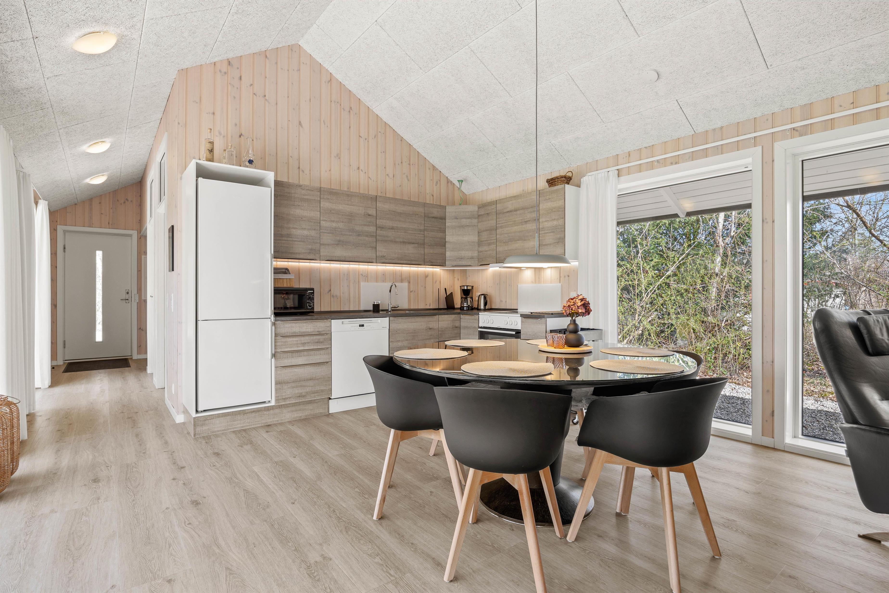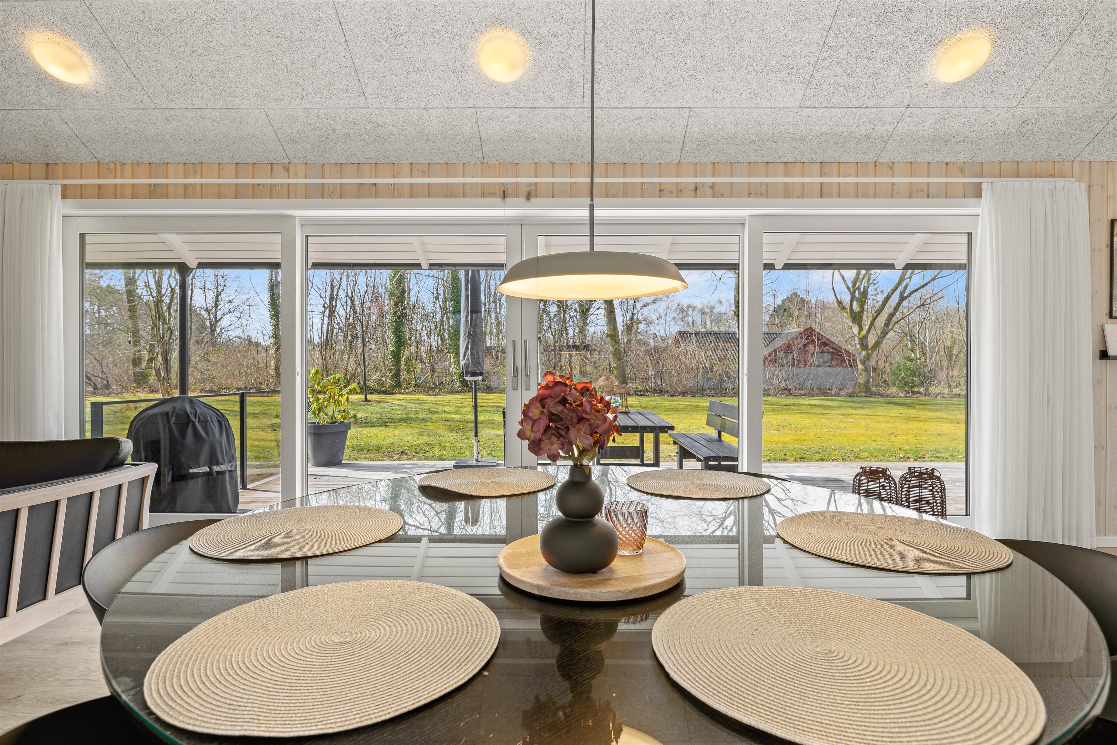 Inde i det lyse og indbydende sommerhus mødes I af en rummelig atmosfære med højt til loftet. De store vinduer sikrer, at rummet bades i naturligt lys og giver jer en fantastisk udsigt til den skønne natur udenfor.