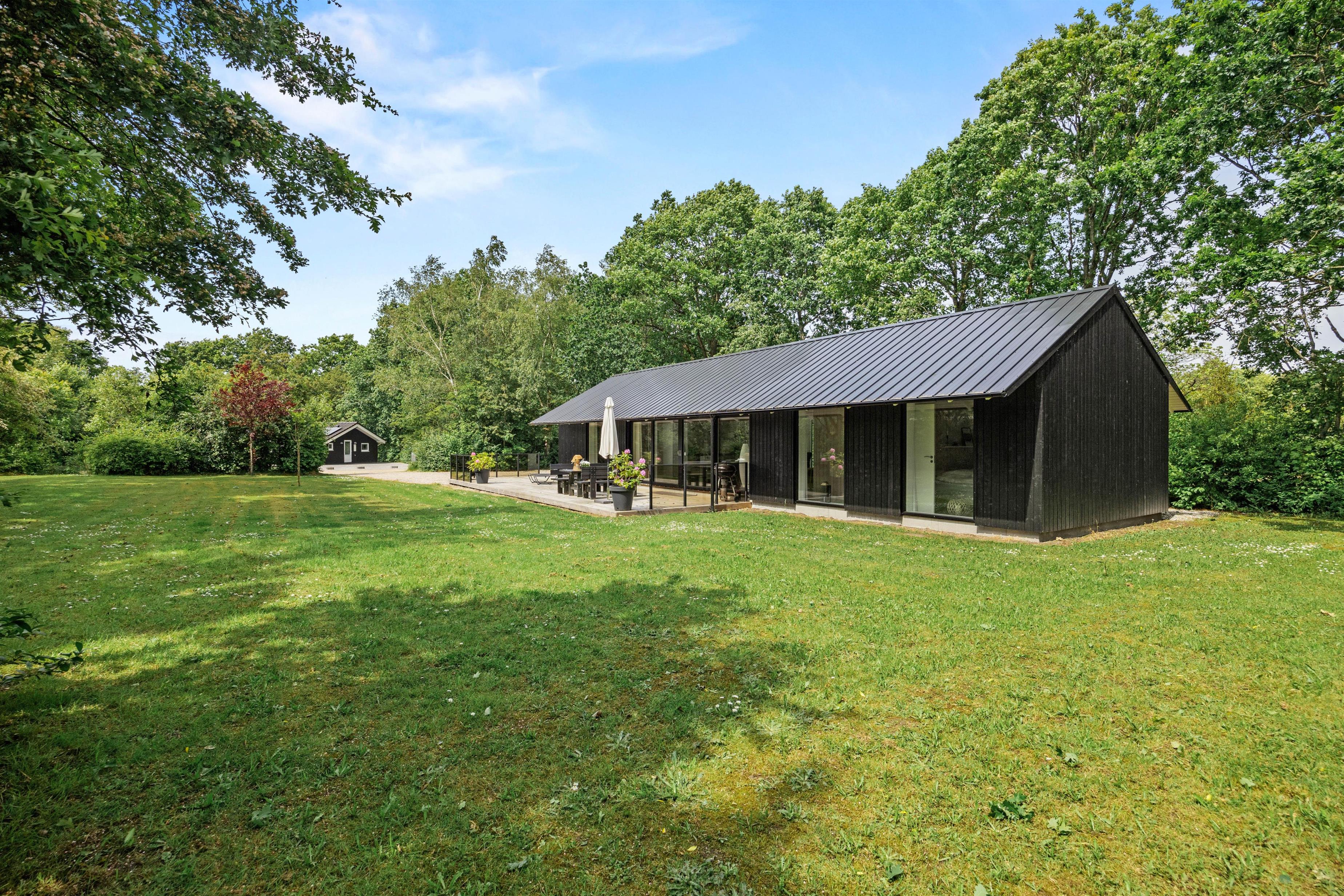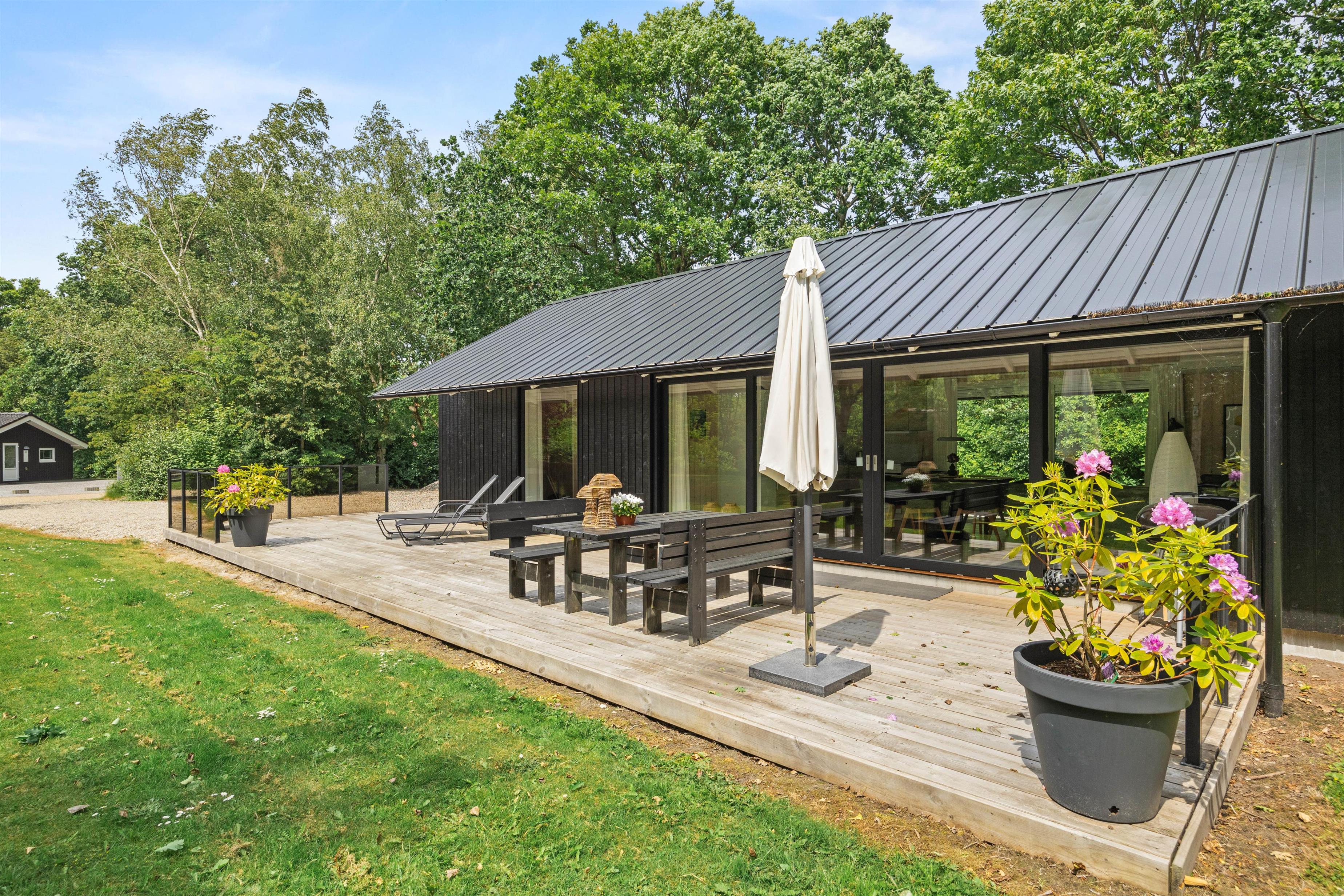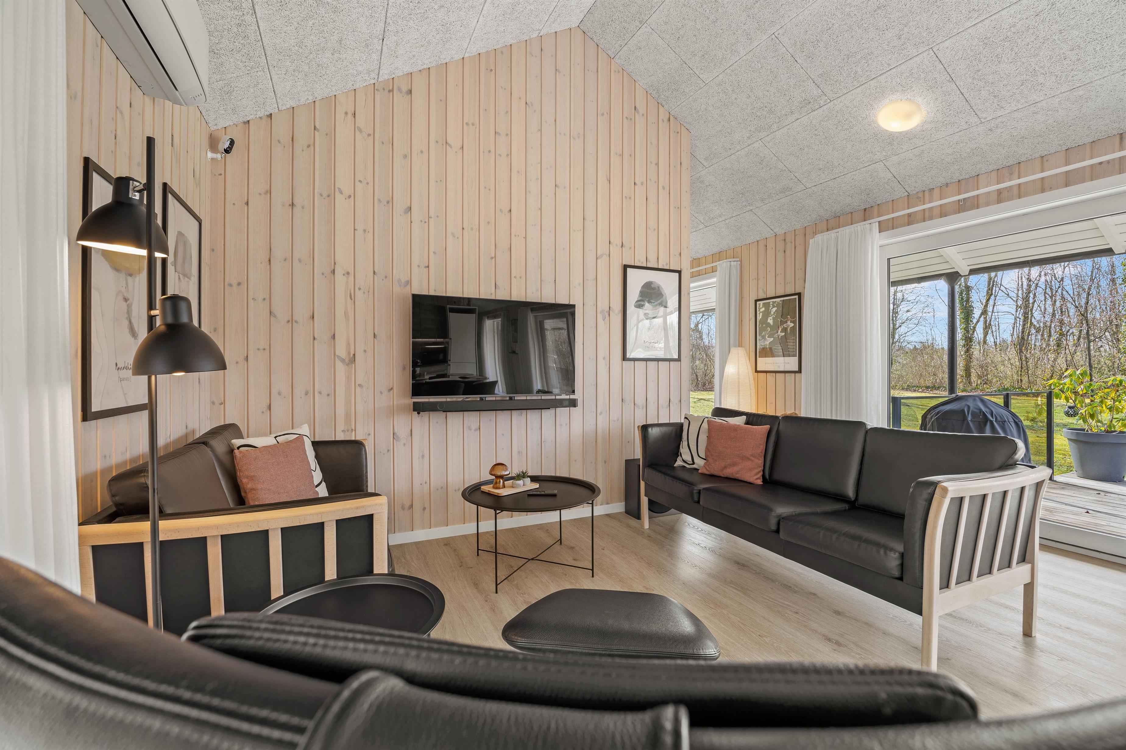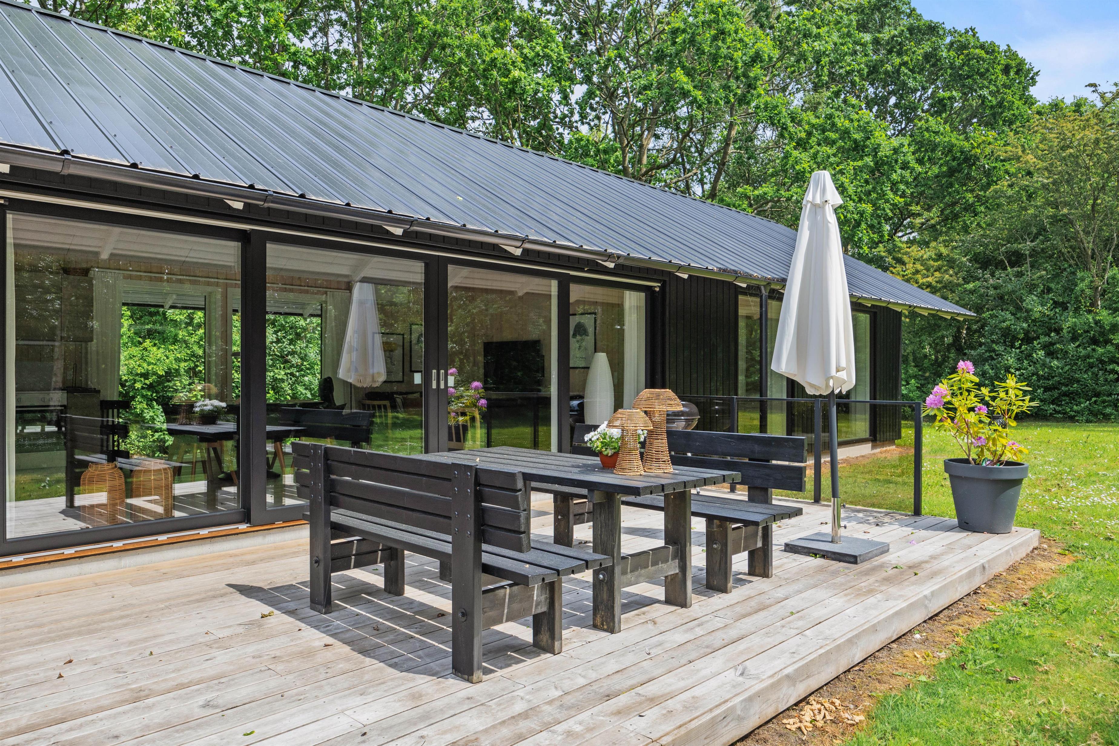 Inde i det lyse og indbydende sommerhus mødes I af en rummelig atmosfære med højt til loftet. De store vinduer sikrer, at rummet bades i naturligt lys og giver jer en fantastisk udsigt til den skønne natur udenfor.