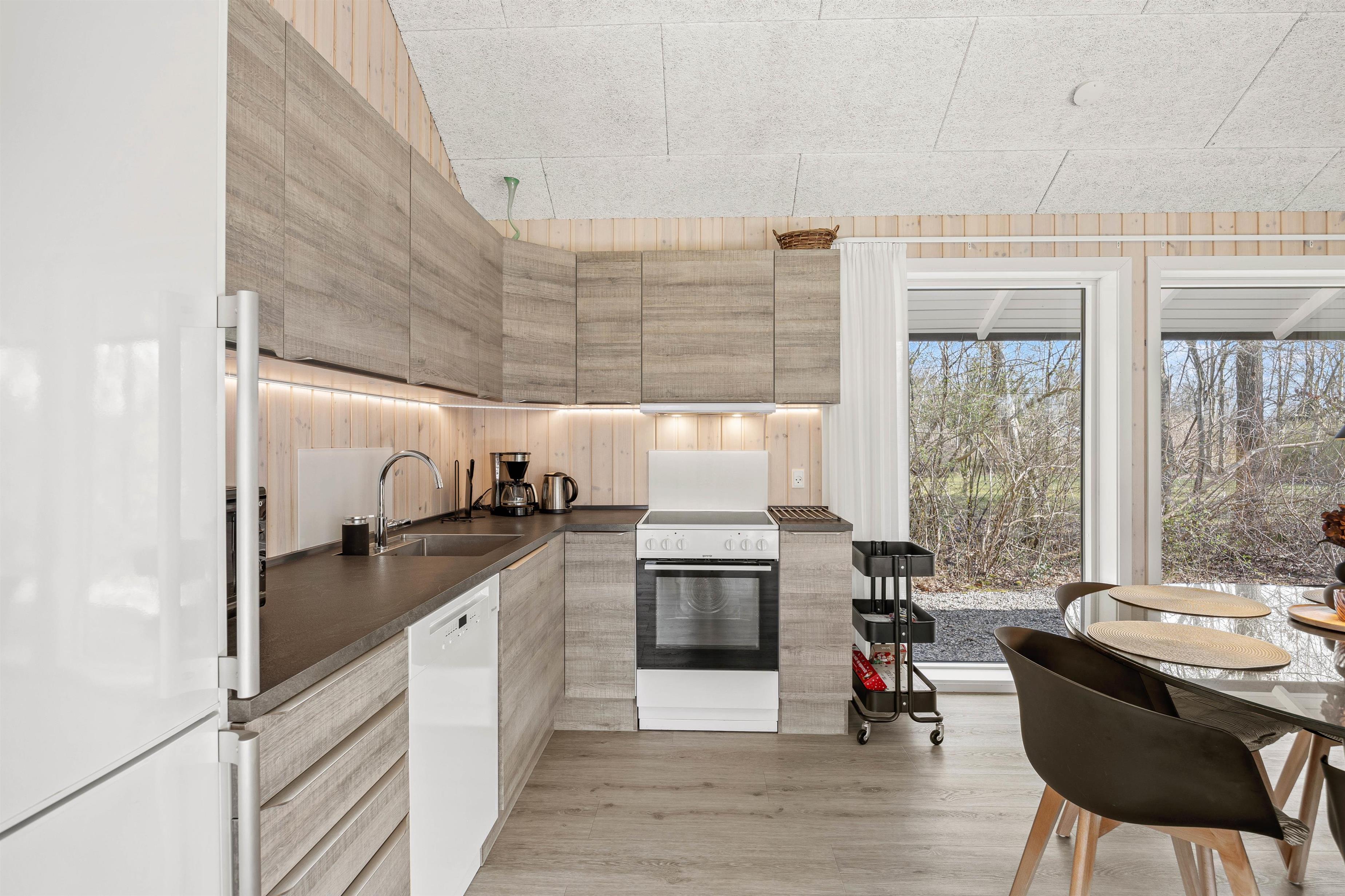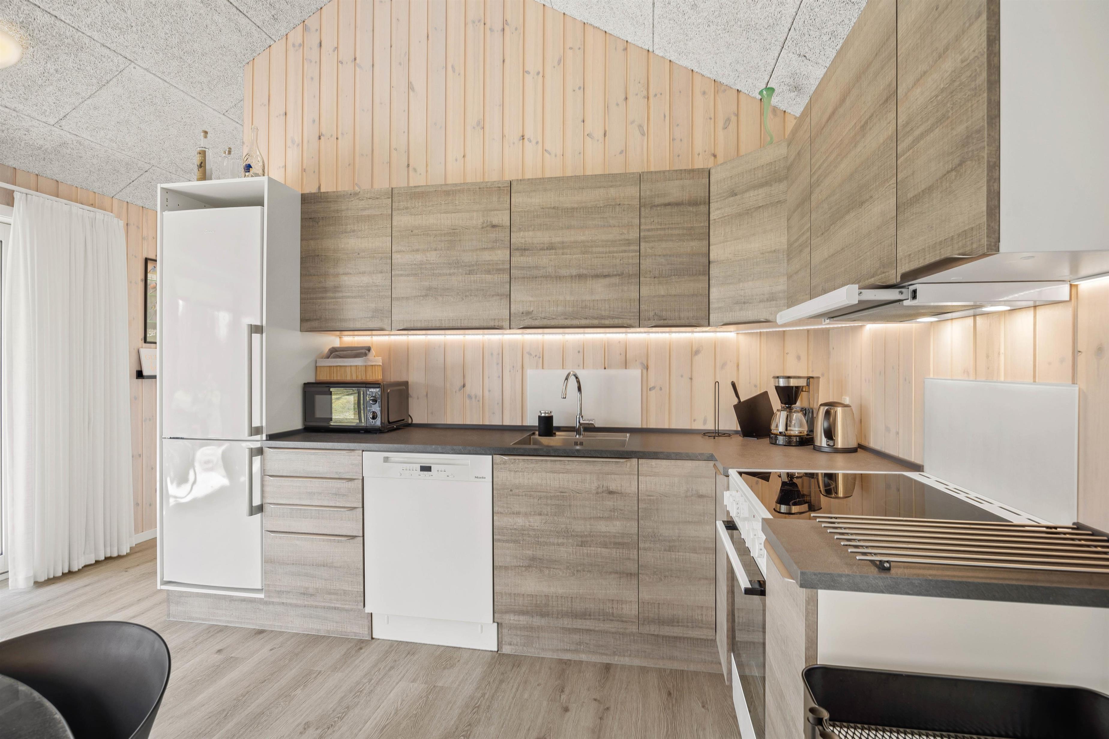 Det åbne køkkenalrum er perfekt til hyggelige stunder, hvor samtalen kan flyde frit mellem madlavning og afslapning. Køkkenet er veludstyret med en opvaskemaskine, så I hurtigt kan klare oprydningen og tage hul på dagens næste eventyr.