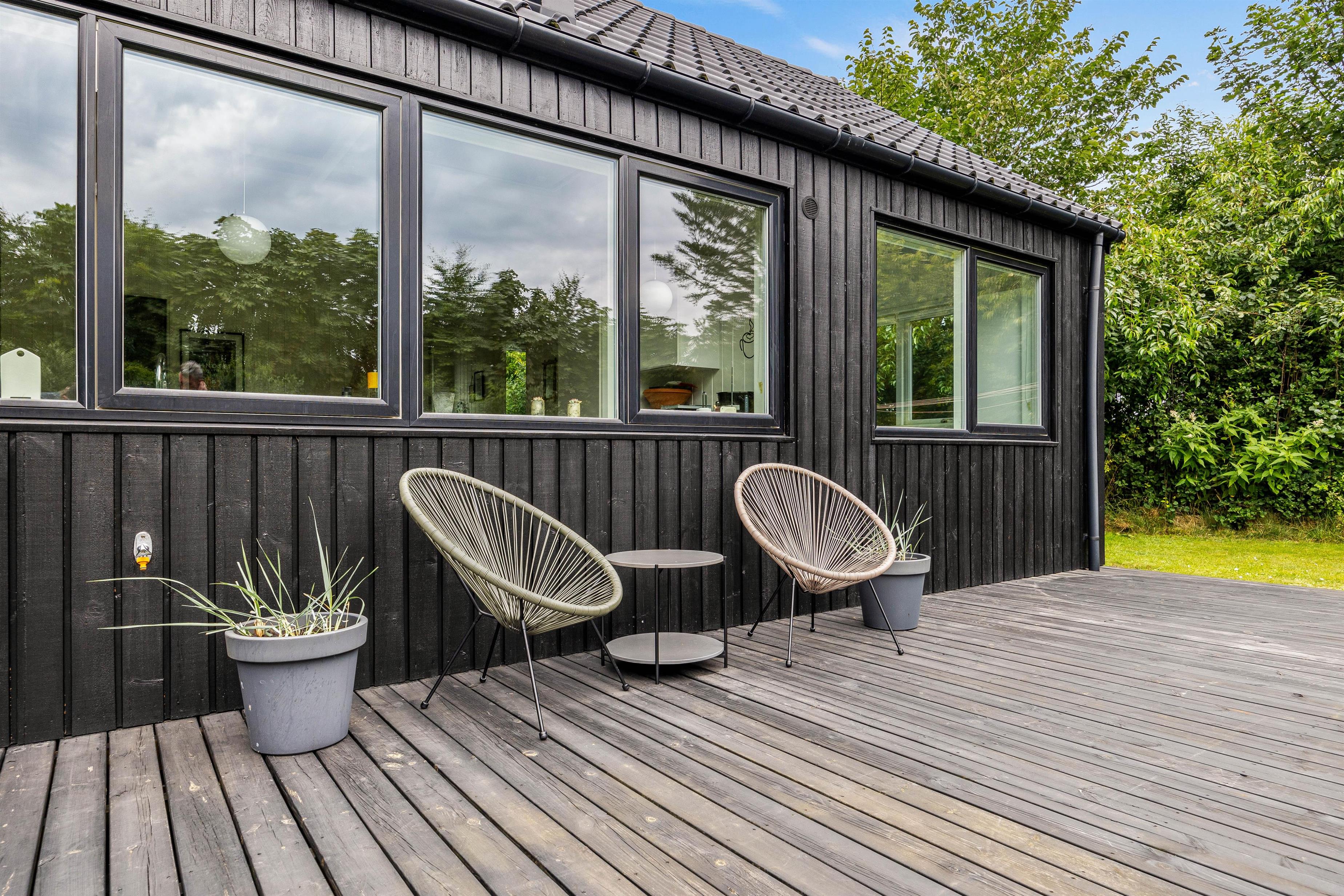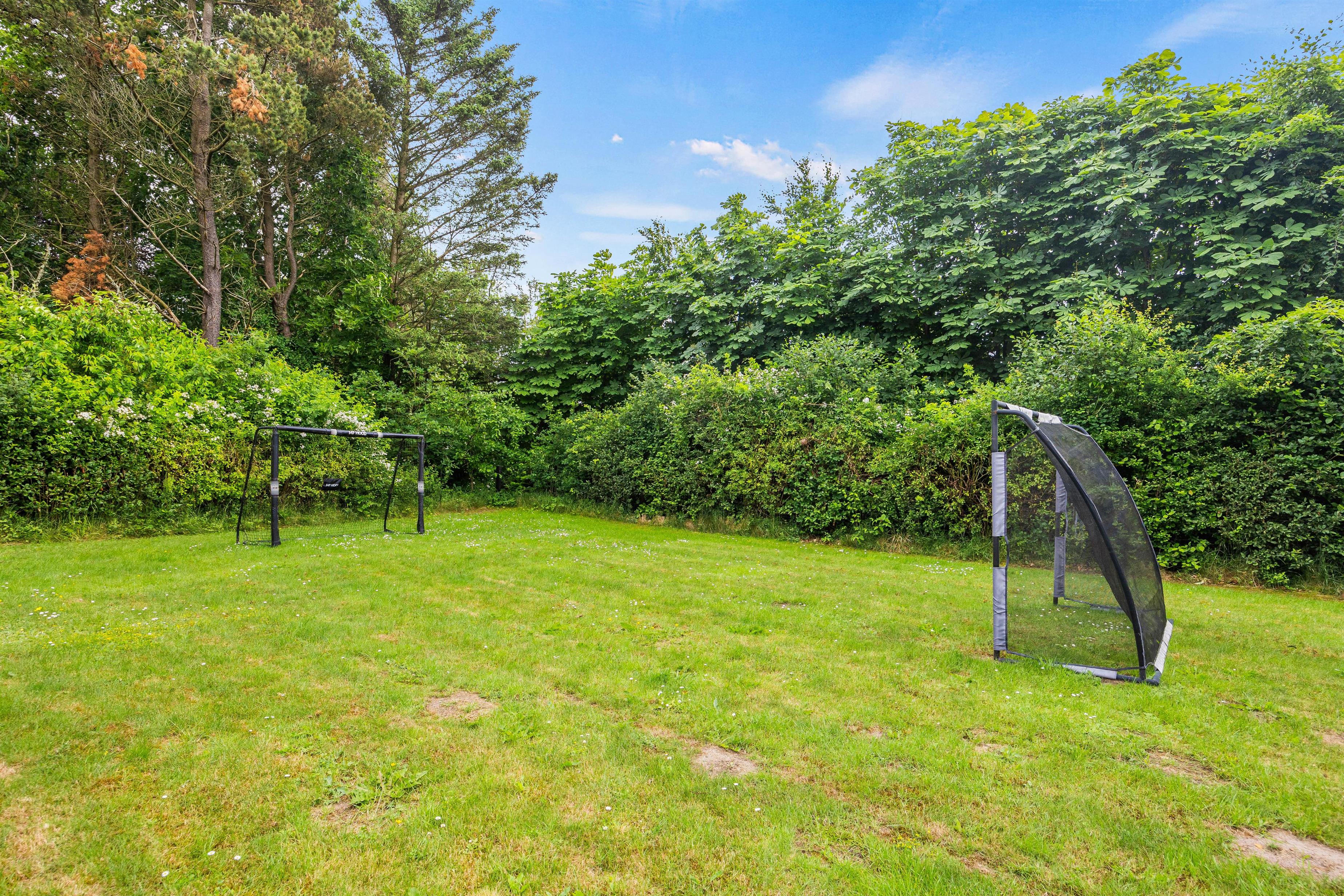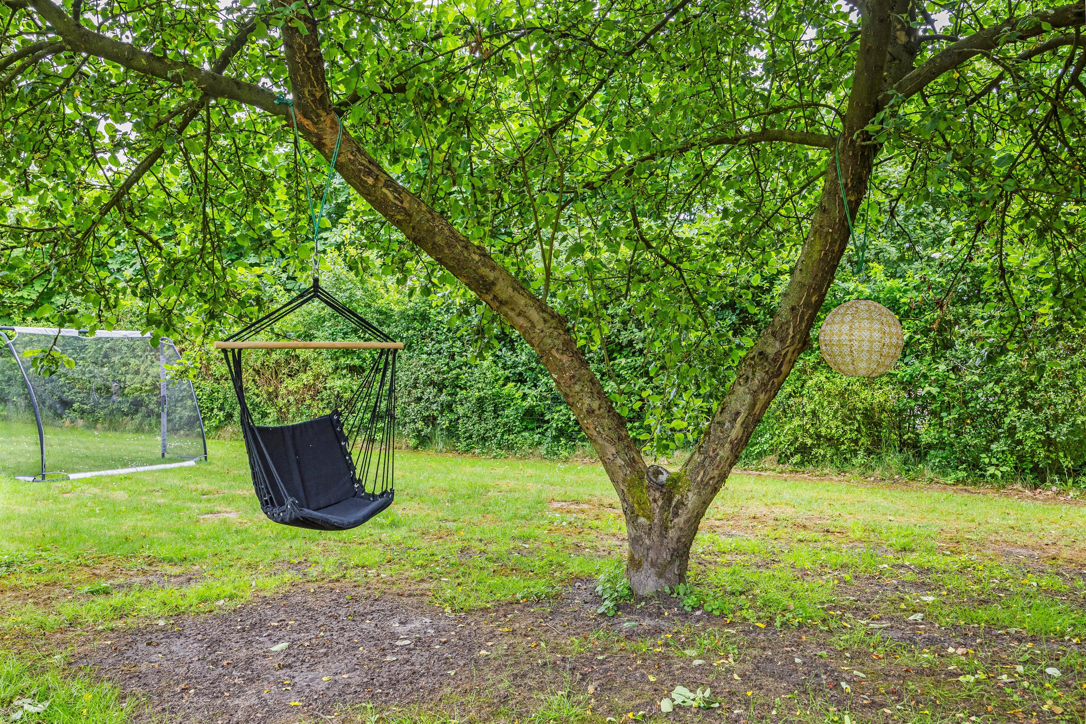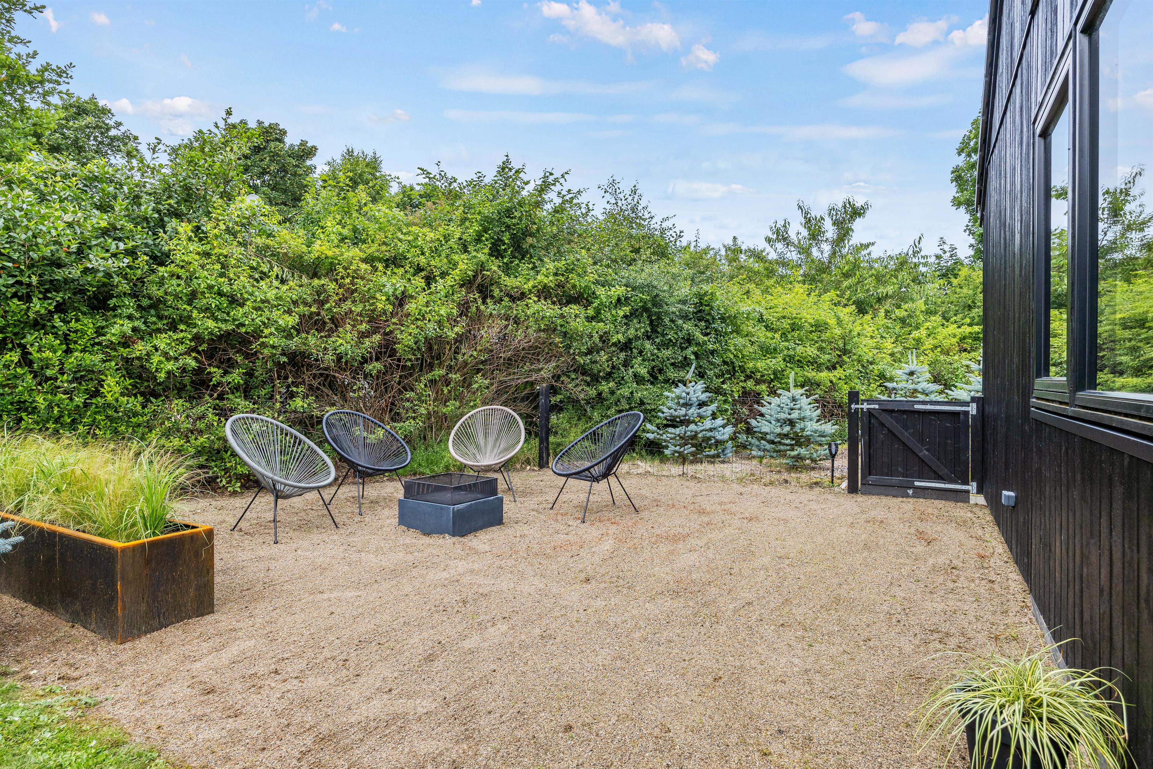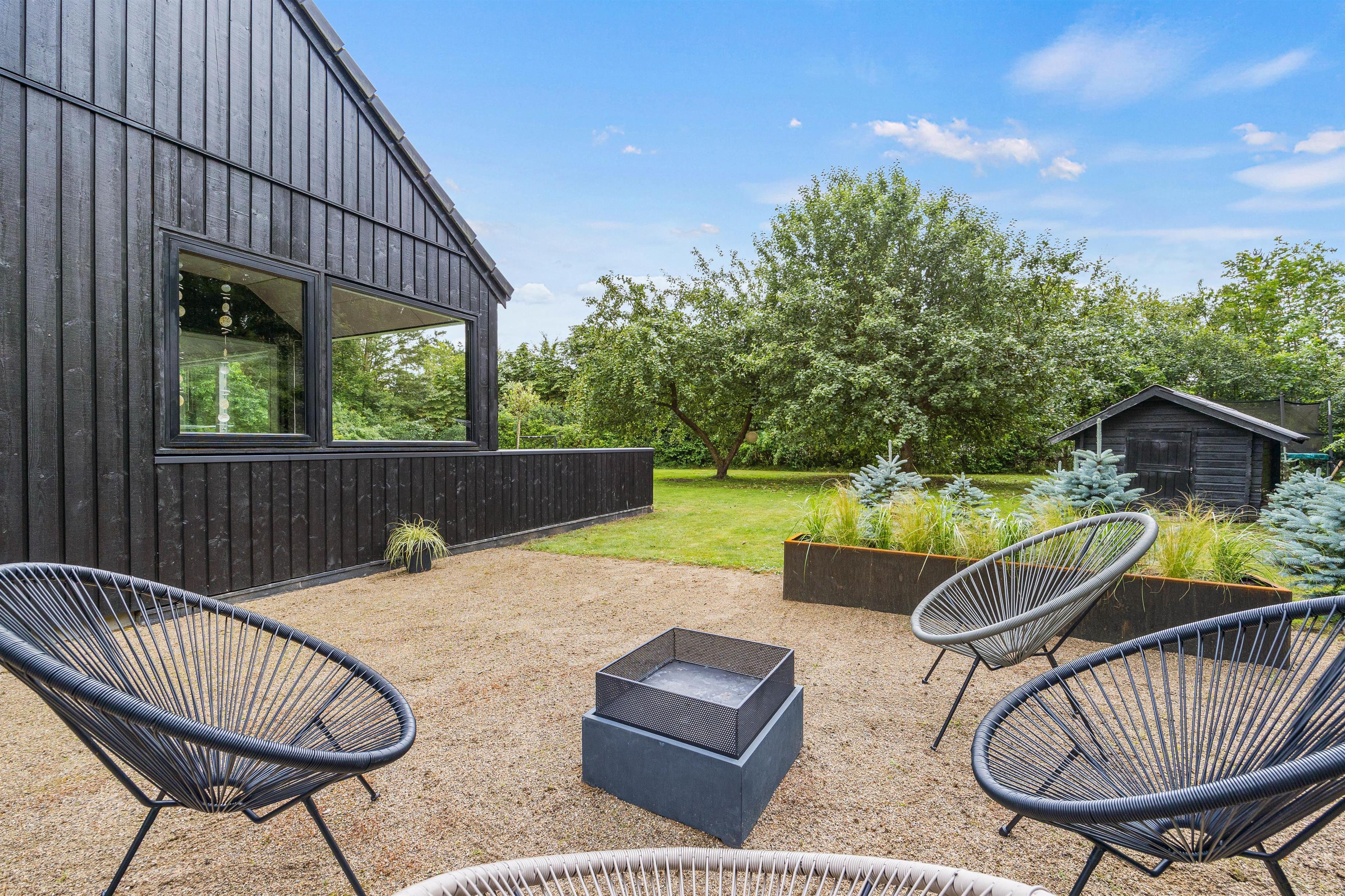 På terrassen finder I alt, hvad I kunne ønske jer til en aften under åben himmel, med grill og havemøbler til jeres rådighed. Der er også solvogne til dem, der ønsker en dag med solbadning. Og frygt ej for mindre børn eller jeres firbenede familiemedlem, for grunden er nemlig indhegnet, så I trygt kan lade dem boltre sig i haven. Derudover venter der jer et hyggeligt bålsted i haven, hvor I kan samles og måske lave en omgang snobrød. Der er også en trampolin til børnene og barnlige sjæle, så I kan hoppe og more jer i haven.