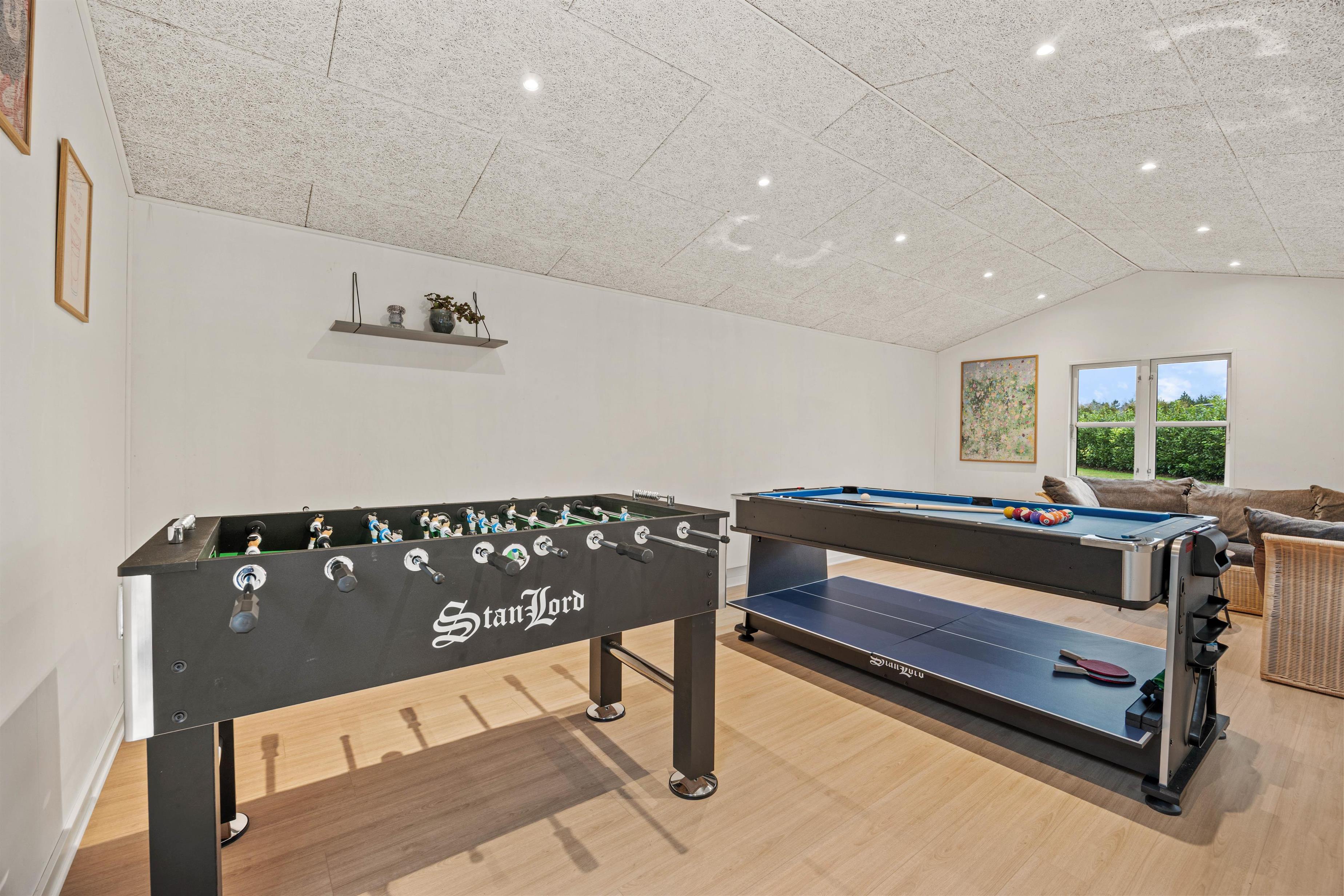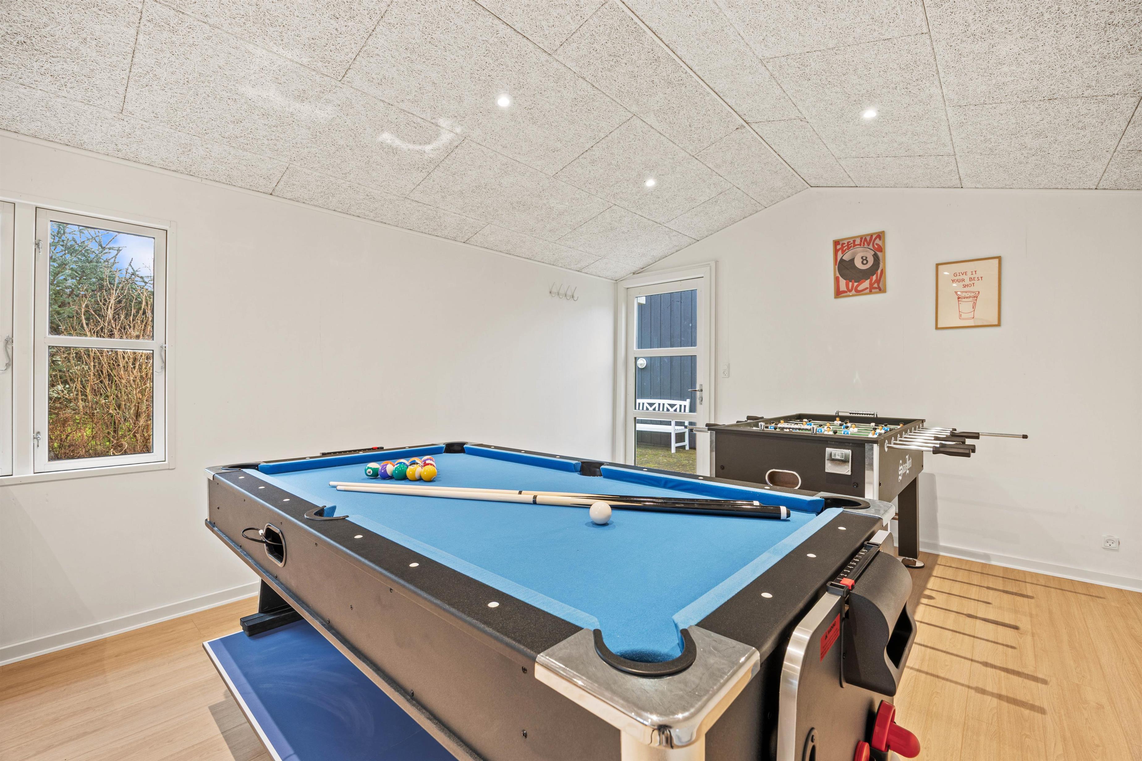 Dette sommerhus i Jegum Ferieland er et ferieparadis, hvor alle kan føle sig godt tilpas. For de, der nyder en smule konkurrence, er der poolbillard, bordfodbold, airhockey og bordtennis. Når afslapning står på dagsordenen, inviterer saunaen og spabadet til et beroligende afbræk fra hverdagens stress, og brændeovnen skaber en lun og hyggelig atmosfære for stille aftener med spil, samtaler og nærvær.