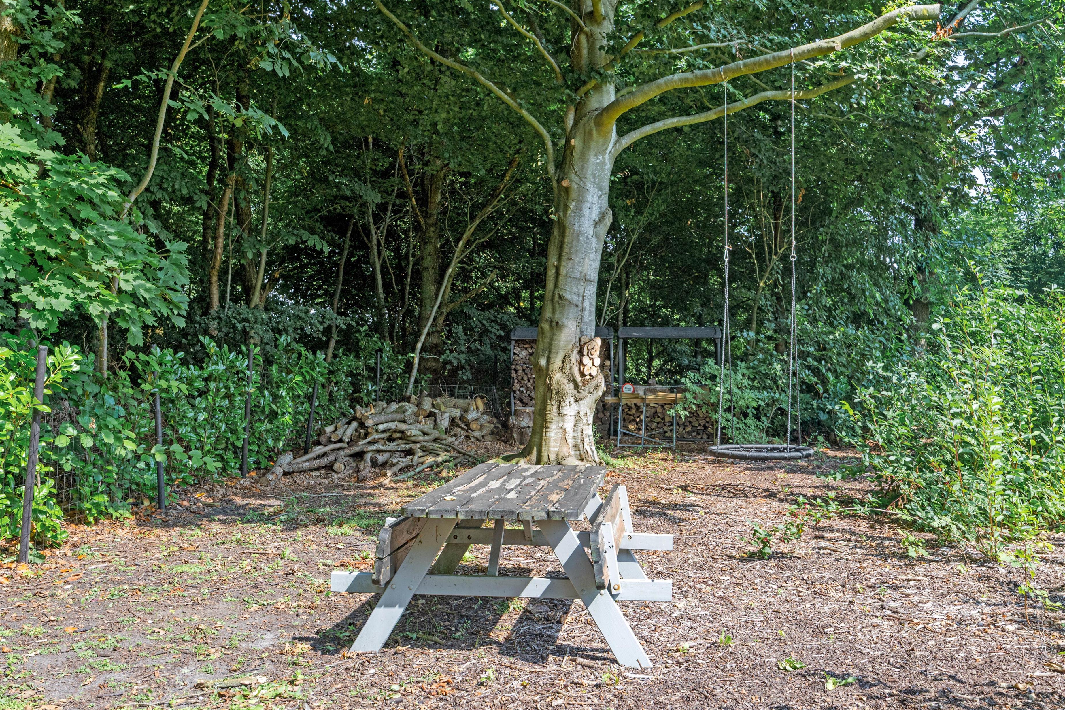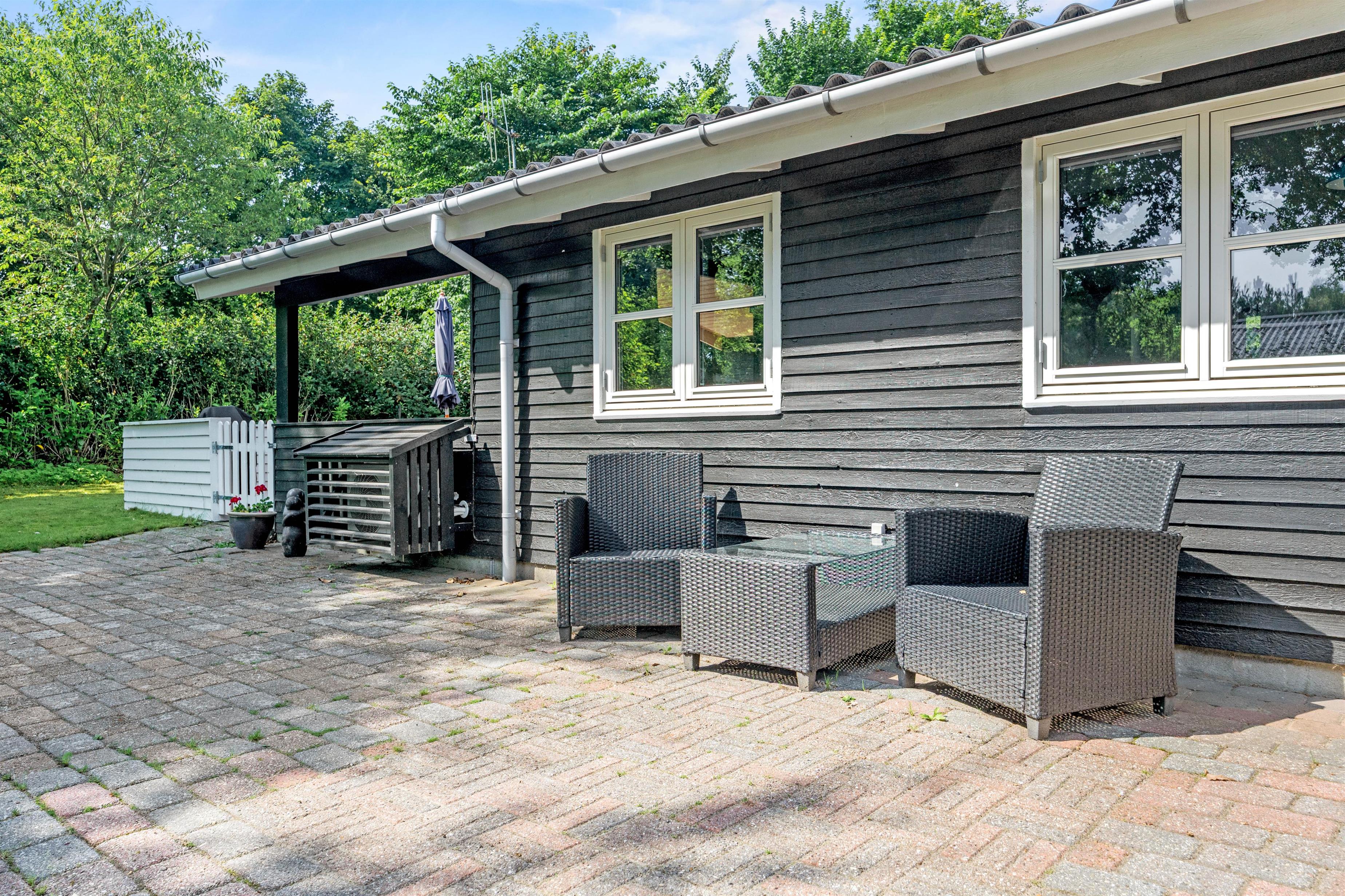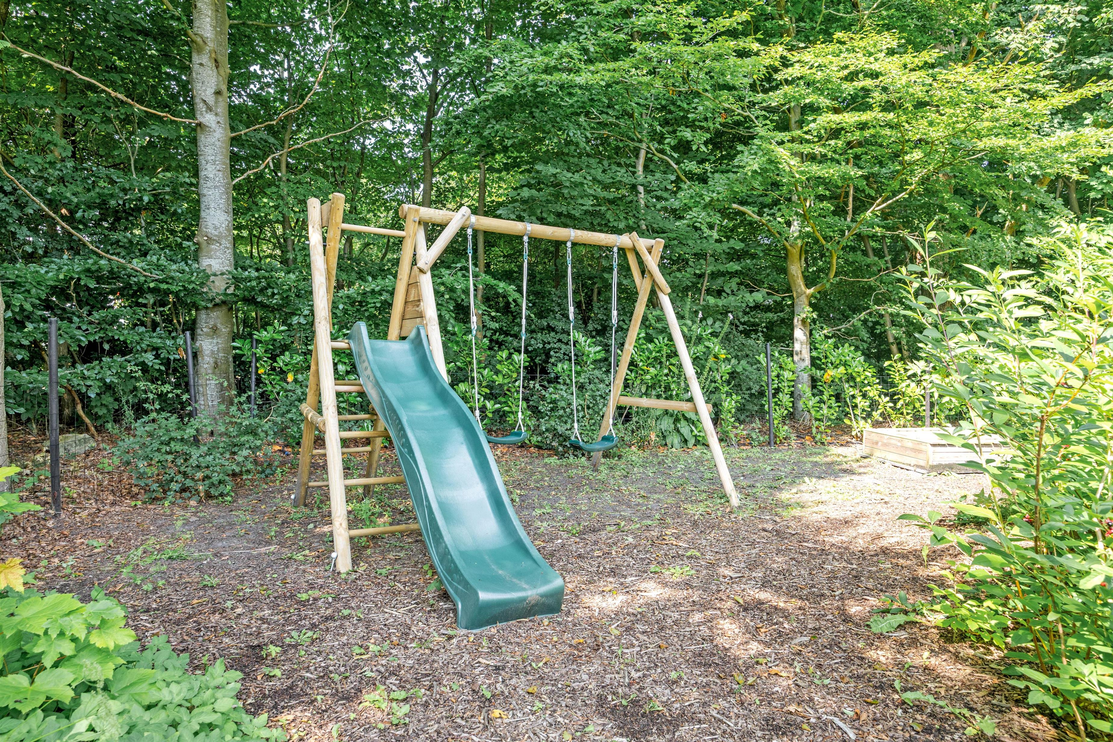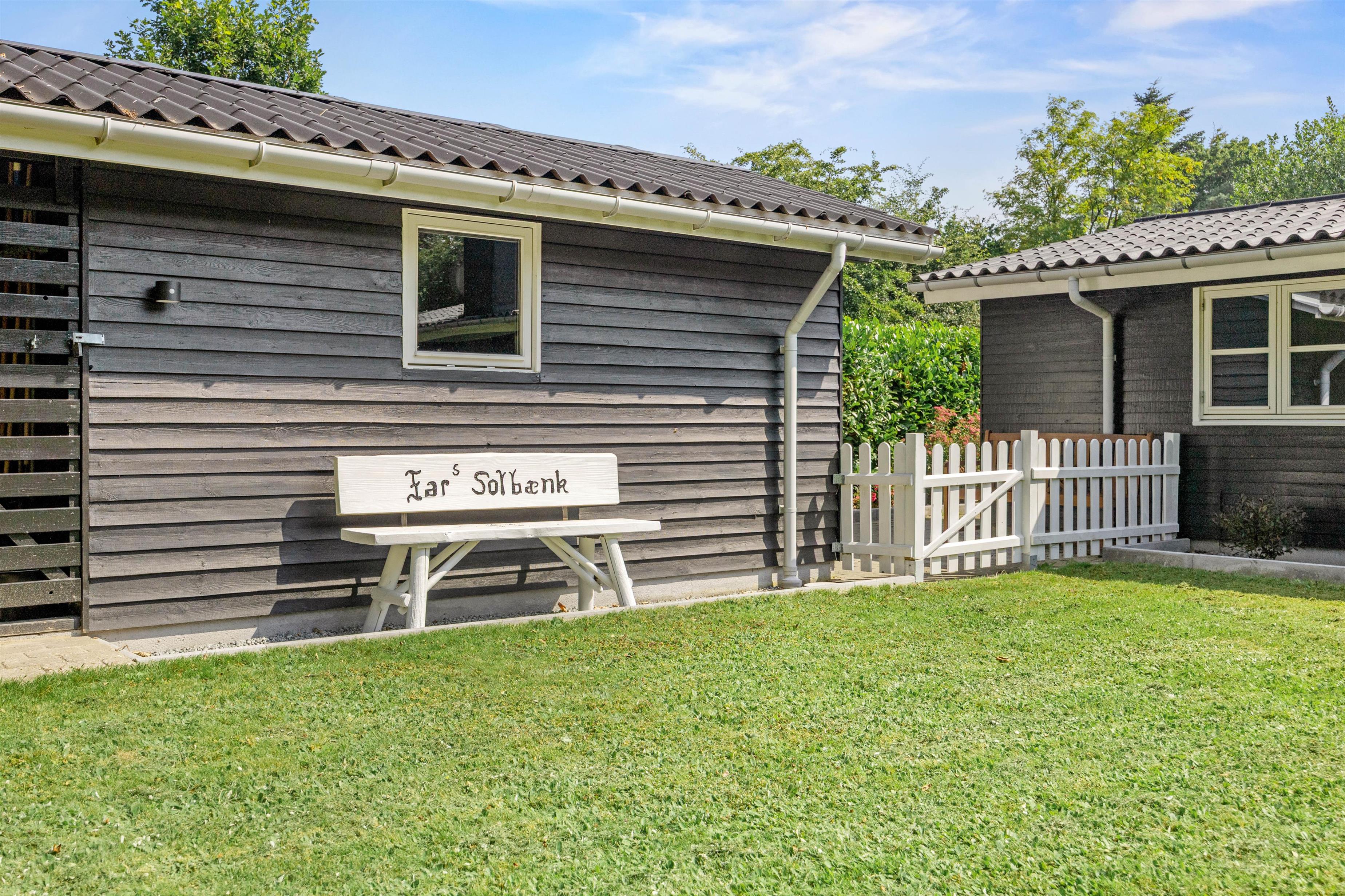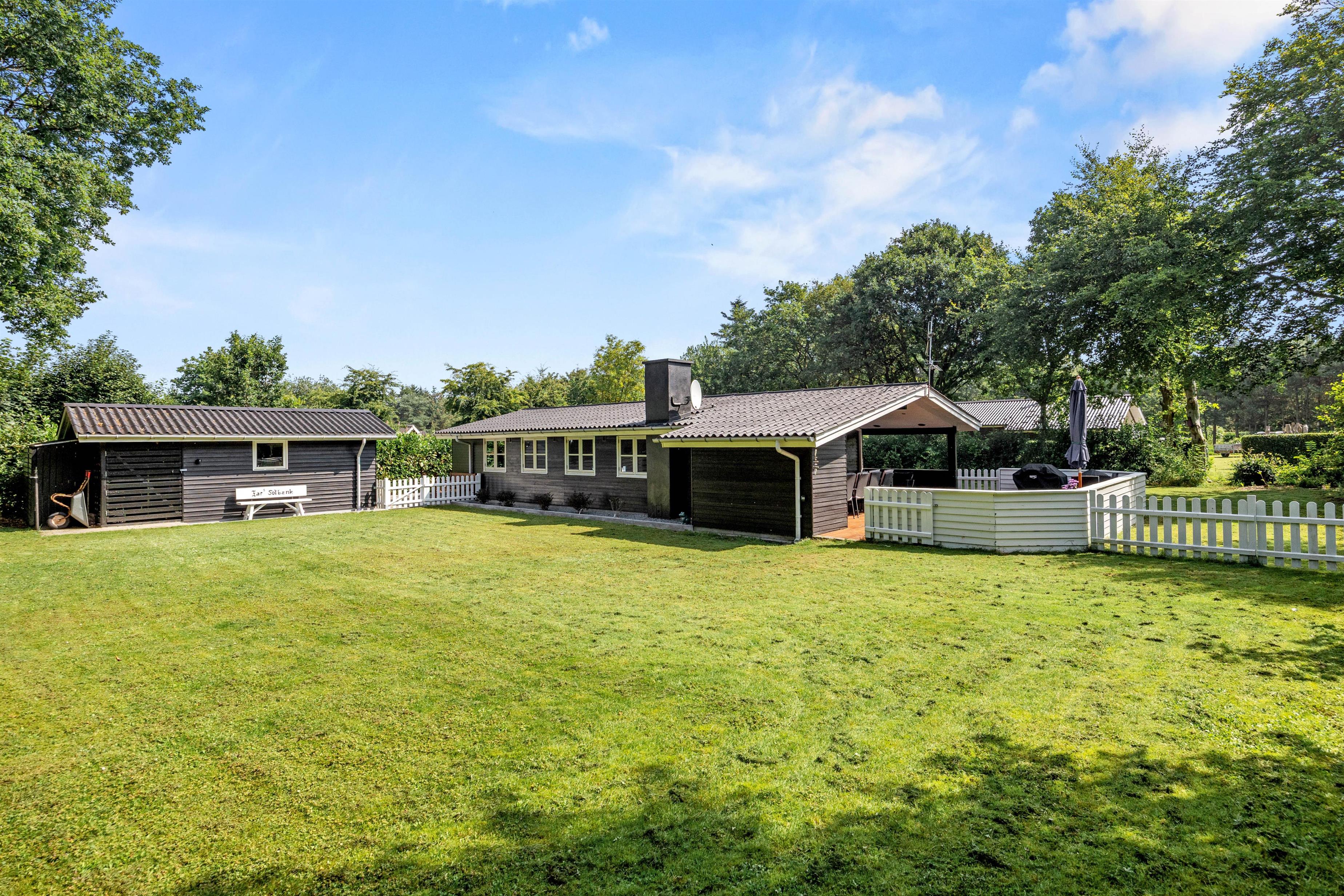 Fra terrassen kan I træde ud på den store plæne, som er perfekt til spil og leg. Hele ejendommen er indhegnet, så både store og små kan færdes frit og sikkert. Børnene vil kunne bruge mange timer på havens gynge eller have det sjovt i sandkassen. Fra terrassen er der adgang til et mindre depotrum.