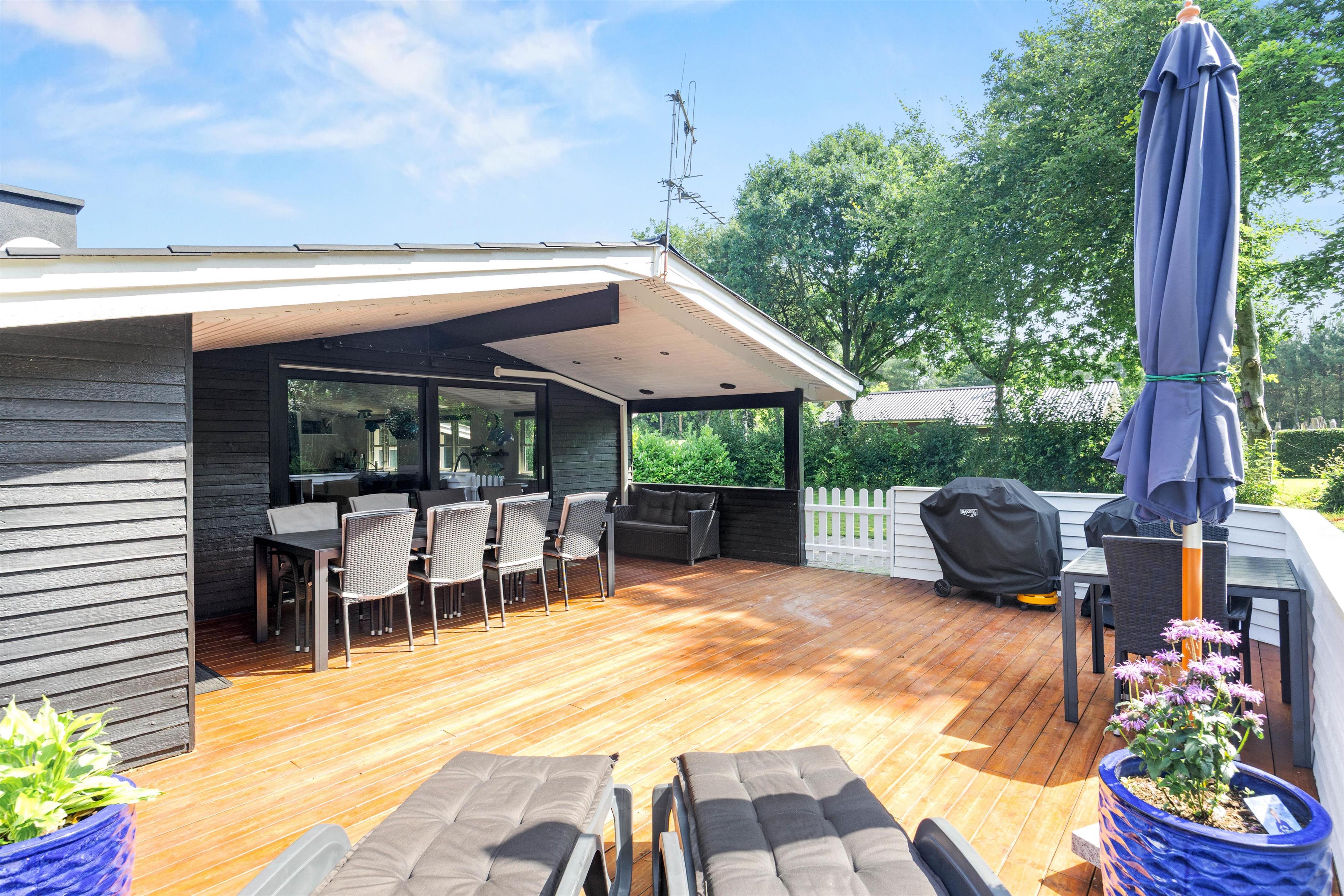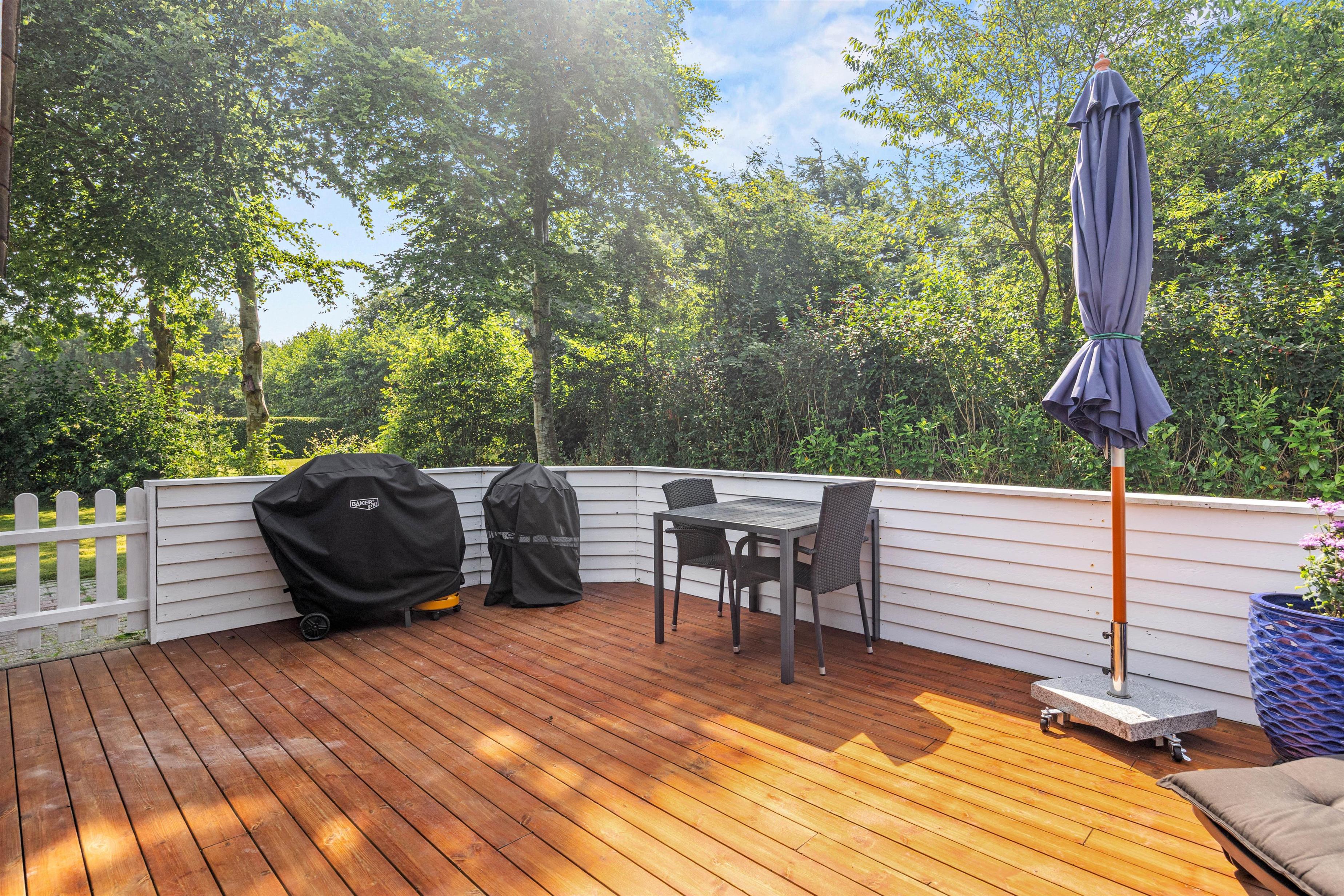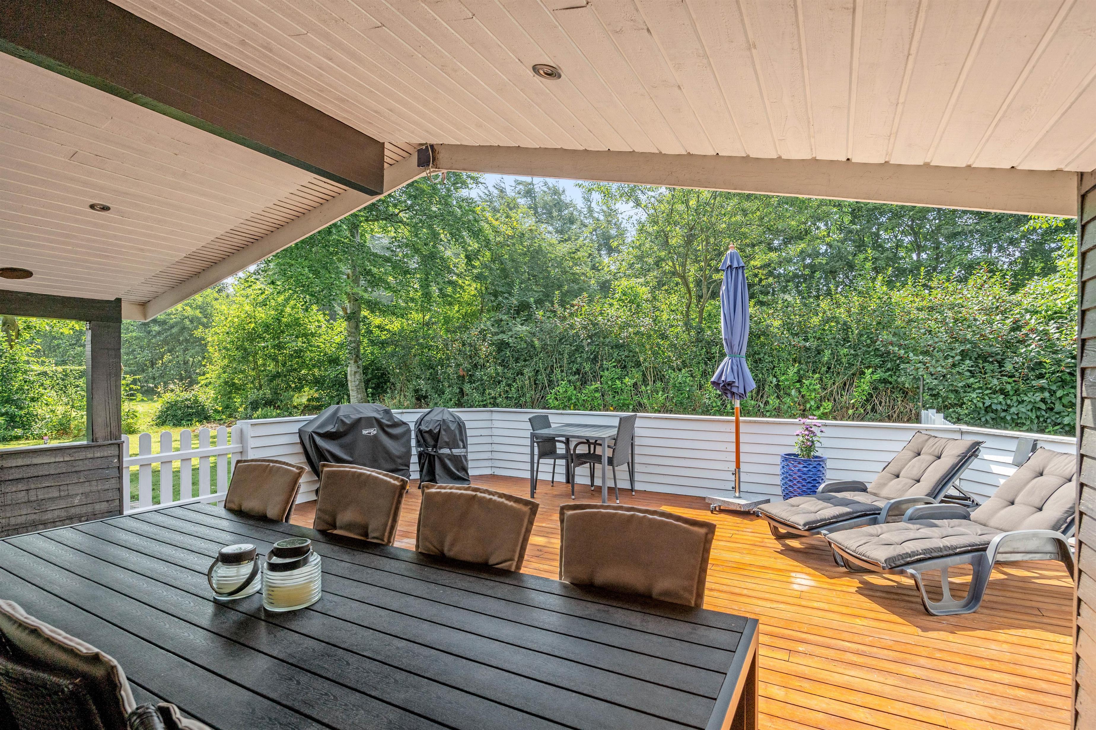 Fra stuen har I direkte adgang til en lukket og overdækket terrasse, hvor I kan nyde udendørslivet i al slags vejr. Her er det oplagt at samle venner og familie omkring grillen for hyggelige måltider. Der er god plads til, at børnene og jeres firbenede ven kan udforske terrassen i sikkerhed.