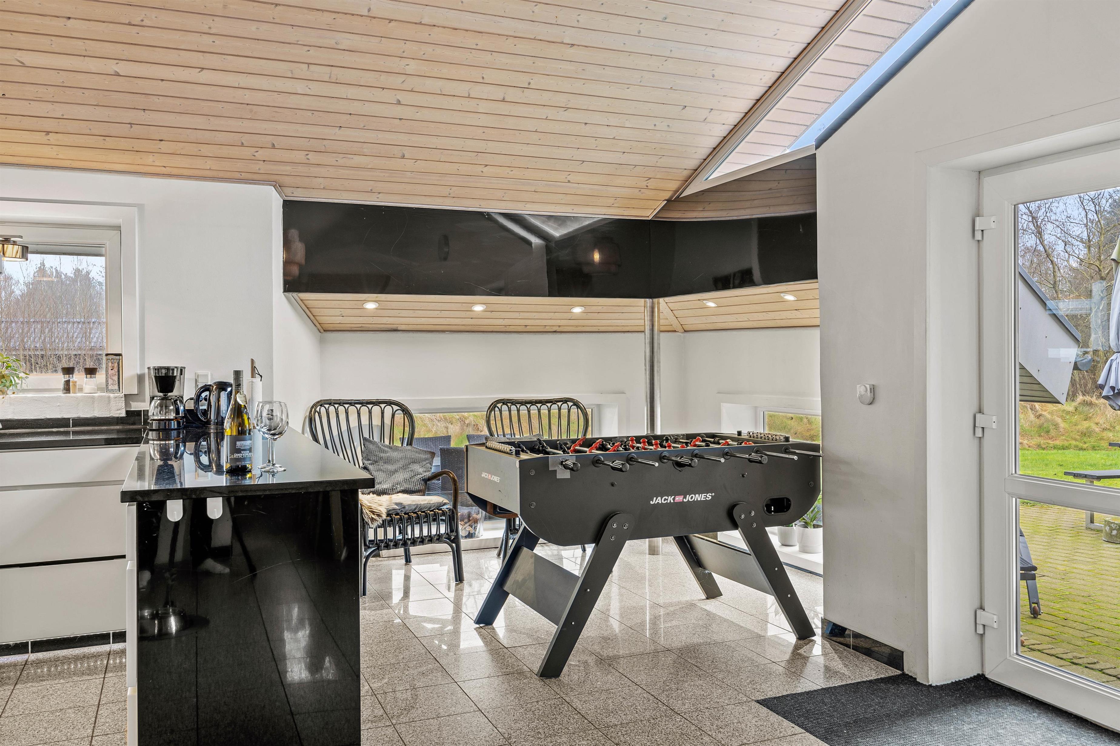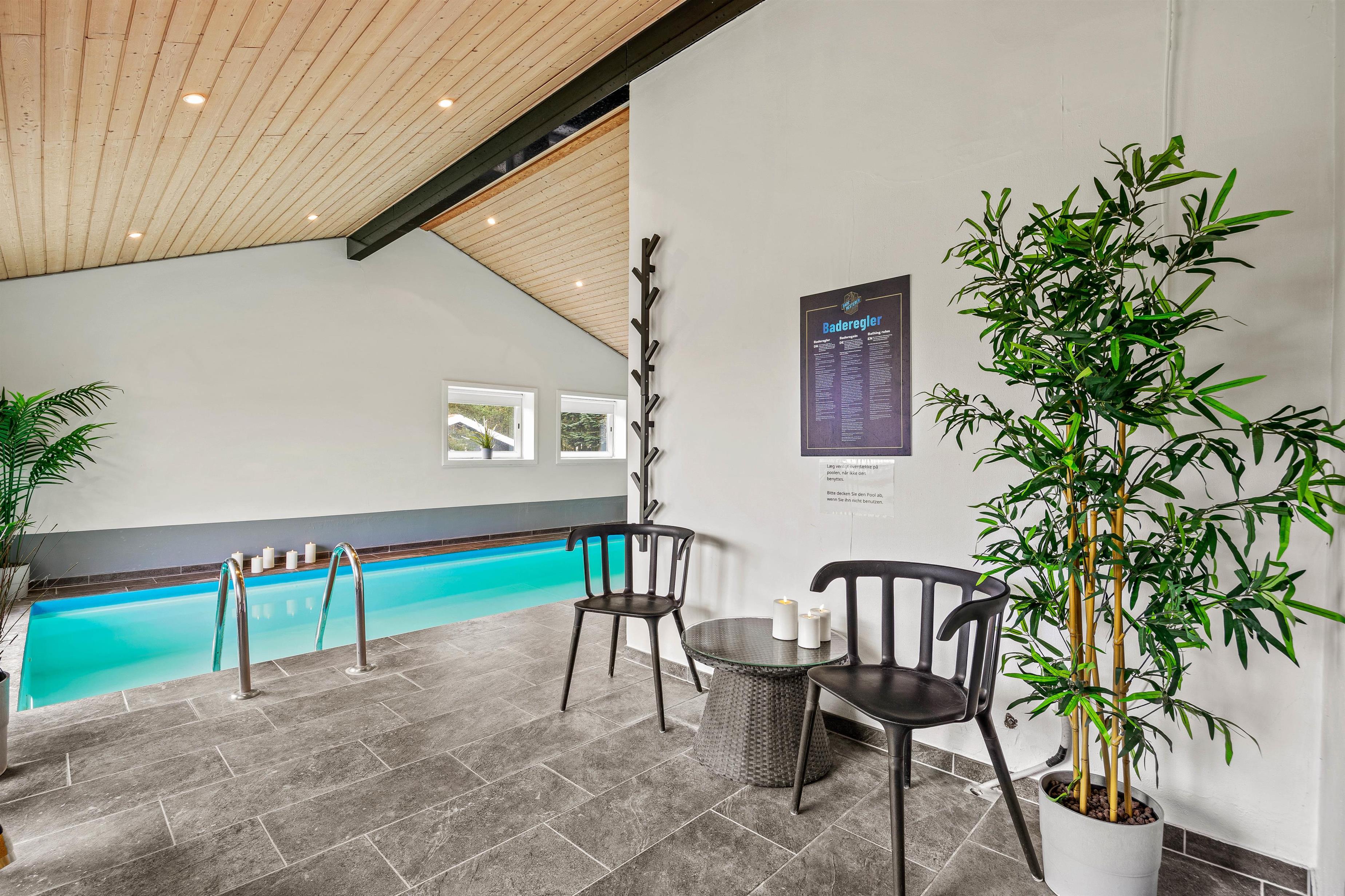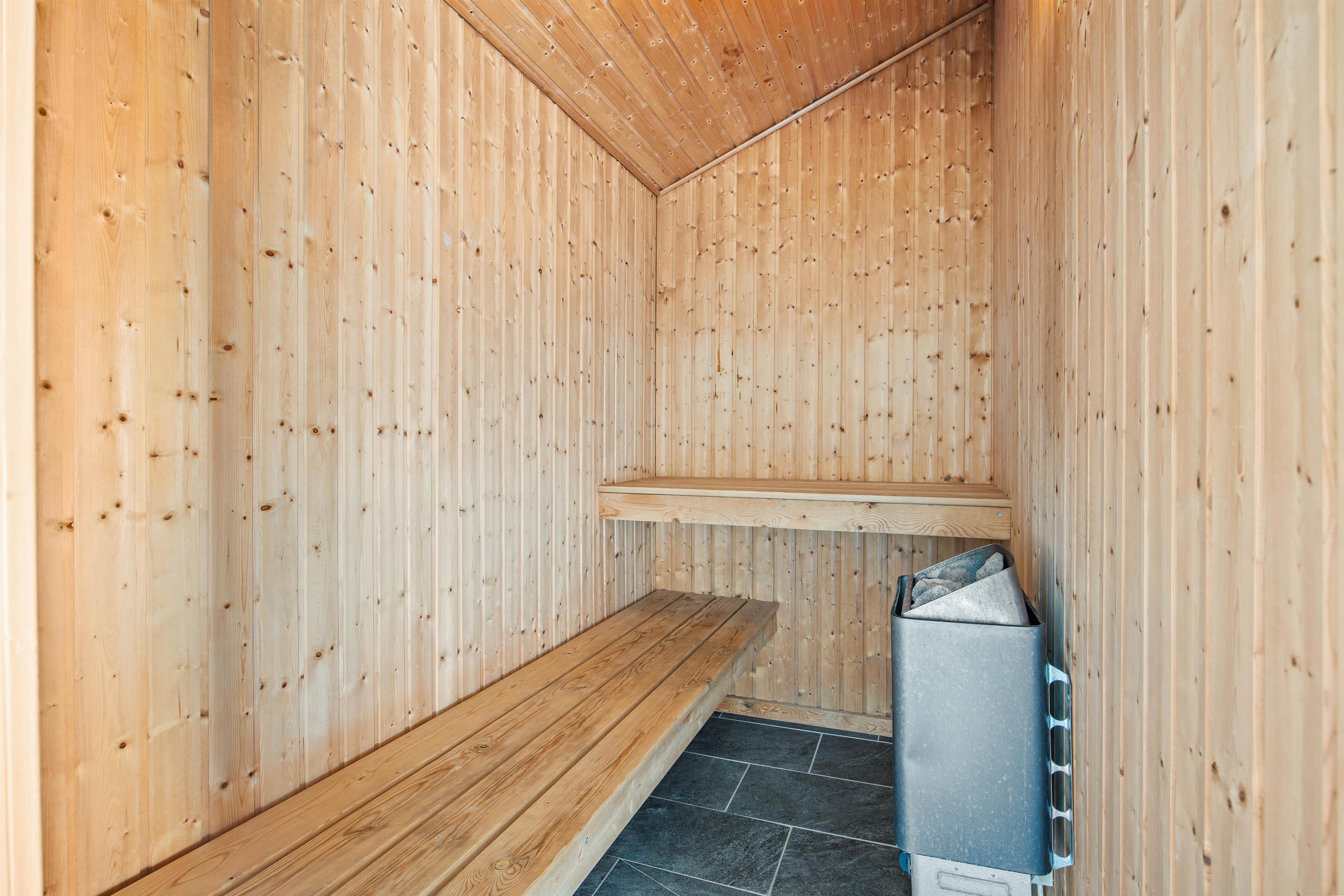 Bevæger man sig videre ind i de bløde sofamøbler, omfavnes man af den varme brændeovn der især på kølige aftener indbyder til hygge over en kop varm kakao og et spil kort. I har også mulighed for at forkæle jer selv i husets sauna efter en dag fuld af oplevelser. Hvis I trænger til at få pulsen op, kan I tage en forfriskende svømmetur i den indendørs pool, der virkelig sætter prikken over i’et i jeres ferieoplevelse, eller tage et spil billard i det store aktivitetsrum. Poolen opvarmes af en luft til vand varmepump, som både sikrer en lækker temperatur på 28-30 grader og er energivenlig så I sparer penge.
