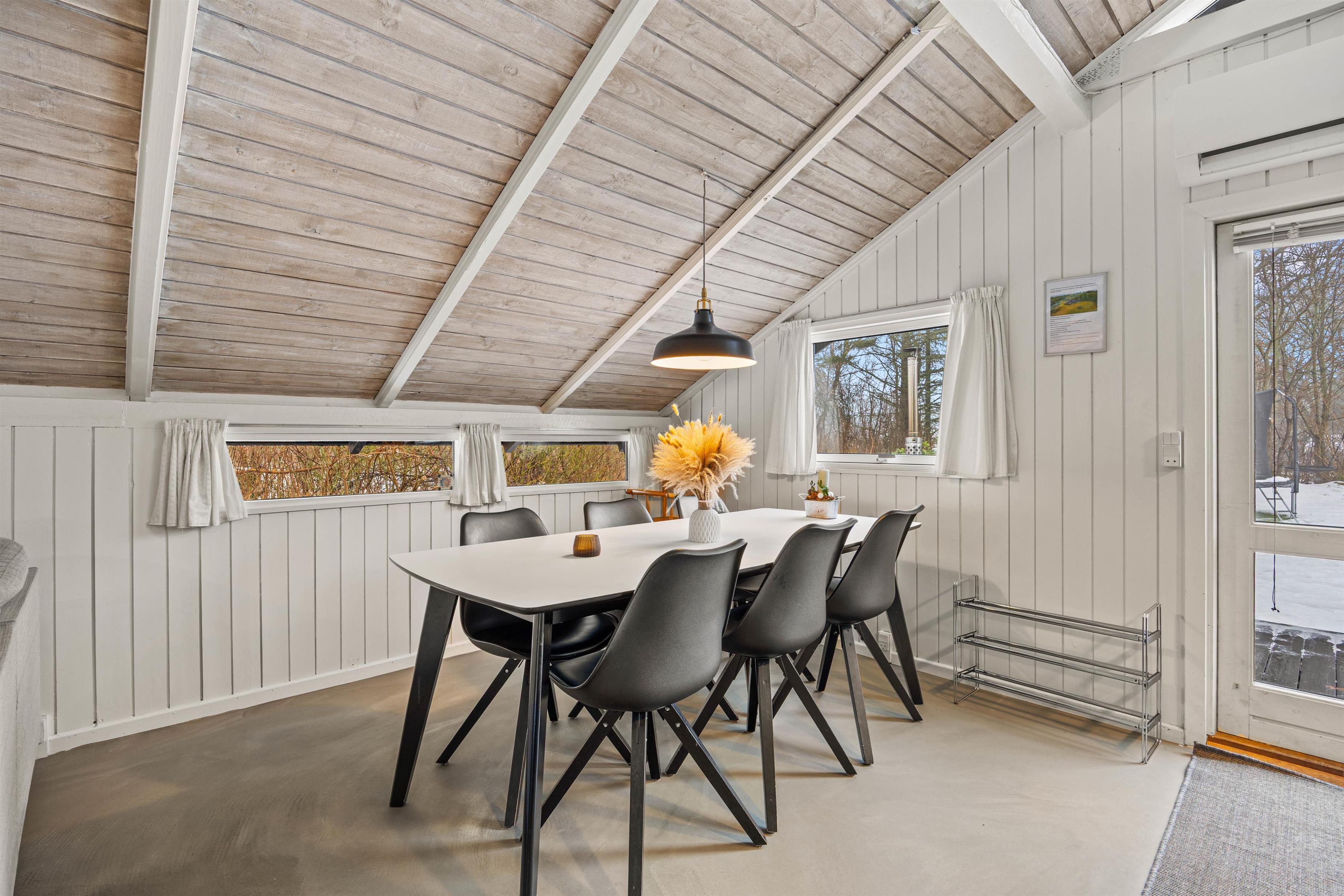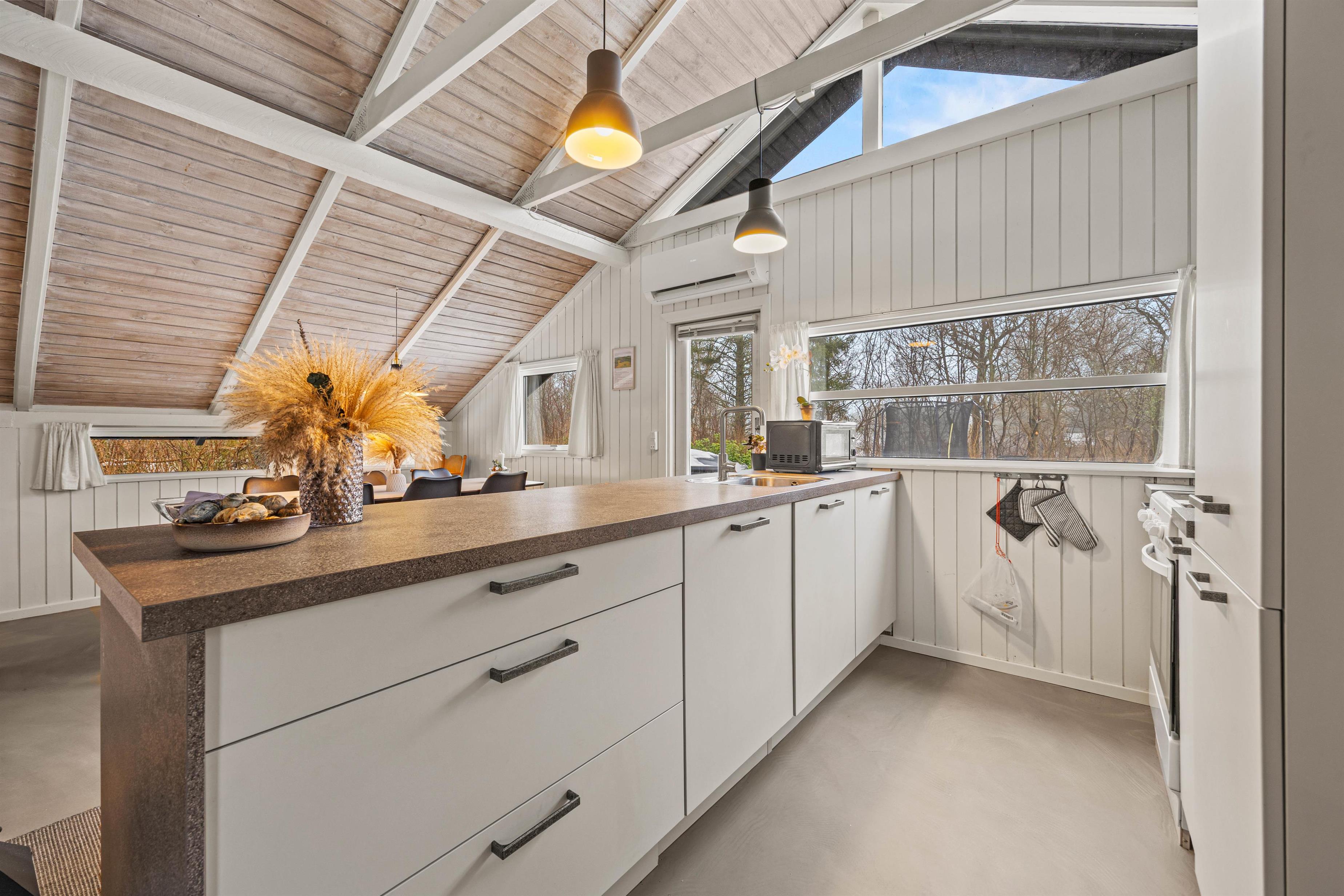 I feriehuset venter en hyggelig atmosfære, som fuldendes af pejsen i stuen. Den smukt indrettede stue er åben og skaber en indbydende stemning, der indbyder til at være sammen. Gør det jer behageligt i sofaen, se en film eller nyd knitren fra brændeovnen med et glas vin. Det velholdte, åbne køkken har også en opvaskemaskine, der sørger for, at opvasken hurtigt bliver klaret.