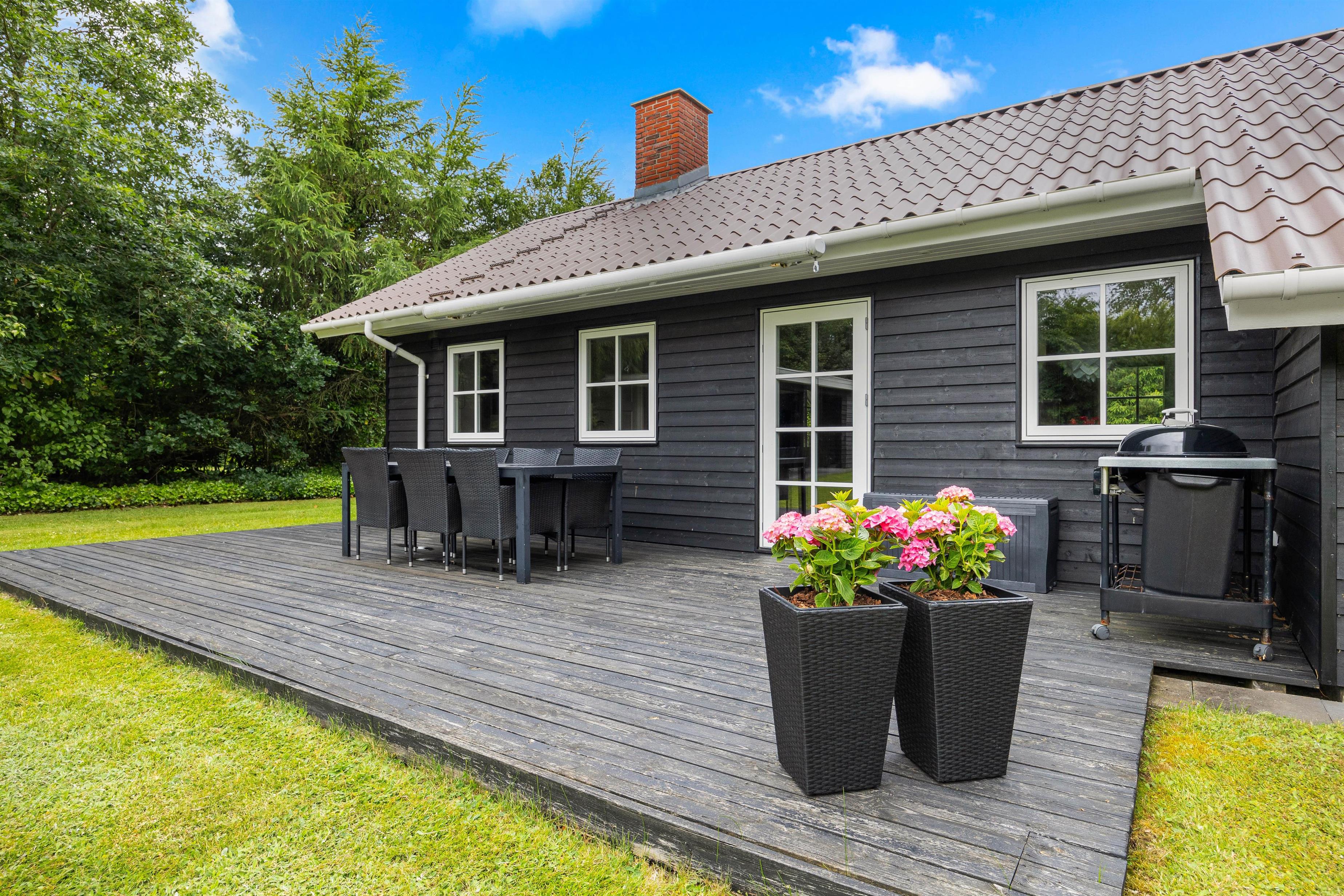 Udenfor står en åben terrasse klar til at byde jer velkommen til en aften med mad under åben himmel. Her finder I både havemøbler og en grill, der inviterer til hyggelige BBQ-aftener og lange sommermåltider med familien eller vennerne. Terrassen er det perfekte sted at starte dagen med en kop kaffe, mens I nyder morgensolen og naturens ro. Når aftenen falder på, kan I tænde op i grillen og tilberede en lækker middag, som I kan nyde under den åbne himmel.