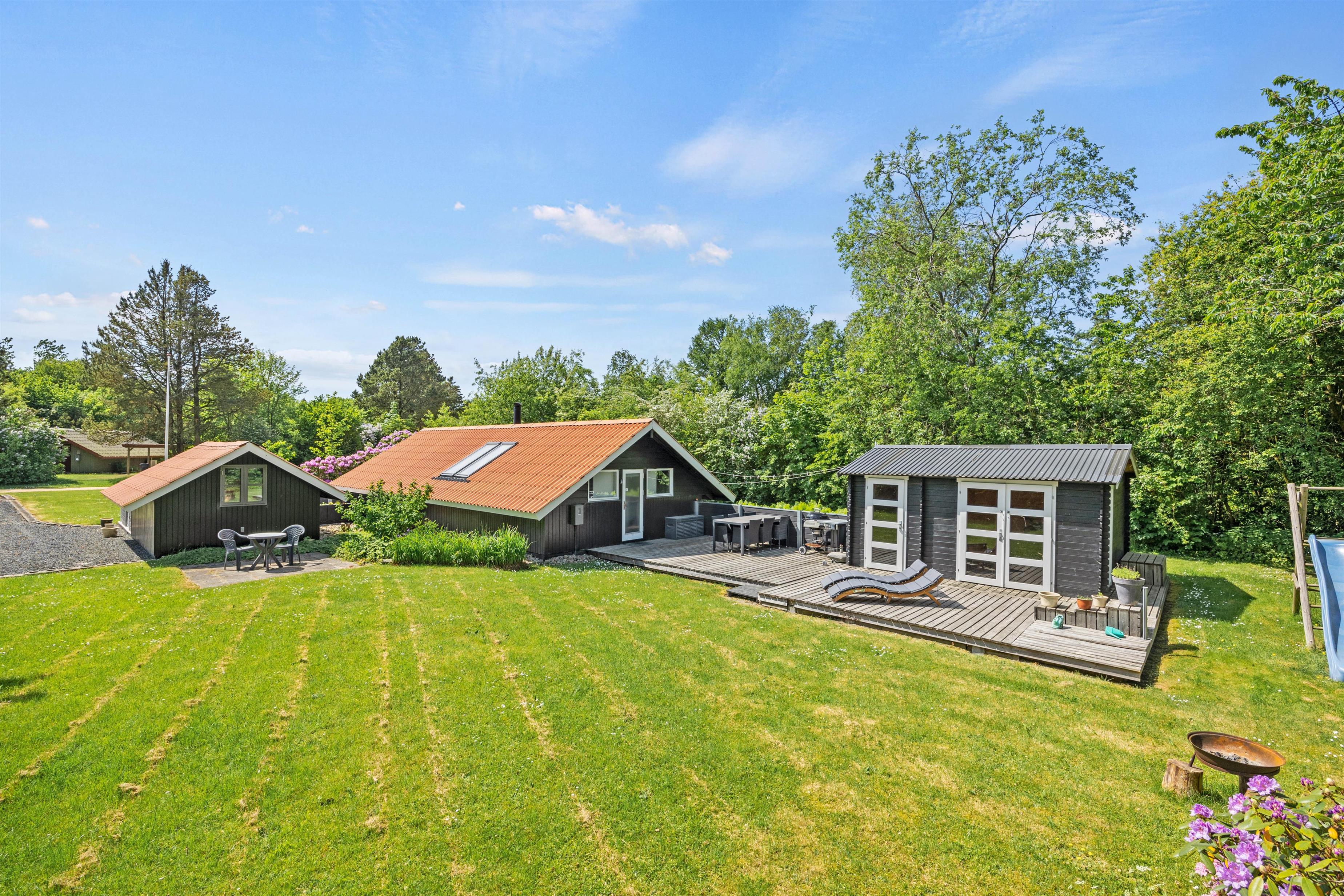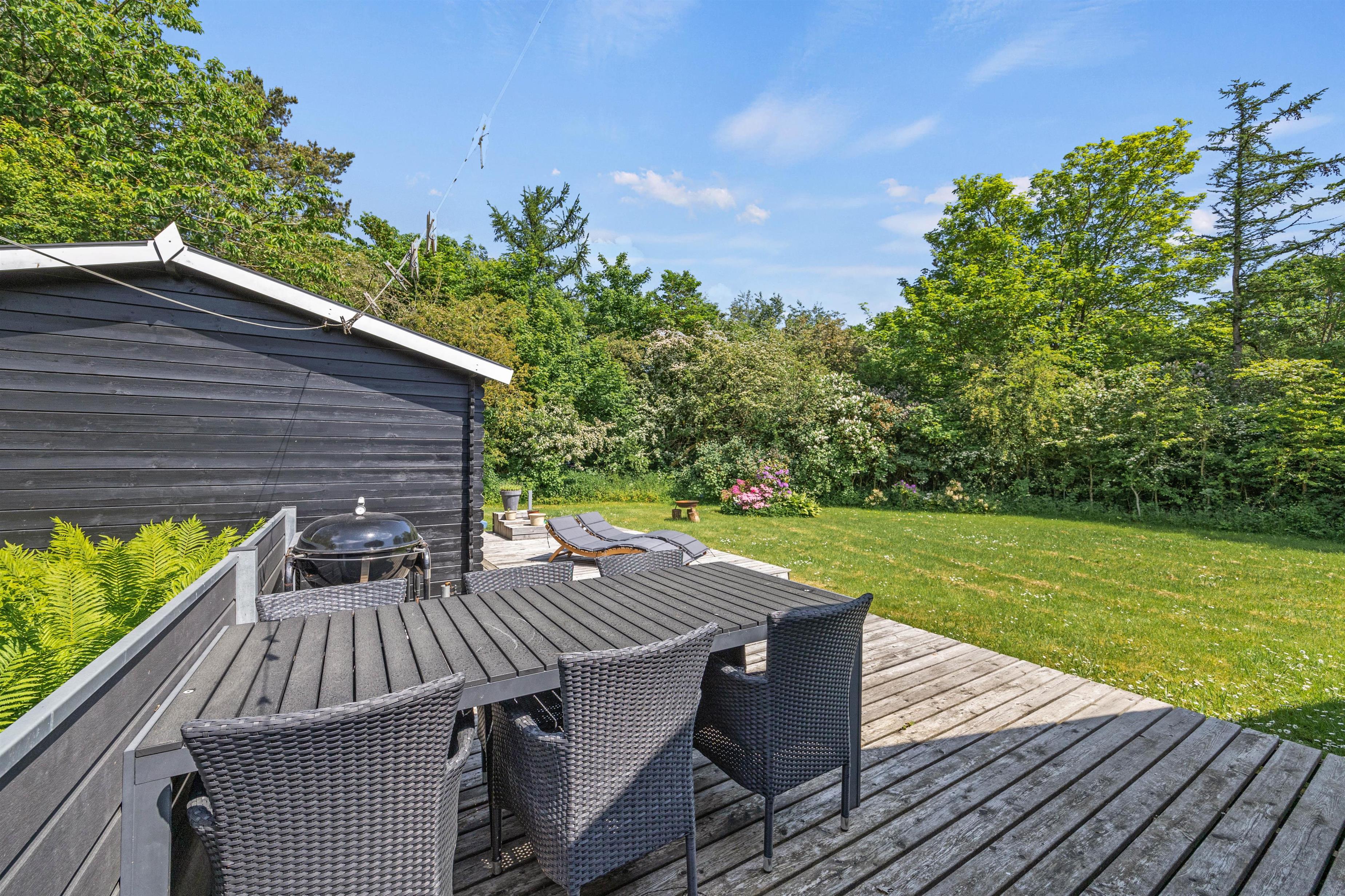 Sommerhusets udemiljø er designet til at maksimere udendørslivet og skabe en afslappende atmosfære. Den store afskærmede terrasse er perfekt til hyggelige middage under åben himmel, mens den overdækkede del sikrer, at I kan nyde jeres måltider uanset vejret.