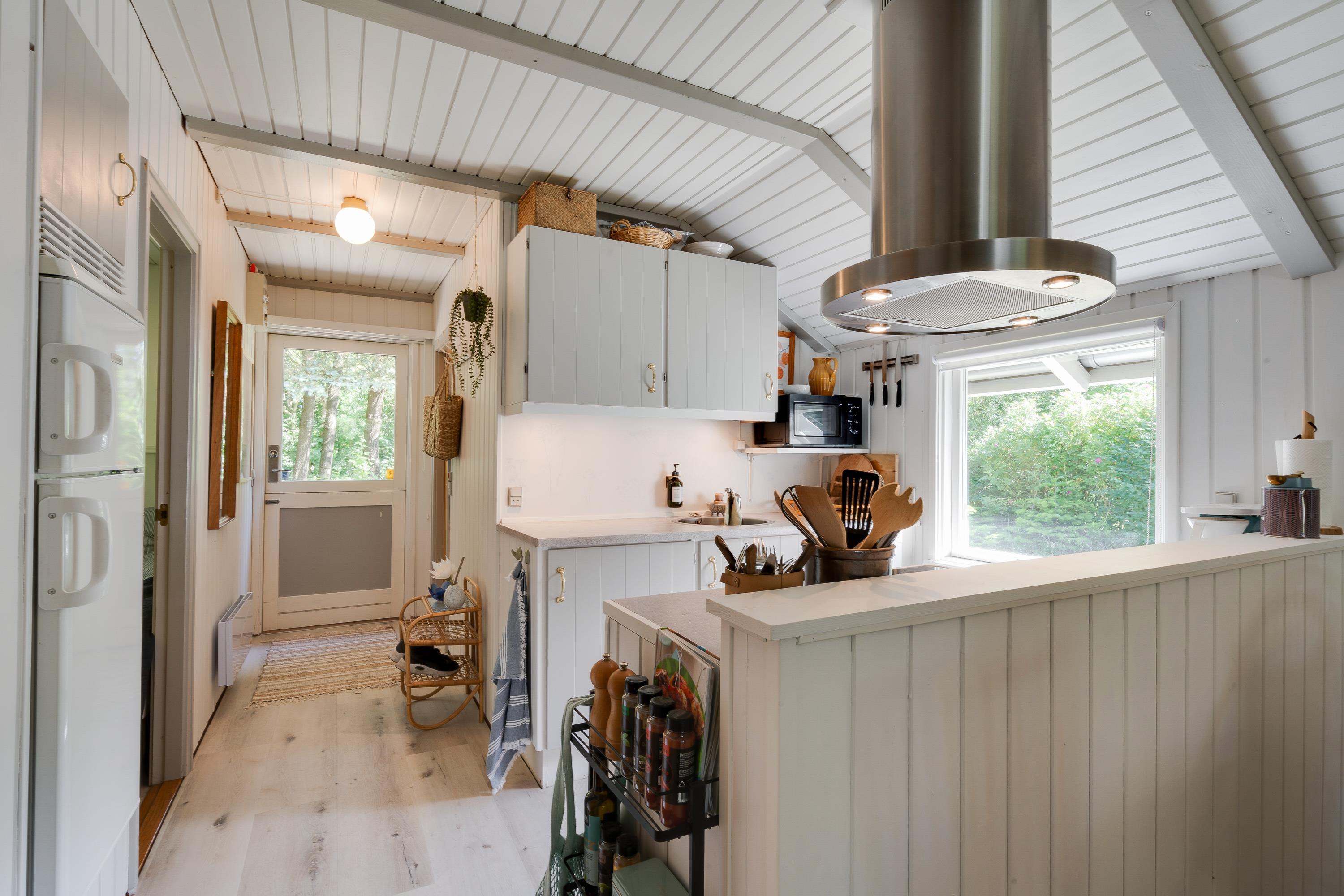 Når I træder ind, bliver I mødt af lyse vægge og et naturligt lys, der fylder rummet med en indbydende atmosfære. Køkkenet fungerer som et samlingspunkt til lange aftener med madlavning og gode samtaler, og efter måltidet letter opvaskemaskinen arbejdet med oprydning.