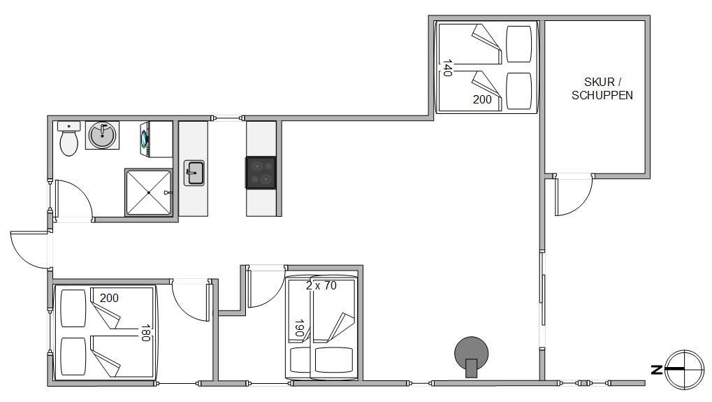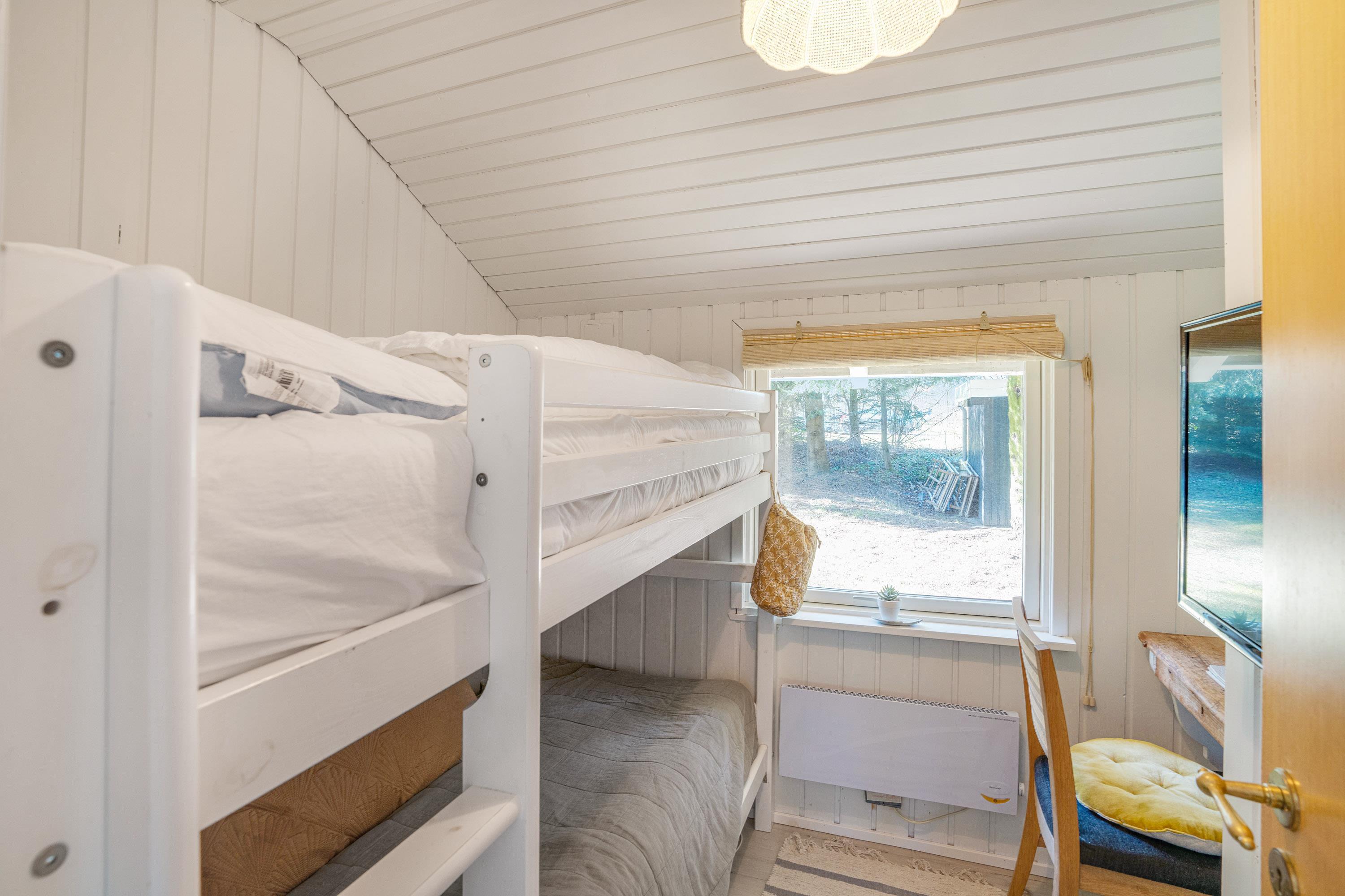 Sommerhuset tilbyder flere sovepladser, fordelt på 2 soveværelser og 1 hyggelig alkove i stuen. Det lille, men funktionelle badeværelse er udstyret med vaskemaskine, hvilket gør det praktisk til længere ophold.